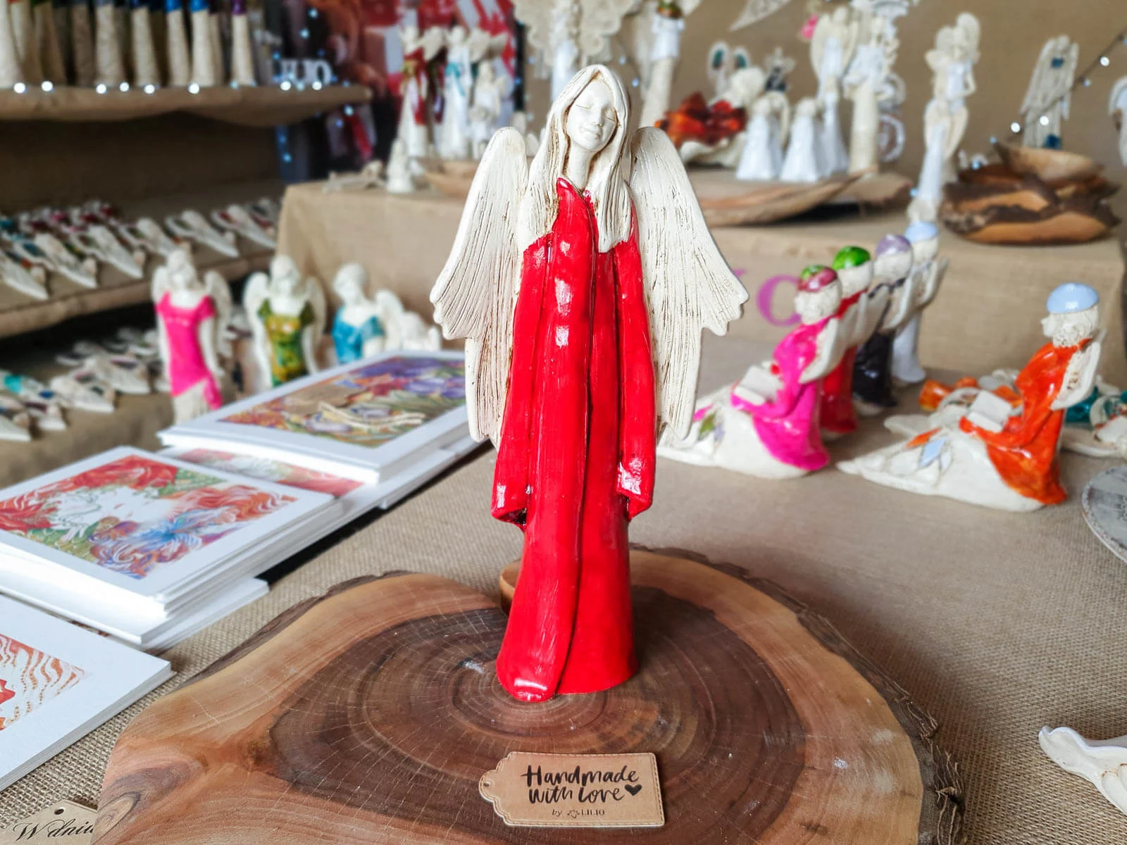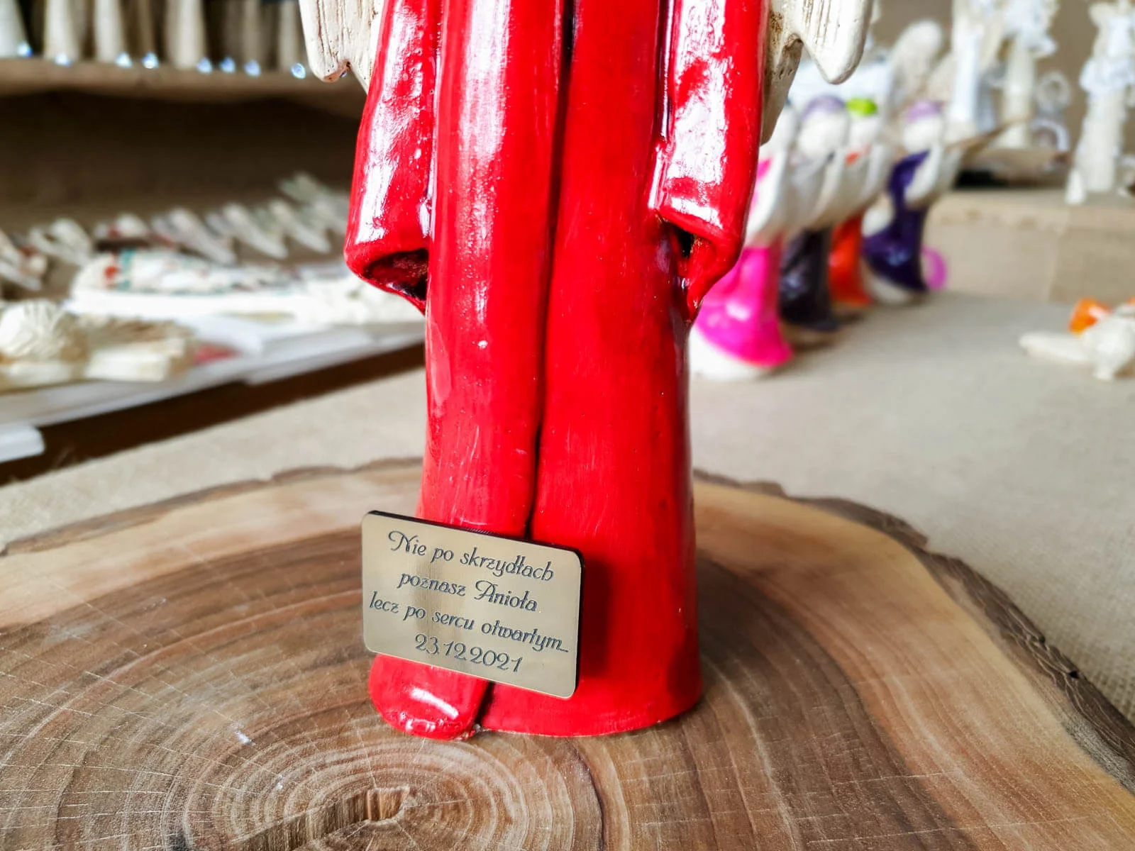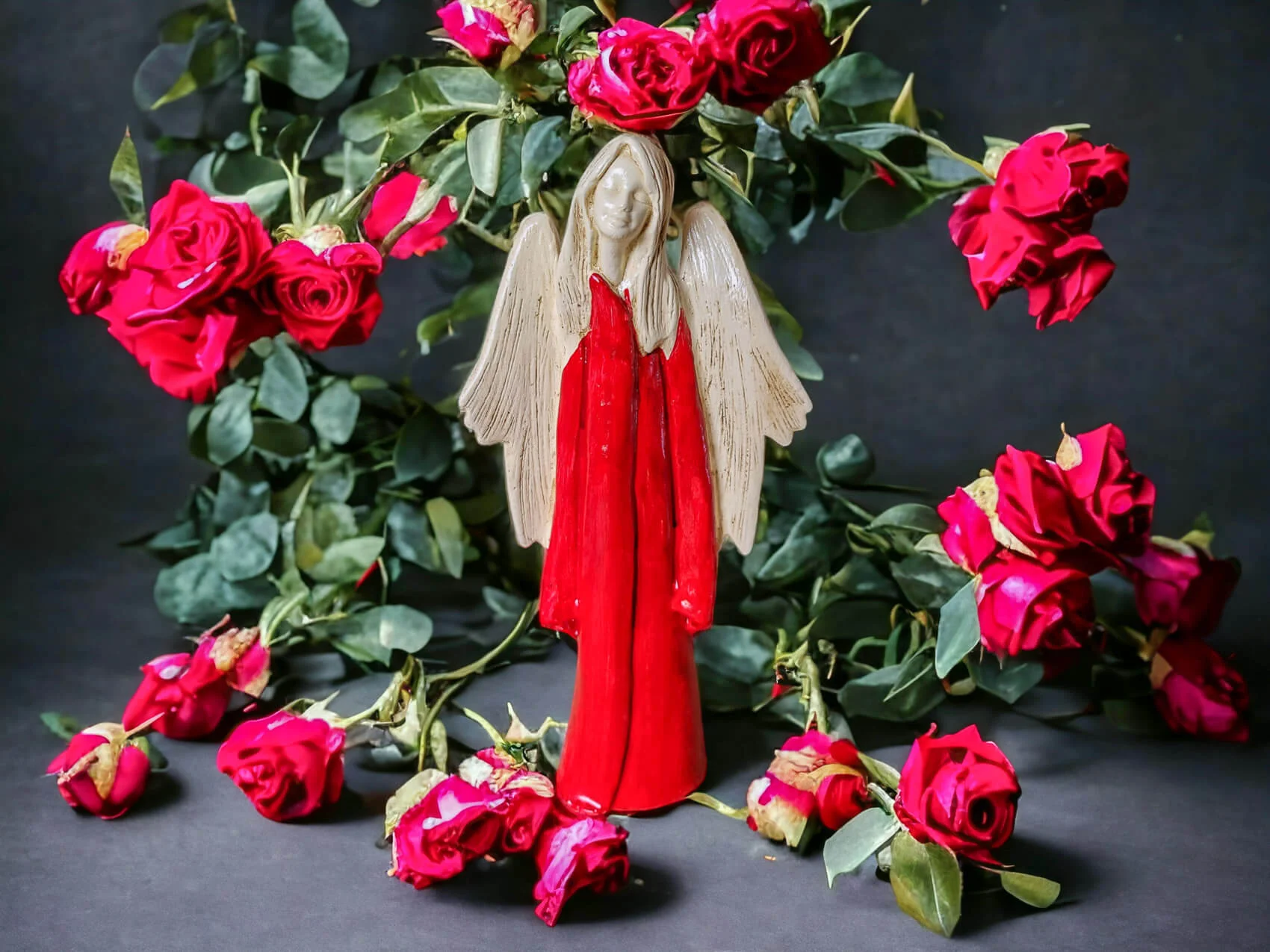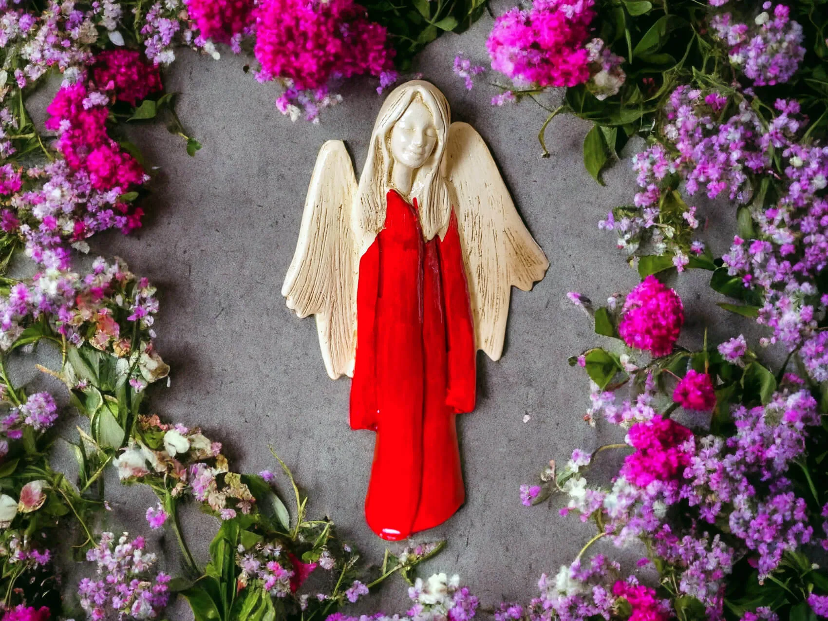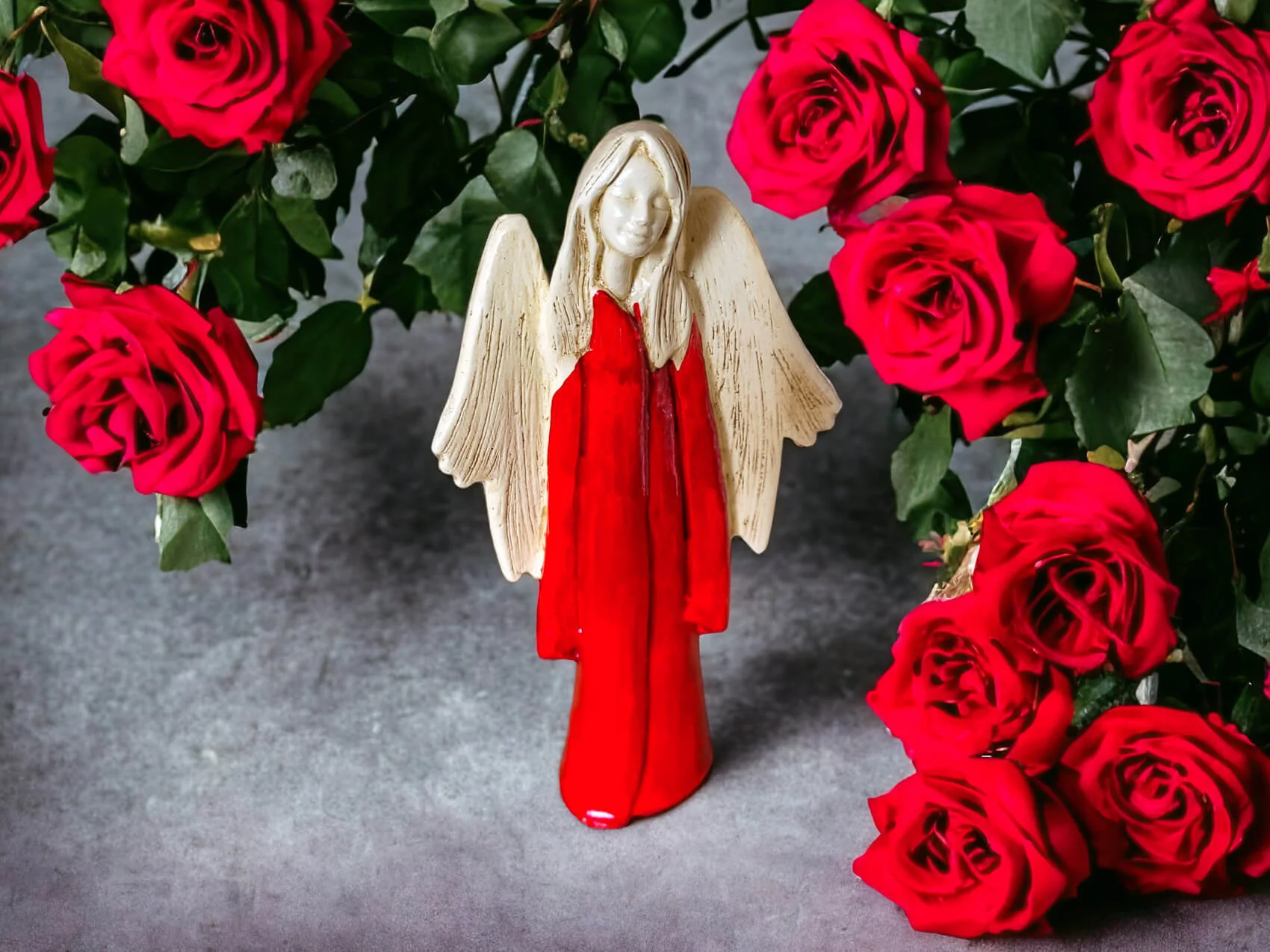 Anioł Julia to ręcznie wykonana figurka. Julia jest delikatną dziewczyną o czystym sercu. Ubrana jest w czerwoną zwiewną szatę. Czerwień od najdawniejszych lat była uznawana za kolor życia. Kolor czerwony jest symbolem miłości. Julia zatracona jest w miłości, potrafi uleczyć każde złamane serce. Z gracją prezentuje rozłożyste skrzydła. Idealnie nadaje się na prezent dla kobiet. Świetnie sprawdzi się jako ozdoba w klasycznym jak i nowoczesnym wnętrzu.