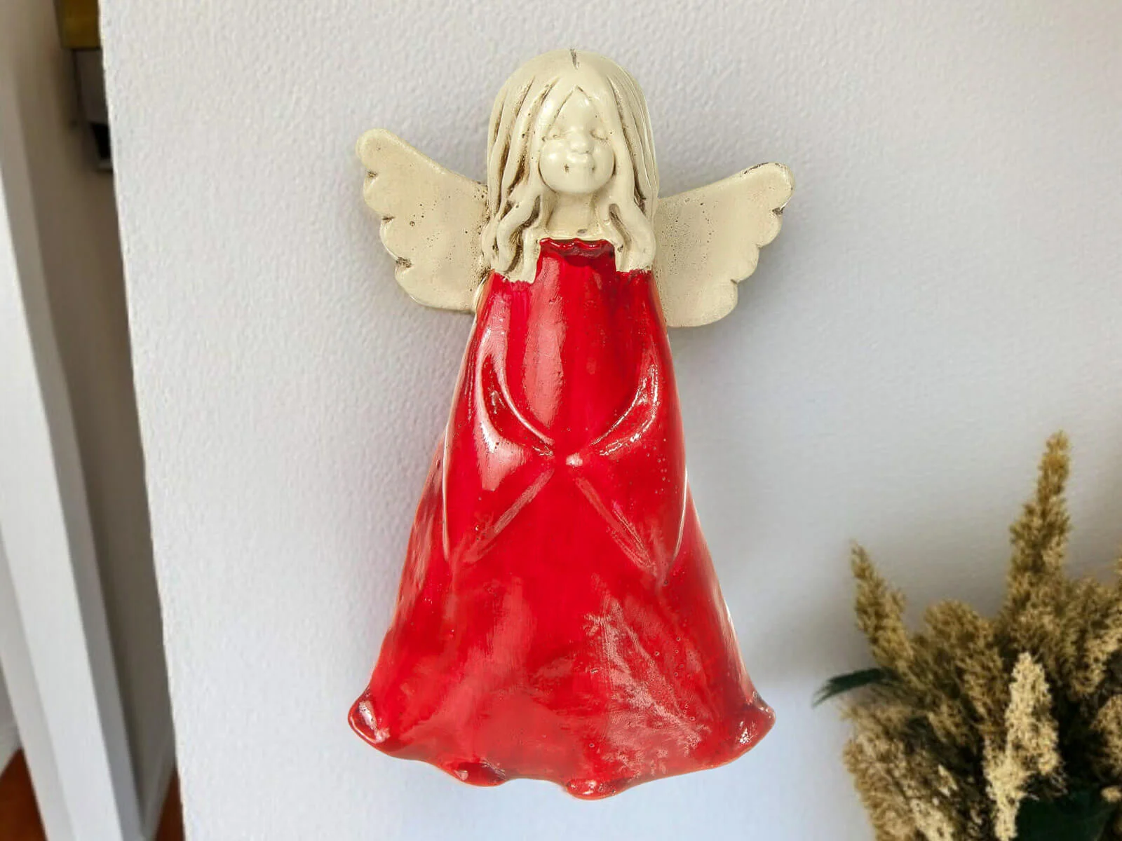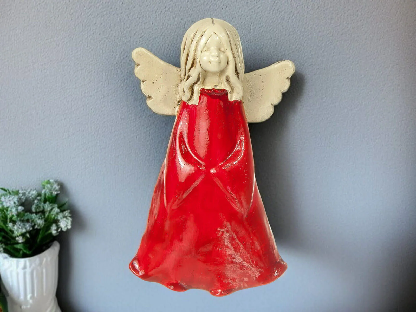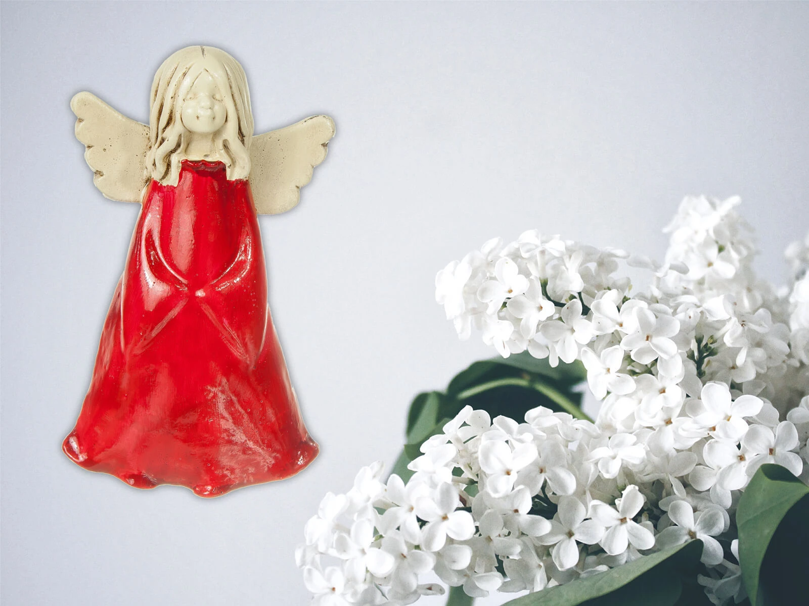 Anioł Monica w kolorze czerwonym to ręcznie wykonana figurka do zawieszenia na ścianę. Monica jest uroczą dziewczynką, która kocha swoją rodzinę. Jest pełna ciepła, uroku. Swoją pogodą ducha obdarza każdego spotkanego na drodze przechodnia. Jest ubrana w czerwoną sukienkę. Kolor czerwony symbolizuje miłość i radości. Anieliczka idealnie sprawdzi się jako prezent pierwszokomunijny dla dziewczynki.