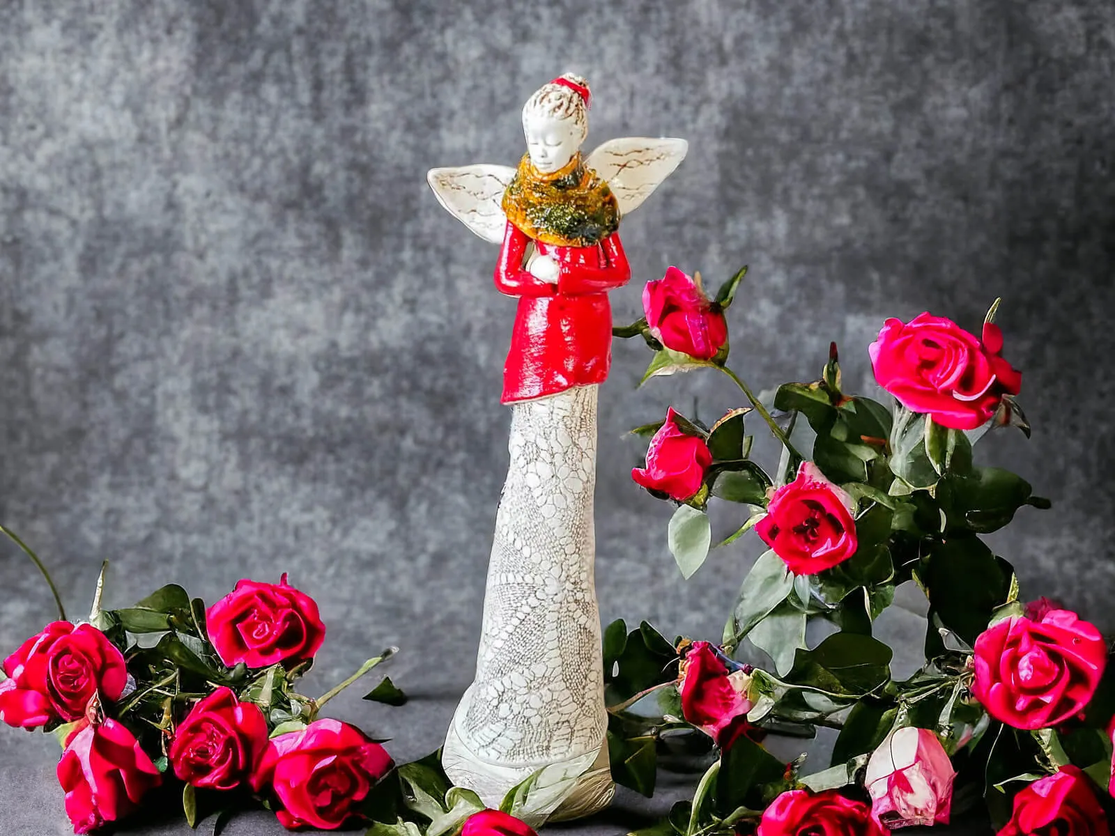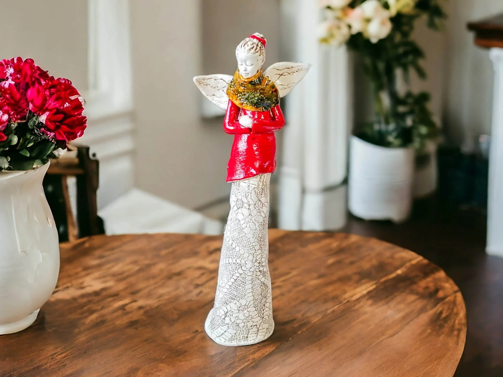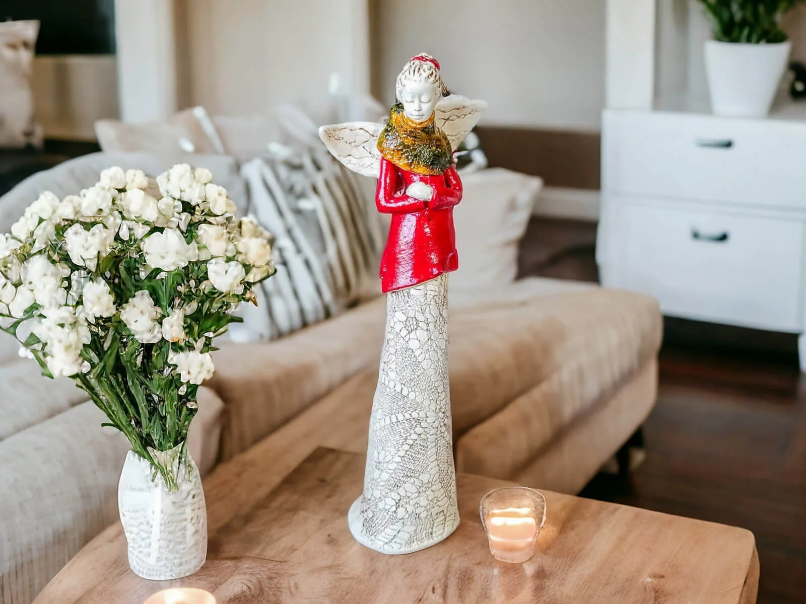 Anioł Catherine to kobieta pełna wdzięku i klasy. Spod czerwonego płaszcza, wyłania się długa suknia, uwydatniająca jej smukłą sylwetkę. Co więcej, urok Catherine kryje się w jej nieśmiałości - spuszczony wzrok świadczy o zawstydzeniu spojrzeniami, które ściąga na siebie anielskim blaskiem. Figura pięknie zaprezentuje się w salonie i z pewnością wywoła uśmiechy na twarzach Twoich gości.