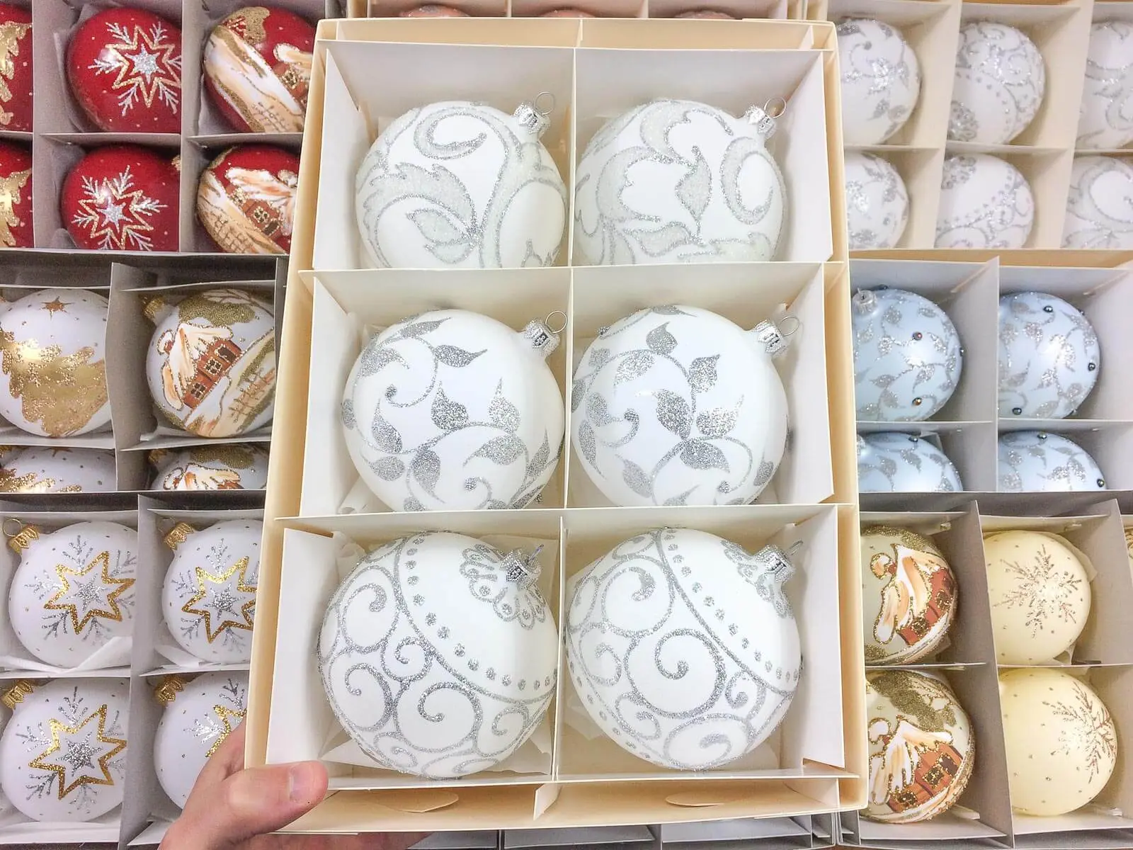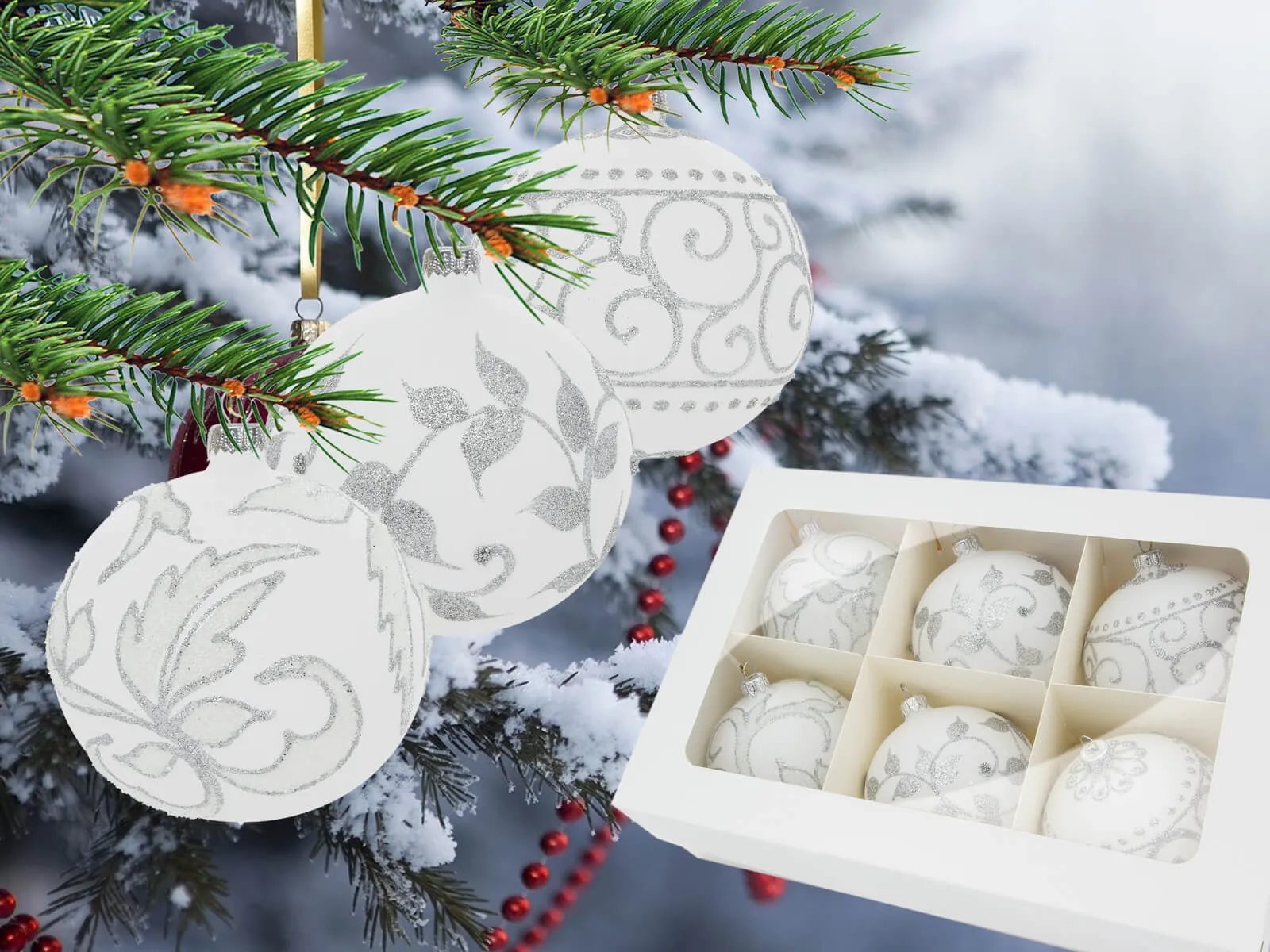 Biała kreda stanowi delikatne tło dla srebrnych zdobień, które ozdabiają listki, esy i mrożone zawijasy na powierzchni każdej z bombek. Srebrne detale, precyzyjnie ręcznie nanoszone, nadają bombkom wyjątkowego blasku, tworząc efektowny zestaw, który z pewnością przyciągnie uwagę i stworzy wyjątkowy klimat świąt Bożego Narodzenia.