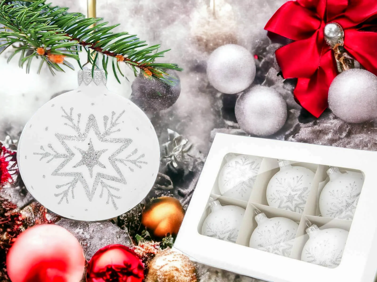 W komplecie znajduje się sześć identycznych bombek w formie gwiazdek, z których każda została ręcznie zdobiona srebrnym akcentem na białej kredzie. Srebrne zdobienia tworzą finezyjne wzory, które nadają bombkom subtelny i szlachetny wygląd. Biała kreda sprawia, że srebrne zdobienia błyszczą wyjątkowo intensywnie, tworząc piękną harmonię kontrastu.