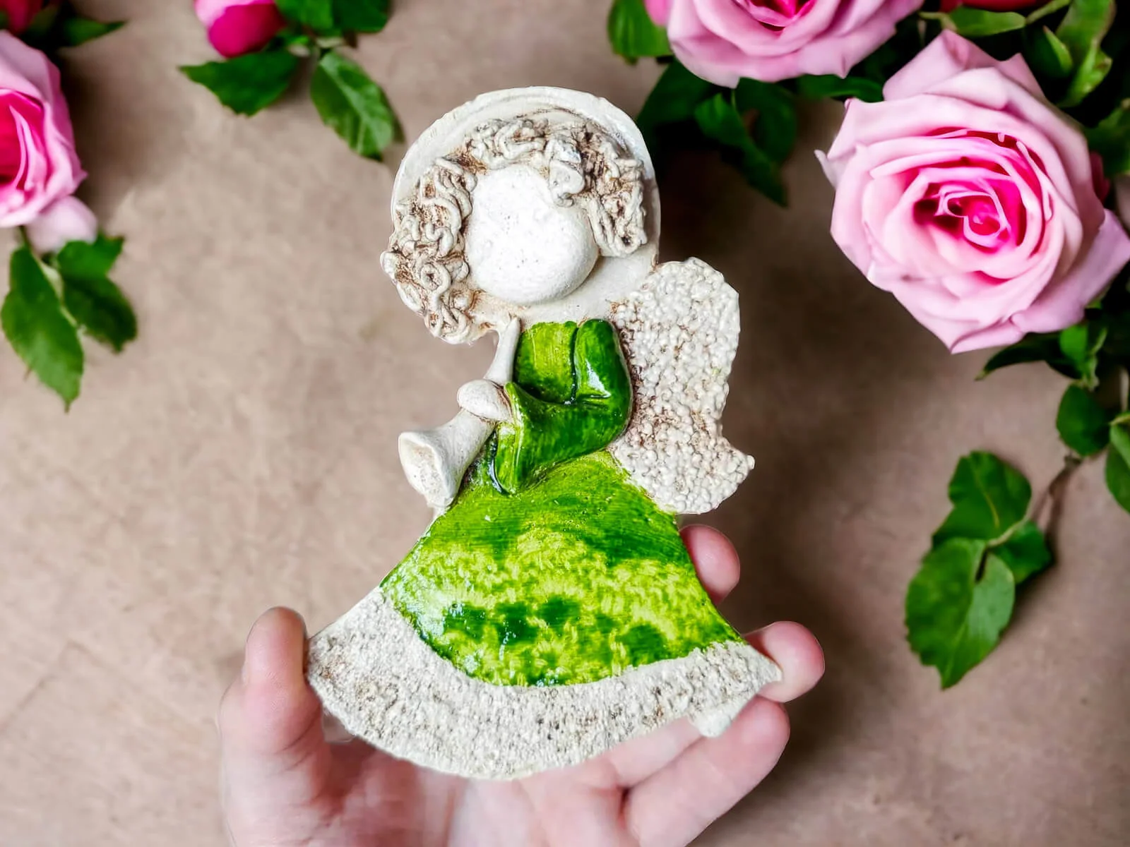 Liolinka z trąbką to ręcznie wykonana gipsowa figurka. Aniołek ma strój w intensywnym odcieniu zieleni, który sprawia, że figurka będzie się wyróżniać na tle innych domowych dekoracji. Z pewnością przyciągnie mnóstwo zaciekawionych spojrzeń. Właśnie dlatego warto umieścić ją w swoim salonie lub podarować w prezencie bliskiej osobie.