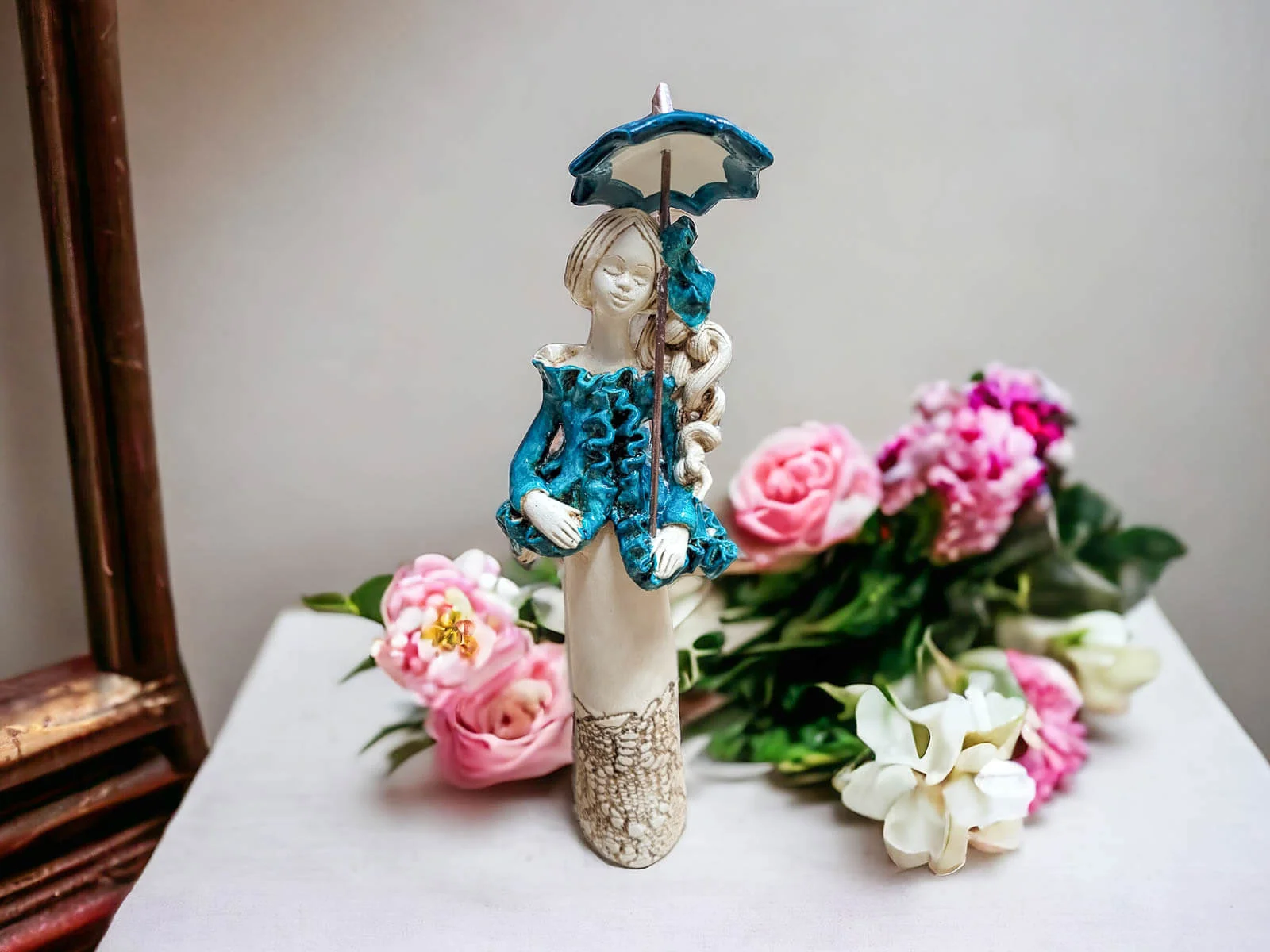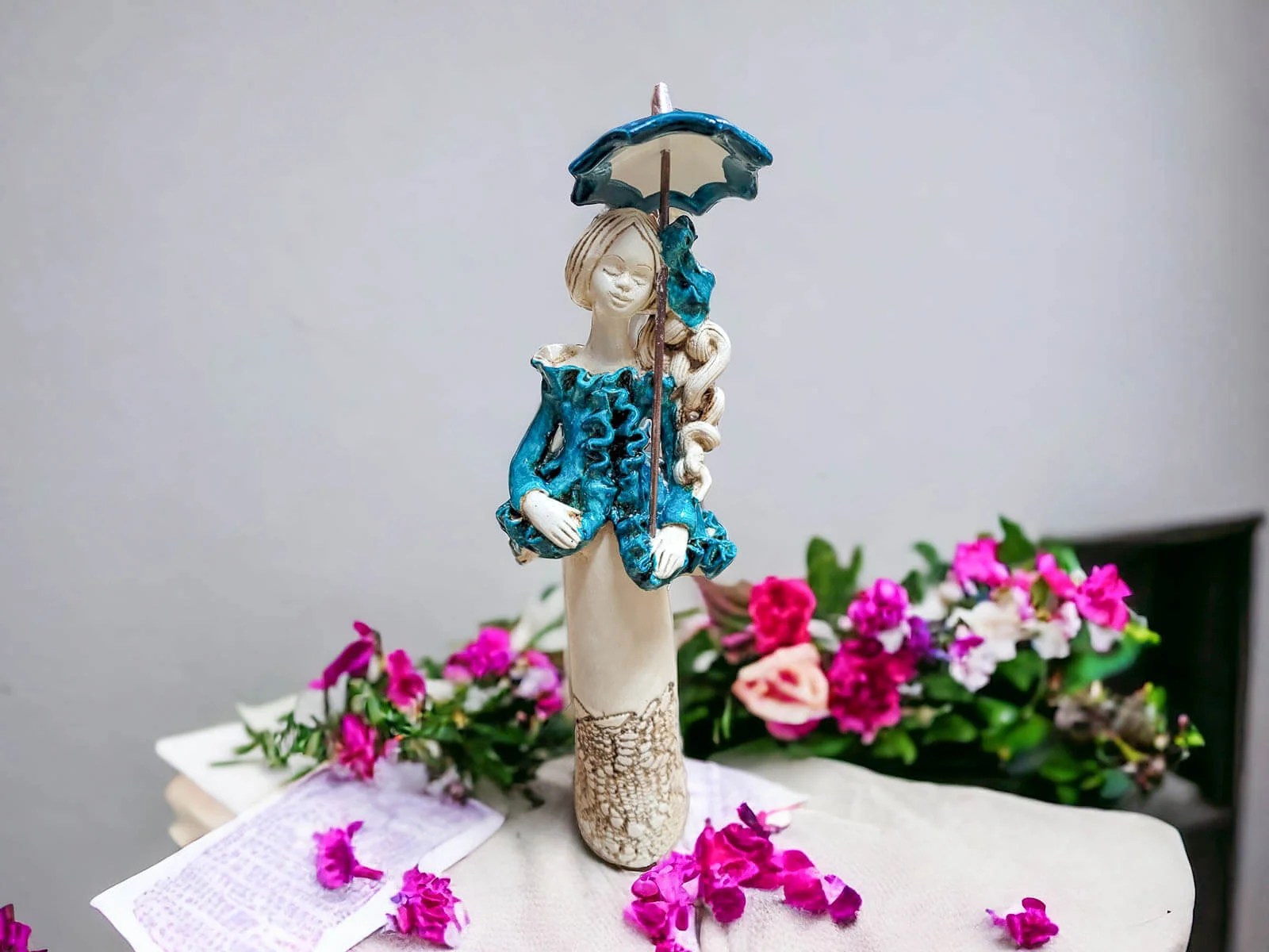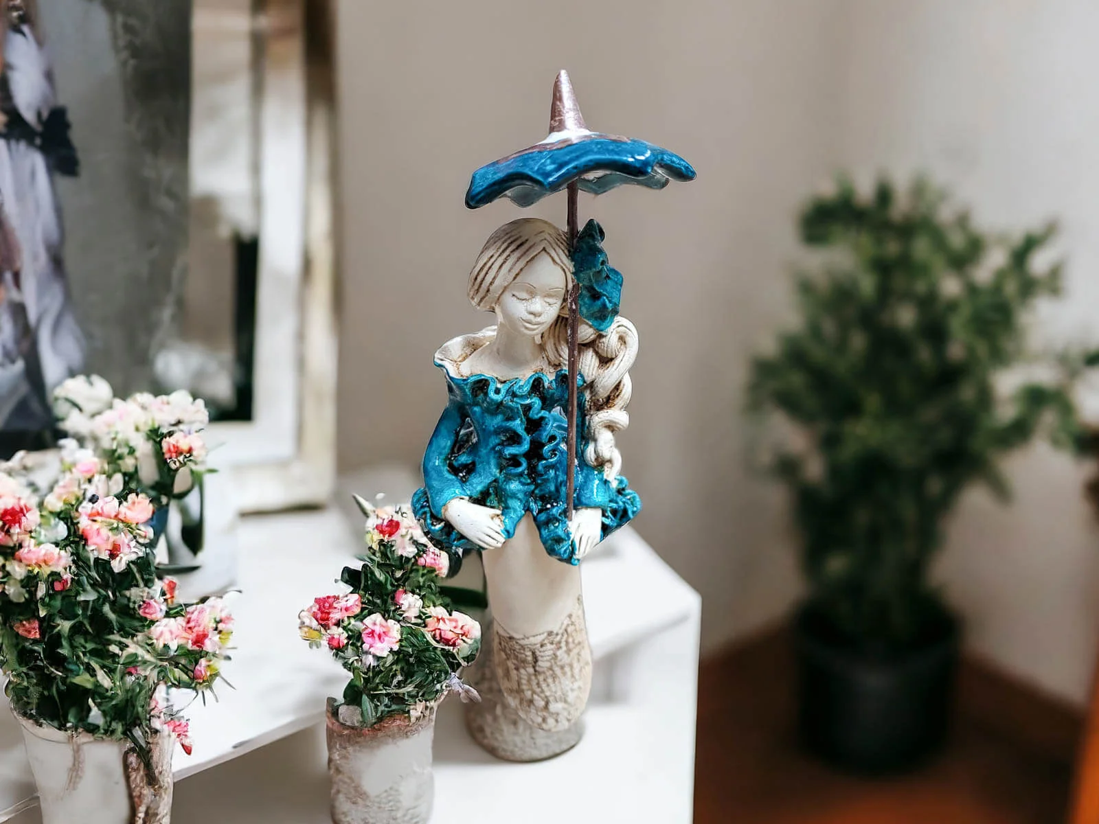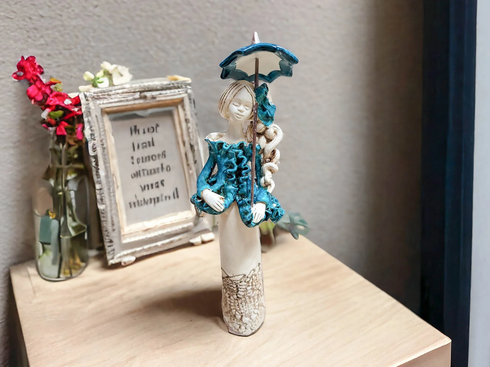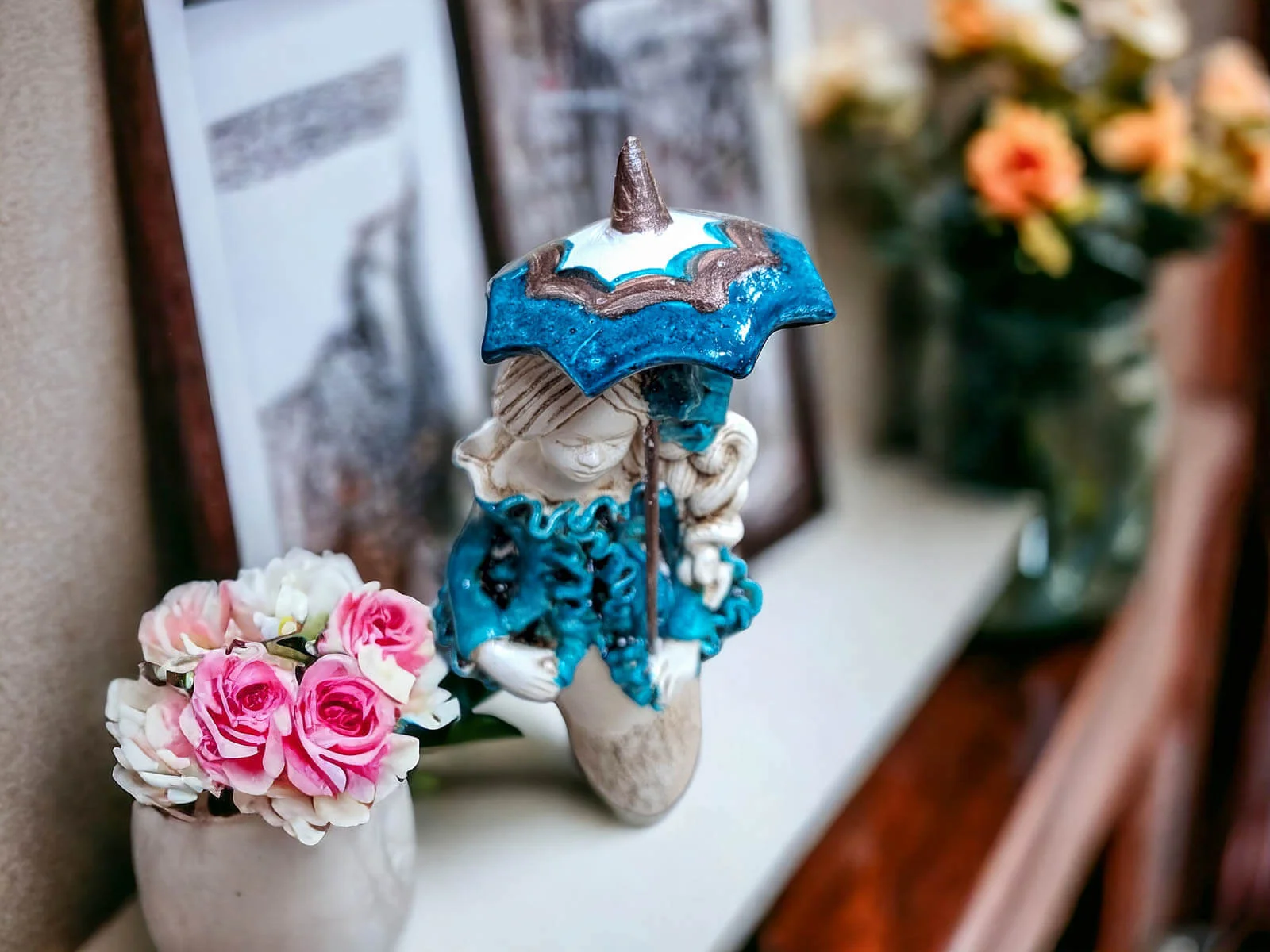 Anioł Konstancja w kolorze turkusowym to ręcznie wykonana figurka gipsowa. Jej beżowy ubiór podkreślają czerwone akcenty i parasolka. Figurka idealnie nadaje się na prezent na dziewczynki lub kobiety jak piękna ozdoba wnętrza.