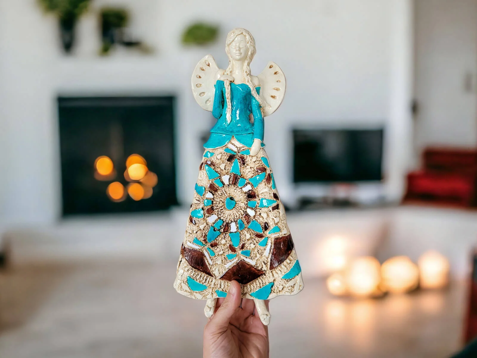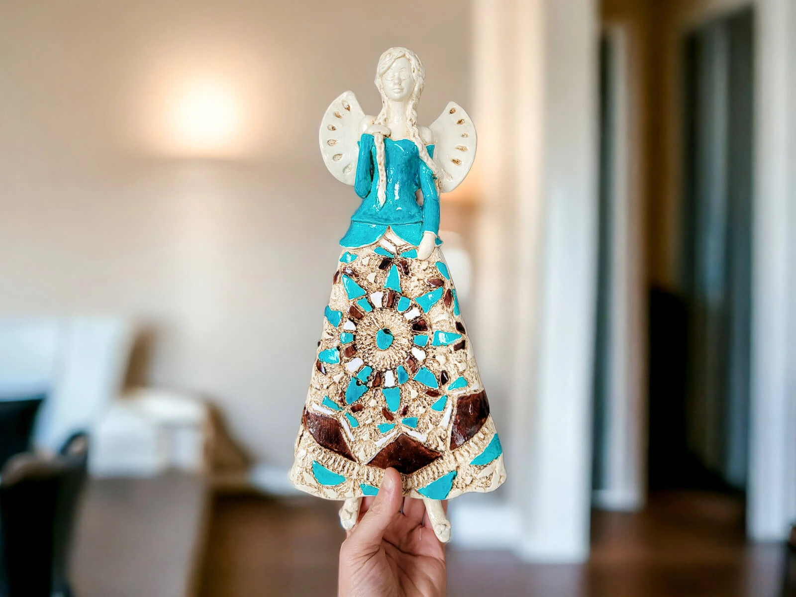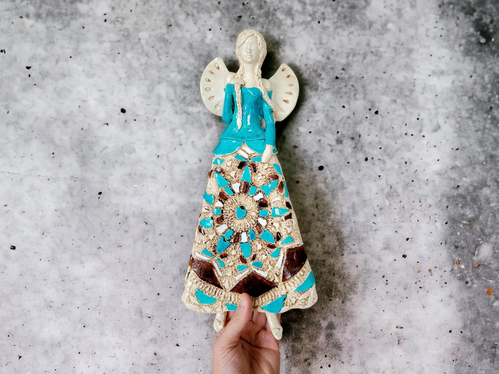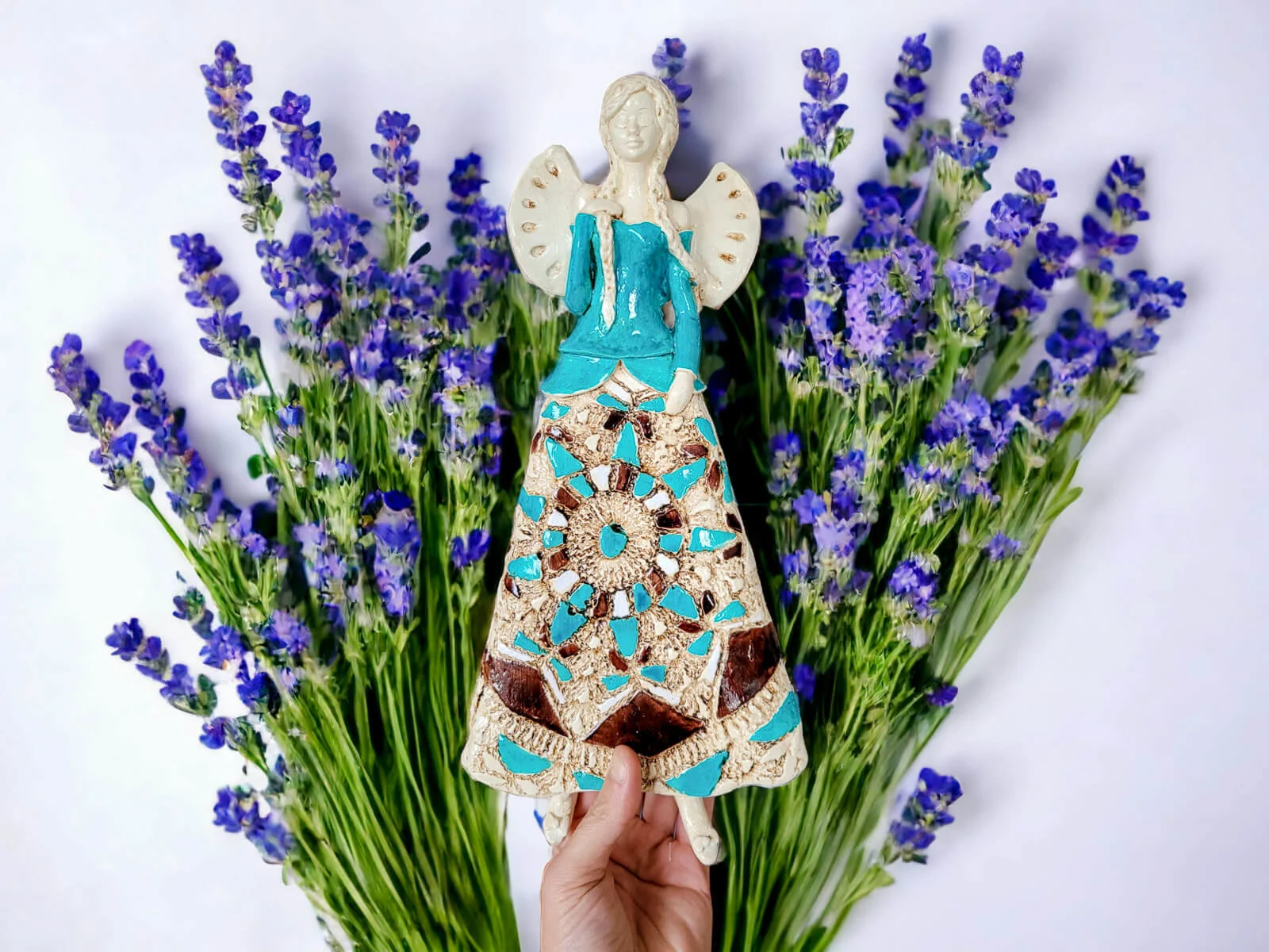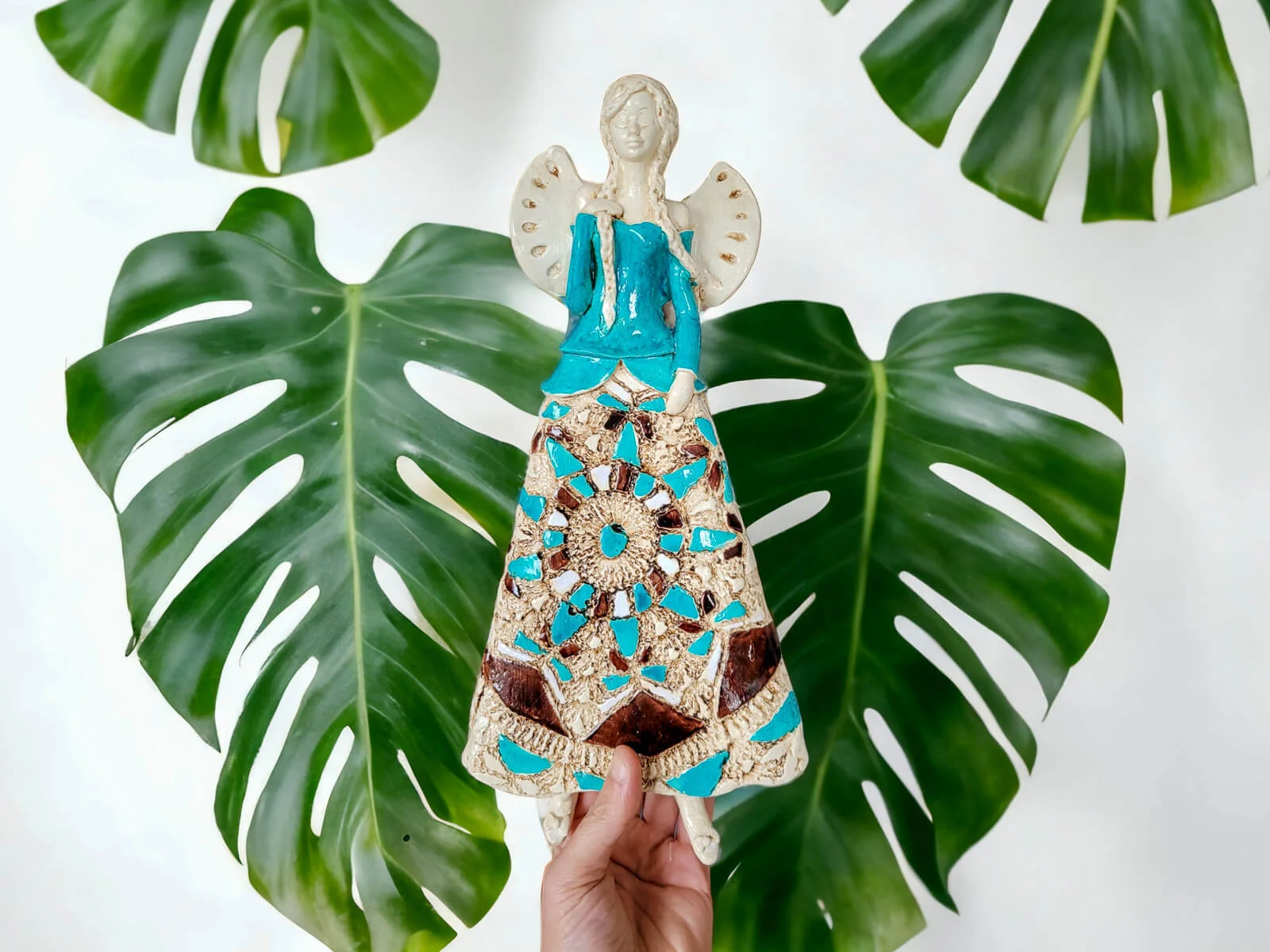Anioł Heather to ręcznie wykonana figurka do zawieszenia na ścianę. Heather to śliczna anieliczka ceniąca sobie tradycję. Jest artystką uwielbia kulturę ludową swojej wioski. Jest ubrana w biało-beżową folklorystyczną suknie. Eksponuje piękne, długie warkocze. Ma delikatne, rozłożyste skrzydła. Figurka nadaje się na prezent na każdą okazję. Można ją zawiesić w każdym miejscu. Świetnie wkomponuje się w klasyczne jak i nowoczesne wnętrze.