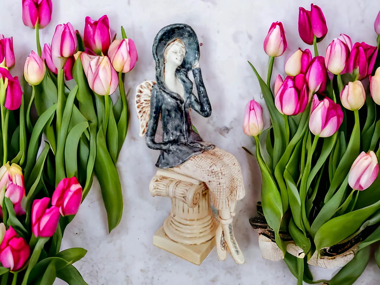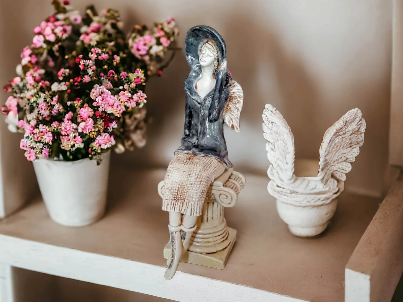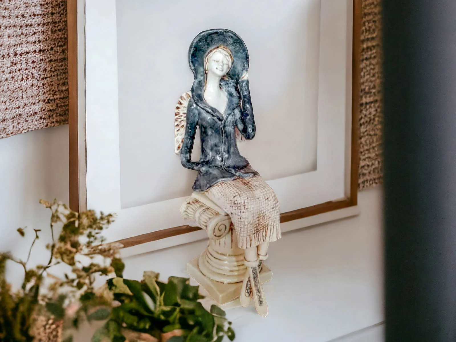 Aniołek Megan przedstawia siedzącą kobietę w szarym żakiecie i kapeluszu. Ubrana jest także w beżową spódnicę ze sweterkowym motywem. Ma krótkie, jasne włosy i małe skrzydła. Lewą rękę trzyma na rogu kapelusza, a prawą w kieszeni żakietu. Figurka jest wykonana z gipsu. Idealnie pasuje na prezent dla żopny, mamy, babci, siostry czy koleżanki.