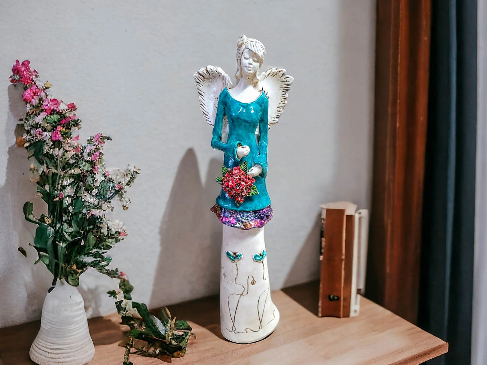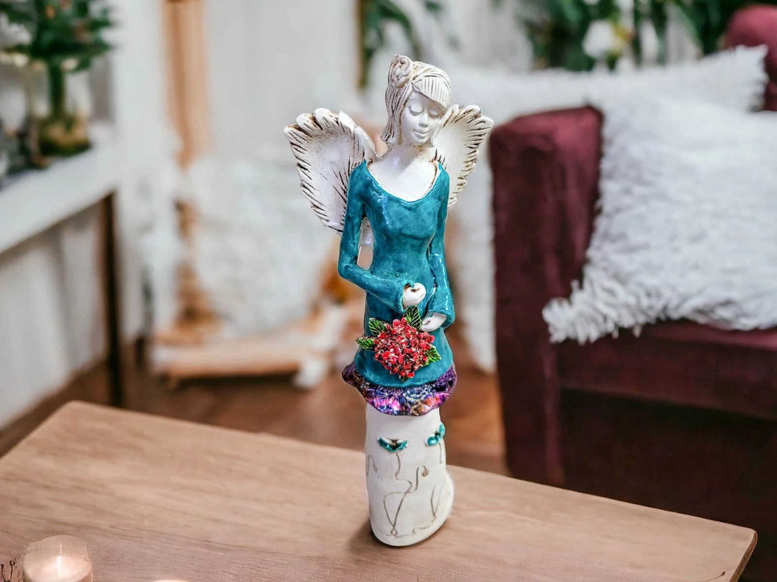 Anioł Mia to postać o nieprzeciętnej subtelności, lecz w tej wersji kolorystycznej dość intensywnej, nadającej jej charakteru. Suknia w intensywnym, ciemnym turkusie sprawia, że anioł budzi zaciekawienie już przy pierwszym kontakcie wzrokowym. Anioł jest sporych rozmiarów, wysokość czterdziestu centymetrów pozwala na umieszczenie figury dowolnym miejscu w mieszkaniu. Gdziekolwiek się ją postawi na pewno zostanie zauważona. Mia będzie się również pięknie komponować wśród innych dekoracji w salonie.