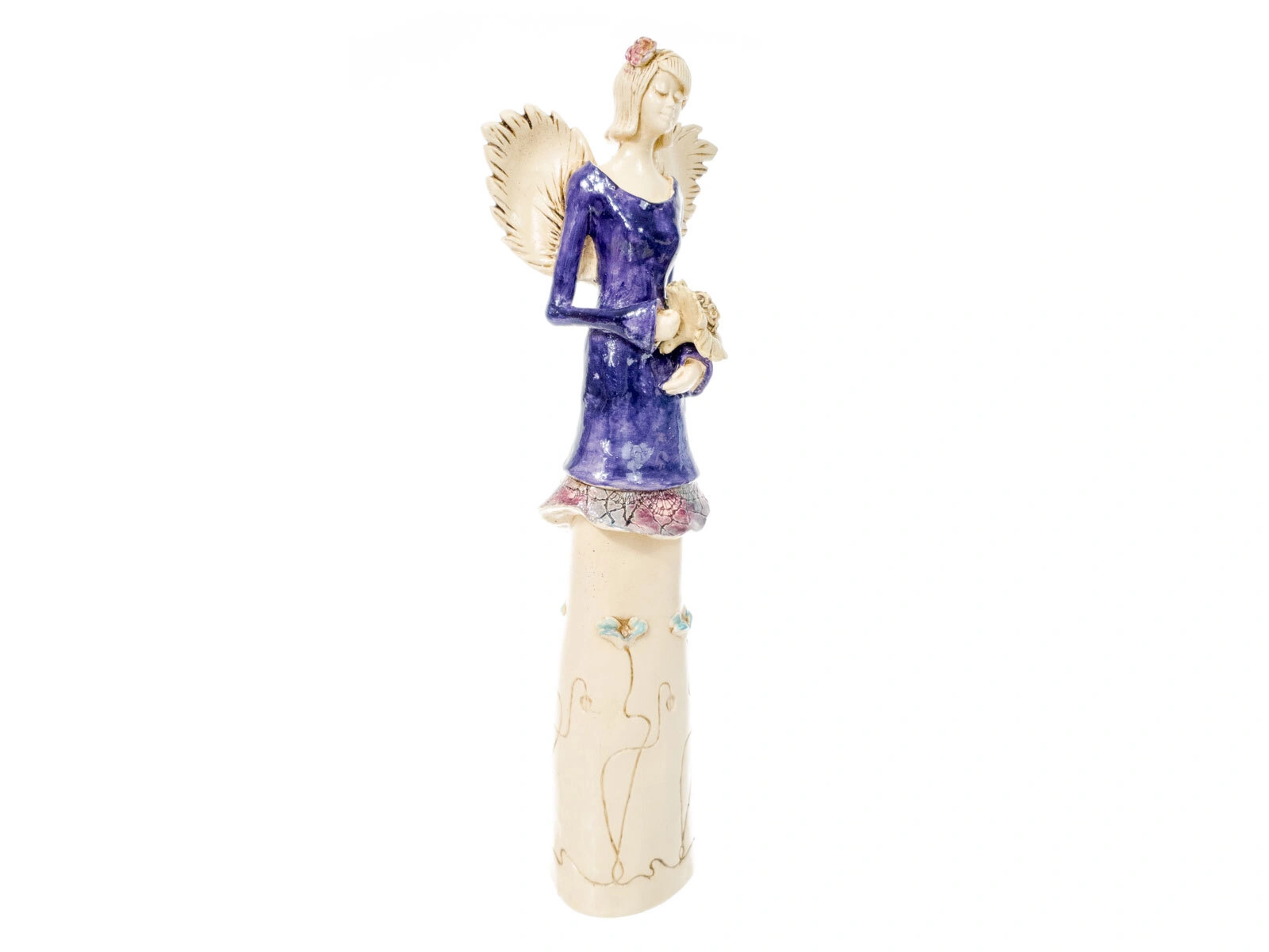 Anioł Mia to postać o nieprzeciętnej subtelności, lecz w tej wersji kolorystycznej jest o wiele ciekawsza. W tej wersji Mia nosi suknię w ciemnym fiolecie, co nadaje figurze elegancji. Anioł jest sporych rozmiarów, a wysokość czterdziestu centymetrów pozwala na umieszczenie figury w dowolnym miejscu, na pewno zostanie zauważona. Mia będzie się również pięknie komponować wśród innych dekoracji w salonie.