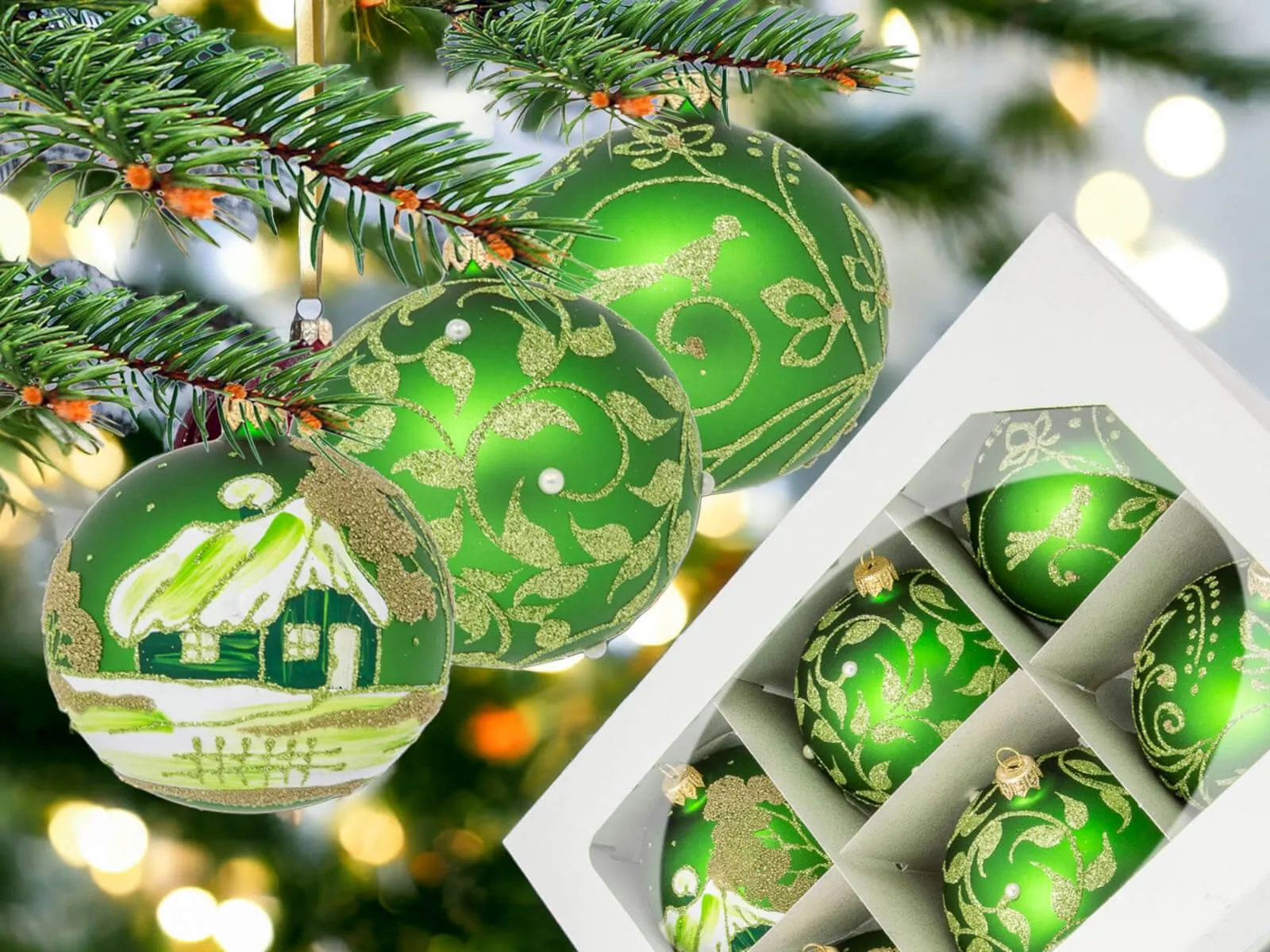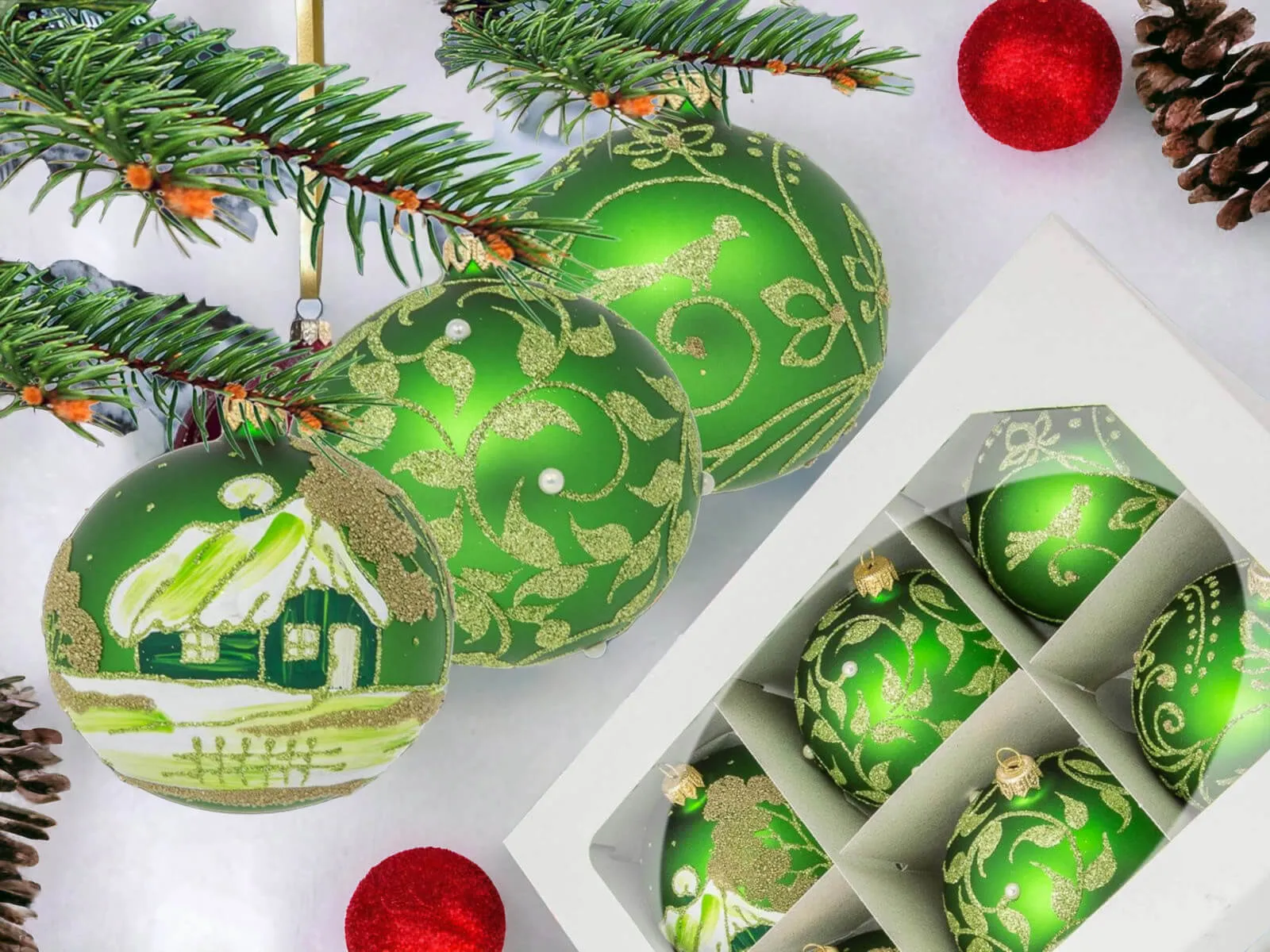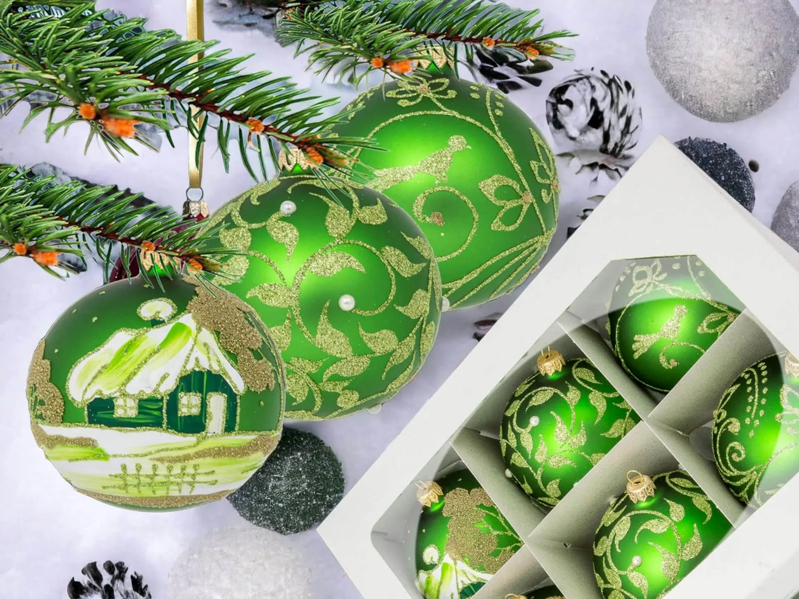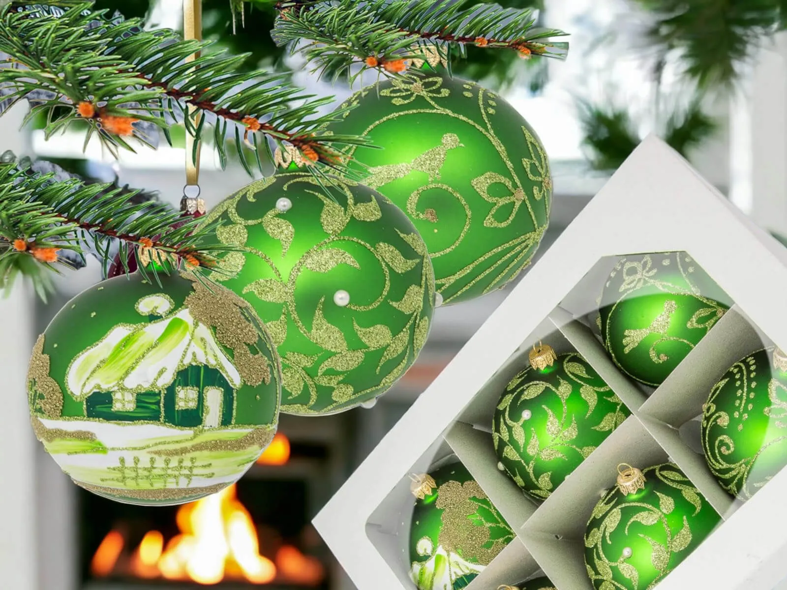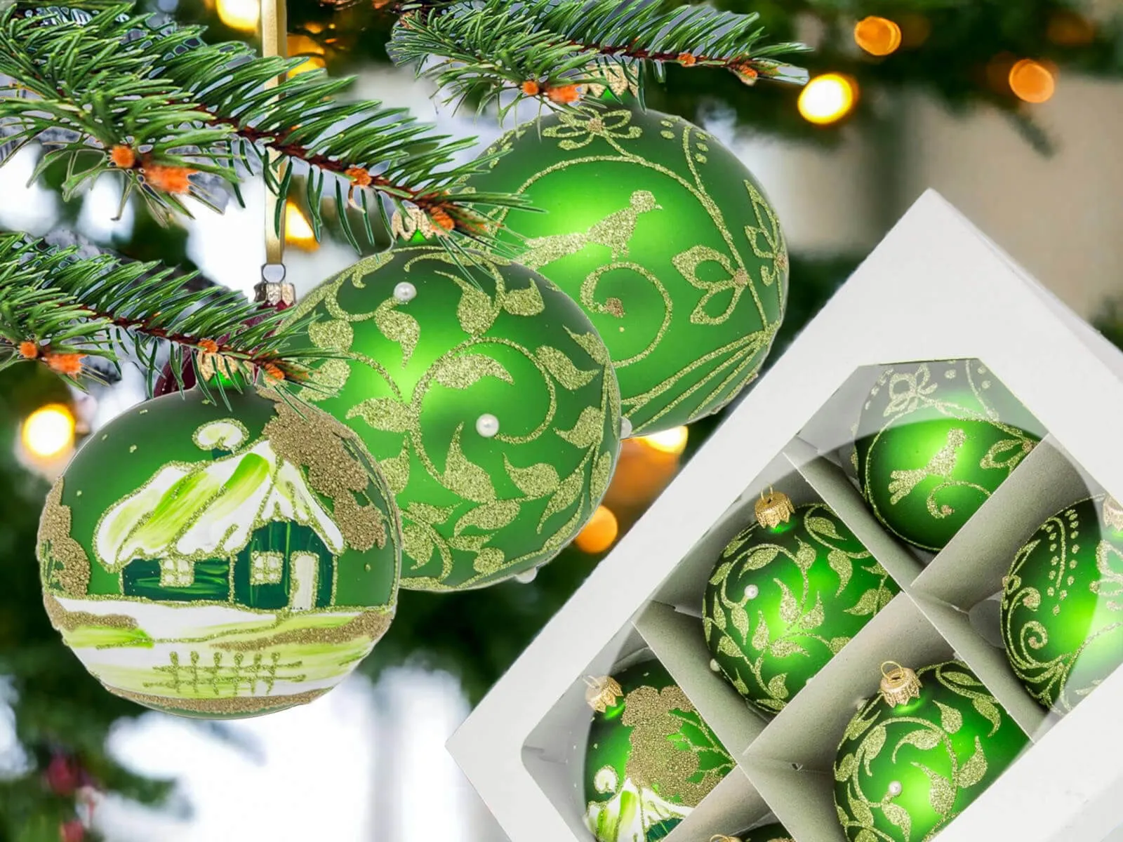W komplecie znajdują się trzy różne wzory bombek, z każdego wzoru po dwie sztuki. Chatka, listki i ptaszek, każdy z tych motywów został starannie ozdobiony złotym akcentem na zielonym podkładzie. Intensywny zielony kolor nadaje bombkom charakterystycznej świeżości, podczas gdy złote zdobienia dodają im wytwornego i stylowego wyglądu.