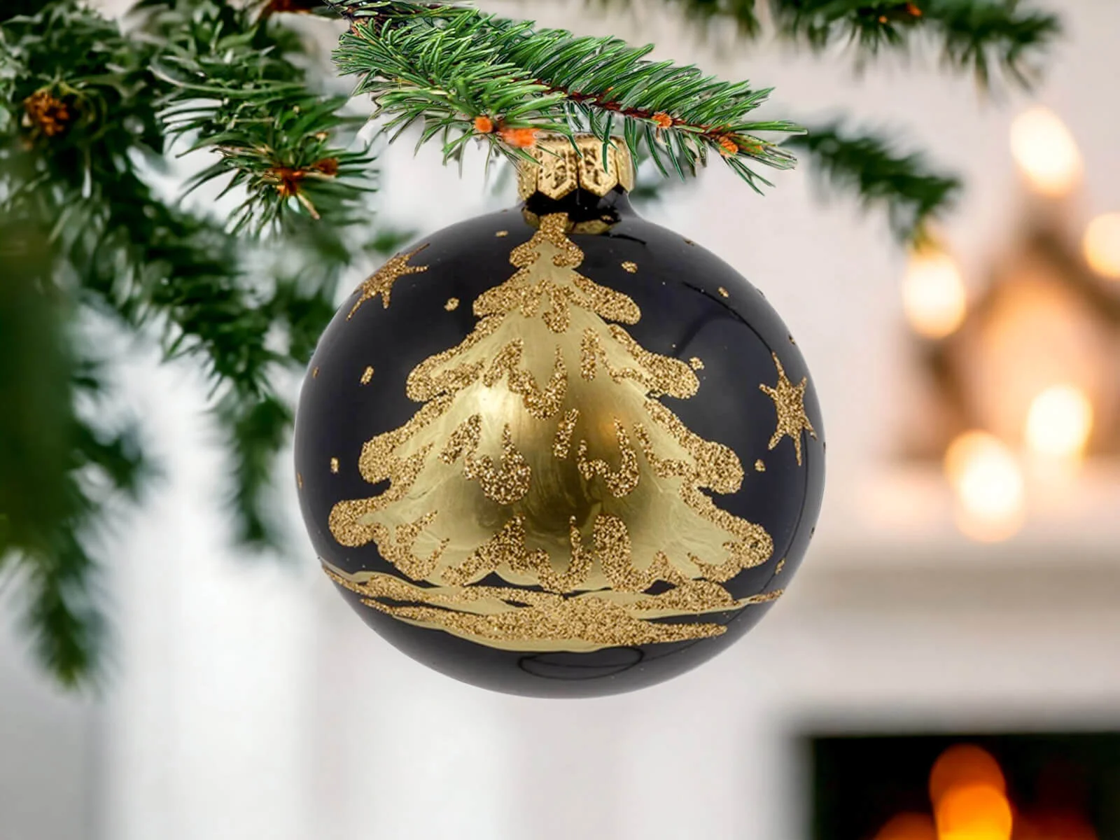 Komplet szklanych bombek choinkowych Czarny Opal - Chatka, Gwiazdka, Choinka to wyraz wyrafinowanego smaku i elegancji w świątecznym wystroju. Ręcznie robione i malowane, te unikatowe ozdoby łączą w sobie głęboki kolor czarnego opalu z bogatym złotym zdobieniem, tworząc niepowtarzalny zestaw, który zachwyca wyjątkowym designem i polskim rzemiosłem.