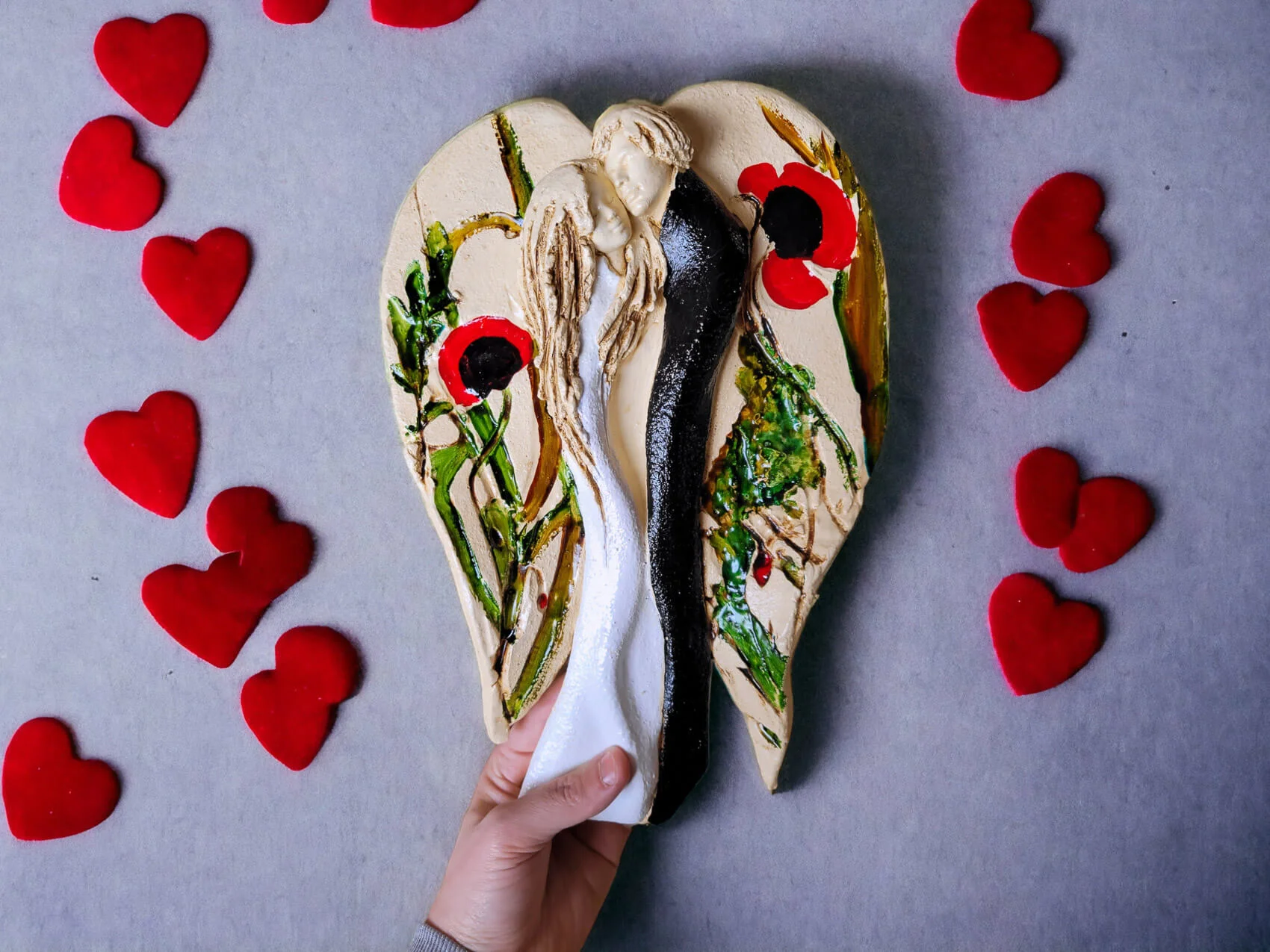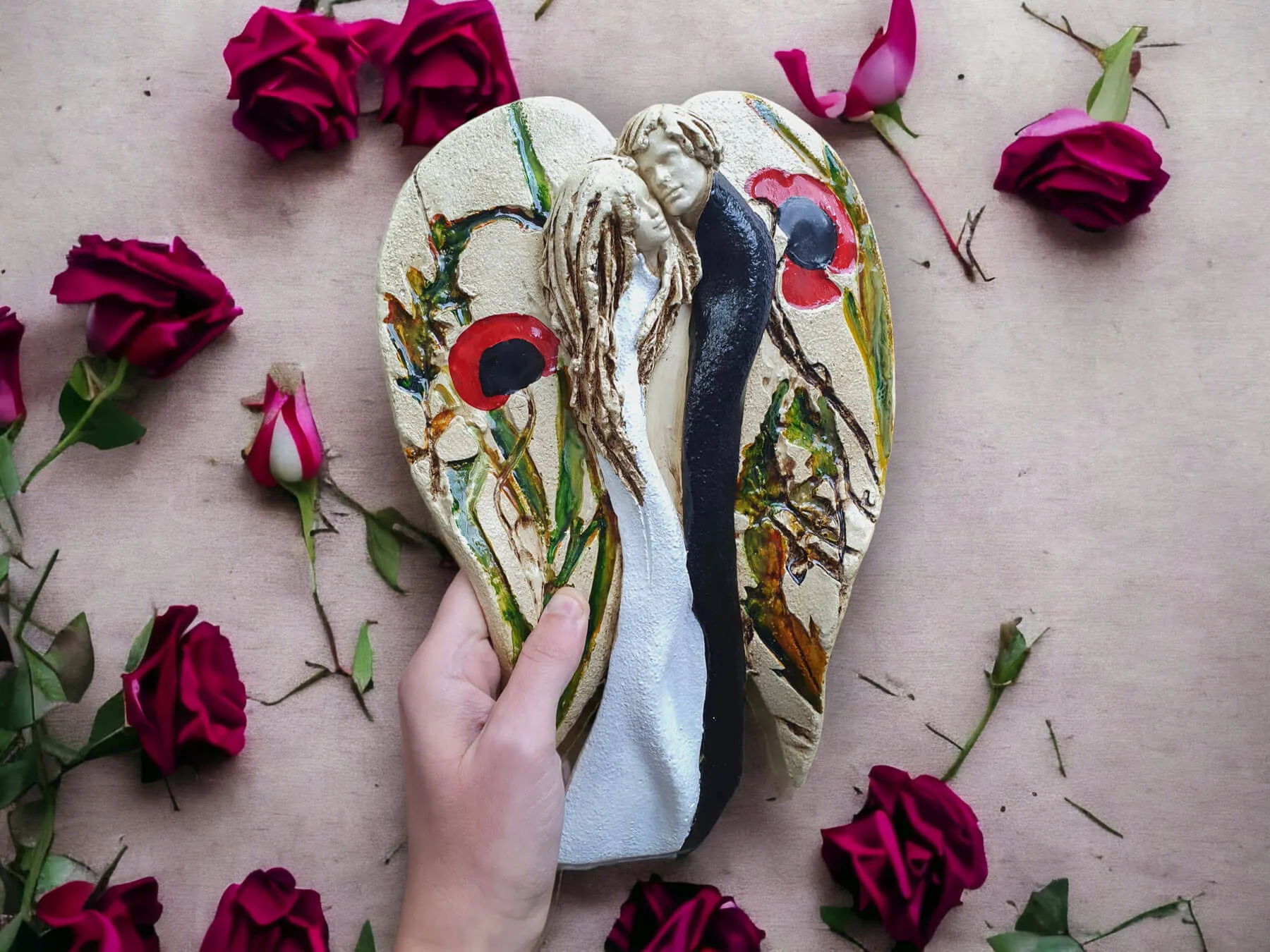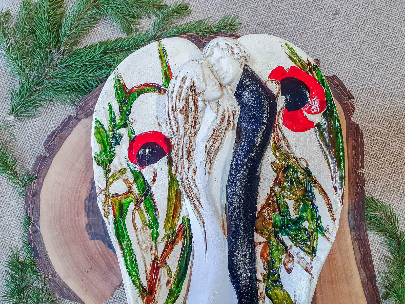 Kochające Anioły w unikalnej wersji kolorystycznej to niezwykła ozdoba, która emanuje ciepłem i miłością. Każdy z tych aniołów jest ręcznie wykonany i ręcznie pomalowany, co nadaje im wyjątkowy charakter i indywidualność. Stojąc w objęciach, tworzą one jedność, będąc połączone miłością, co stanowi piękne i inspirujące przesłanie.