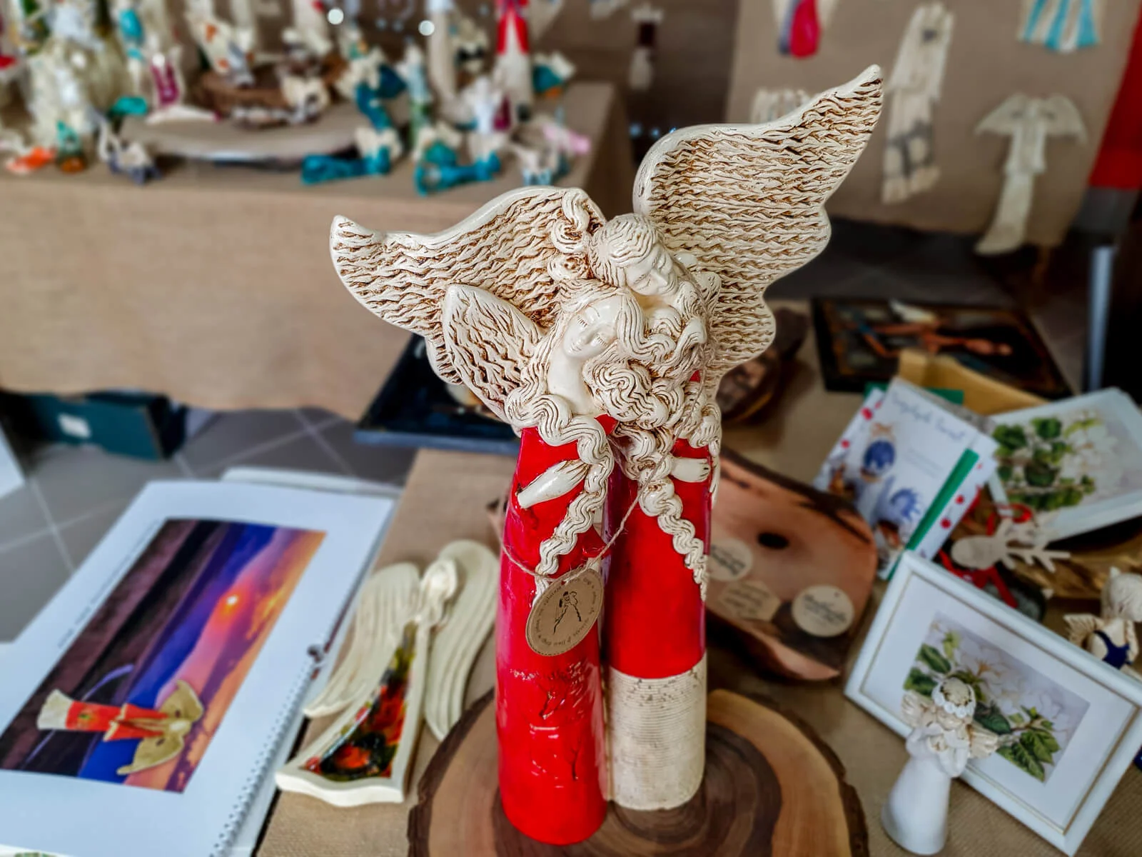 Juliet w delikatnej białej sukni ozdobionej wzorami, z długimi, kręconymi włosami i uniesionymi skrzydłami, symbolizuje delikatność i oddanie. Romeo, w kontrastowej czarnej szacie z dużymi skrzydłami, reprezentuje siłę i opiekę. Ich postawy tworzą harmonijną całość, pełną emocji i symboliki.