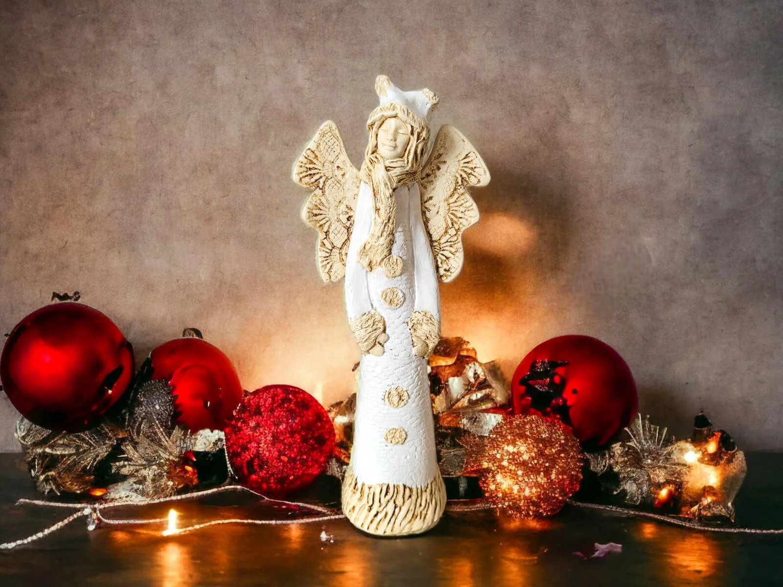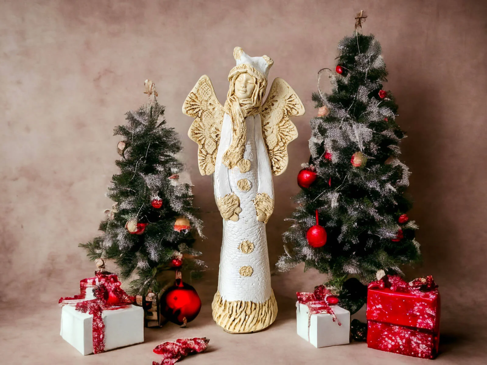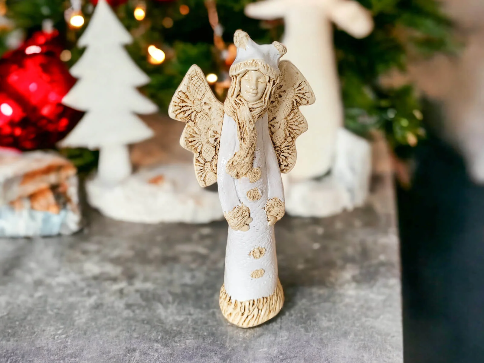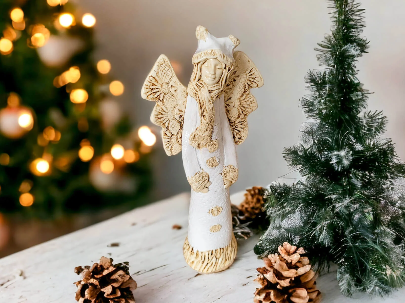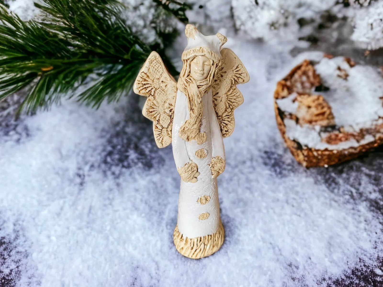 Anioł Bieszczadzki w wersji białej - zimowej, to Anioł mieszkający w leśnej chatce w pięknych polskich górach Bieszczadach. Żyje w przyjaźni z niedźwiedziami, dzikami, lisami, wilkami. Bardzo często gości u siebie inne anioły, szczególnie w sezonie turystycznym. Często snuje opowieści i śpiewa przygrywając na gitarze. Lubi robić na szydełku koronki, które potem nosi albo sprzedaje.