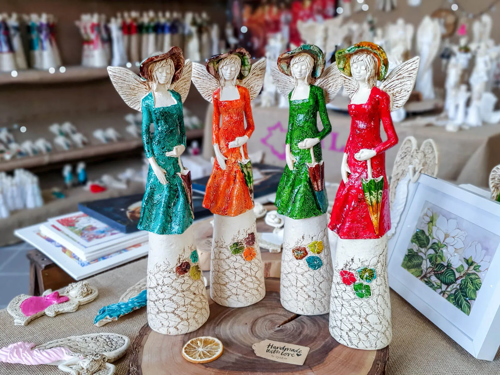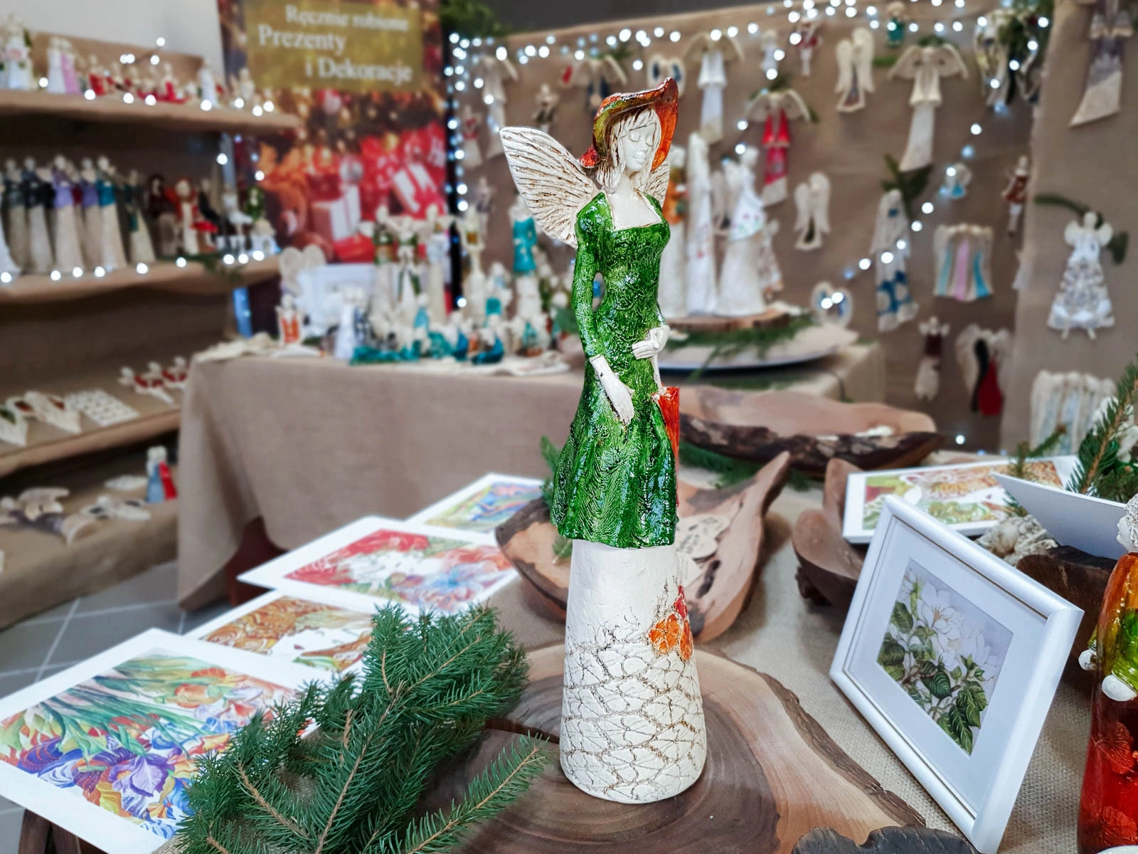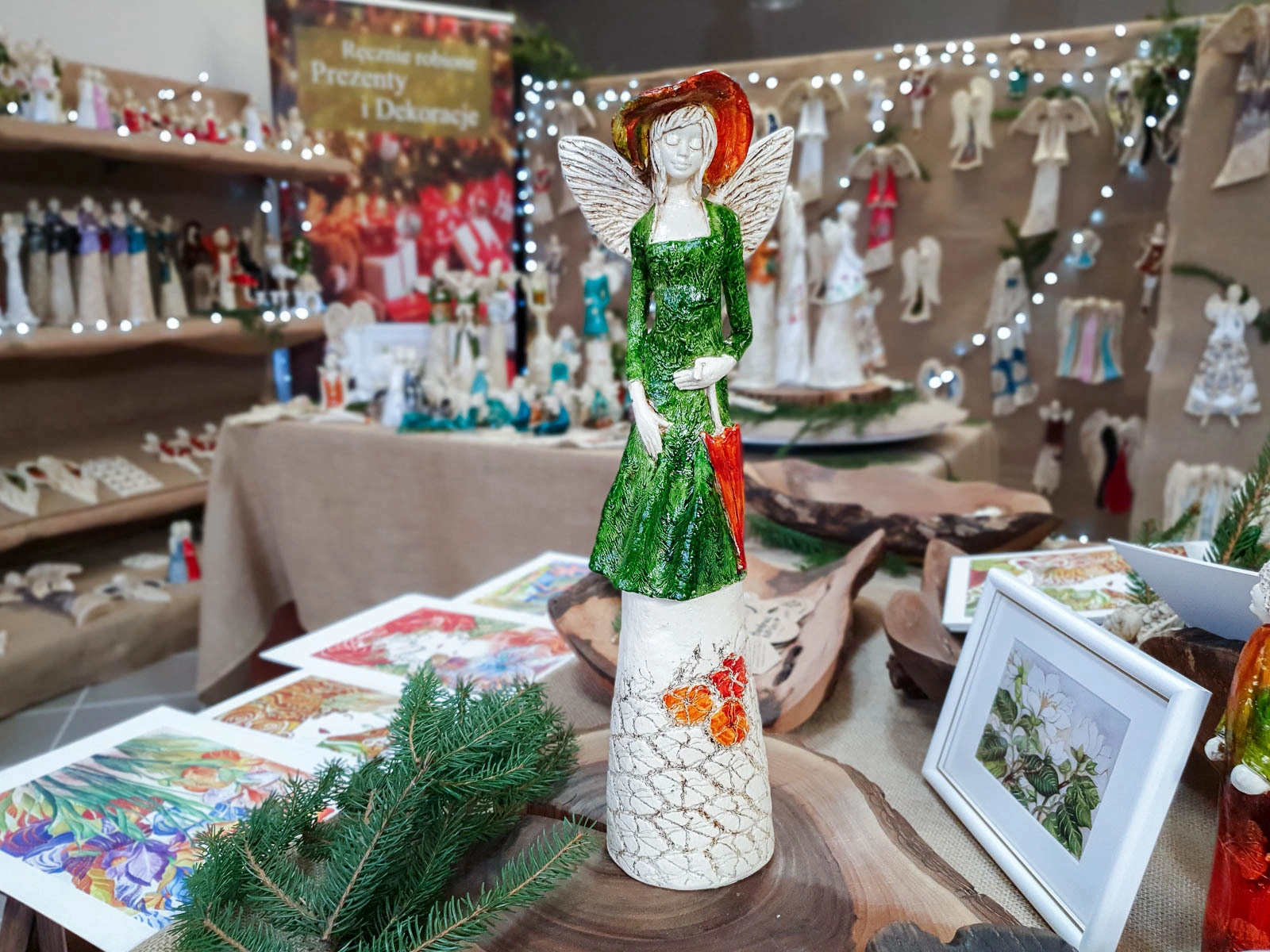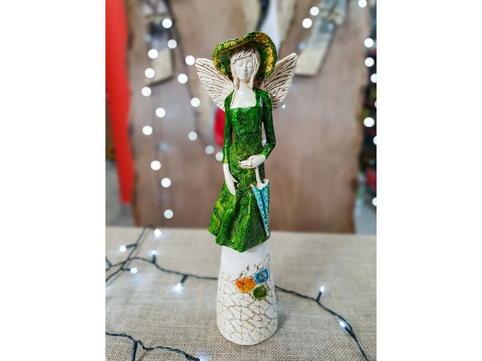 Anioł Olivia to dekoracja stojąca, wykonana ręcznie z gipsu. Prezentuje kobietę w zielono-żółtej sukience i z zielonym kapeluszem na głowie. Ma krótkie, jasne włosy, a w lewej dłoni trzyma beżowy parasol. Z tyłu wystają małe skrzydła w kształcie liści. Figurka pięknie wyglądałaby w stylowym wnętrzu, jak i na zewnątrz w ogrodzie. Idealnie nadaje się na prezent dla osoby, która lubi oryginalność.