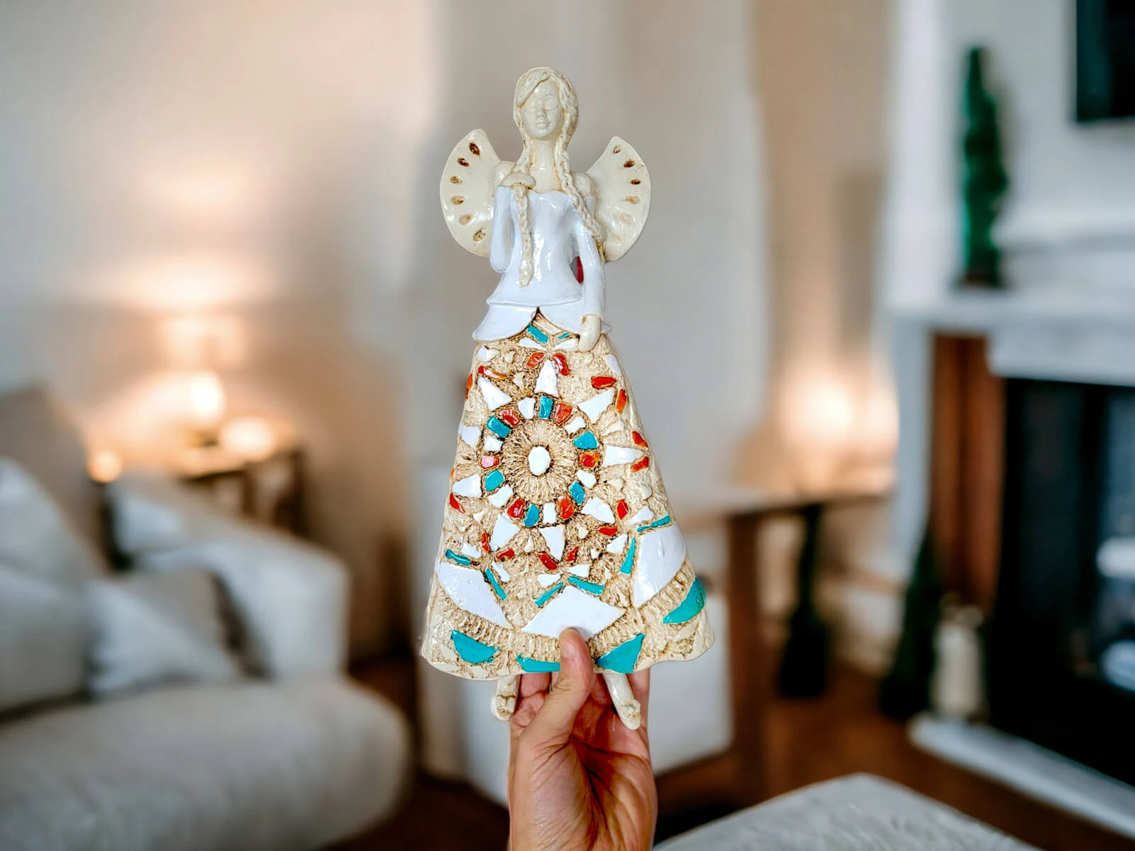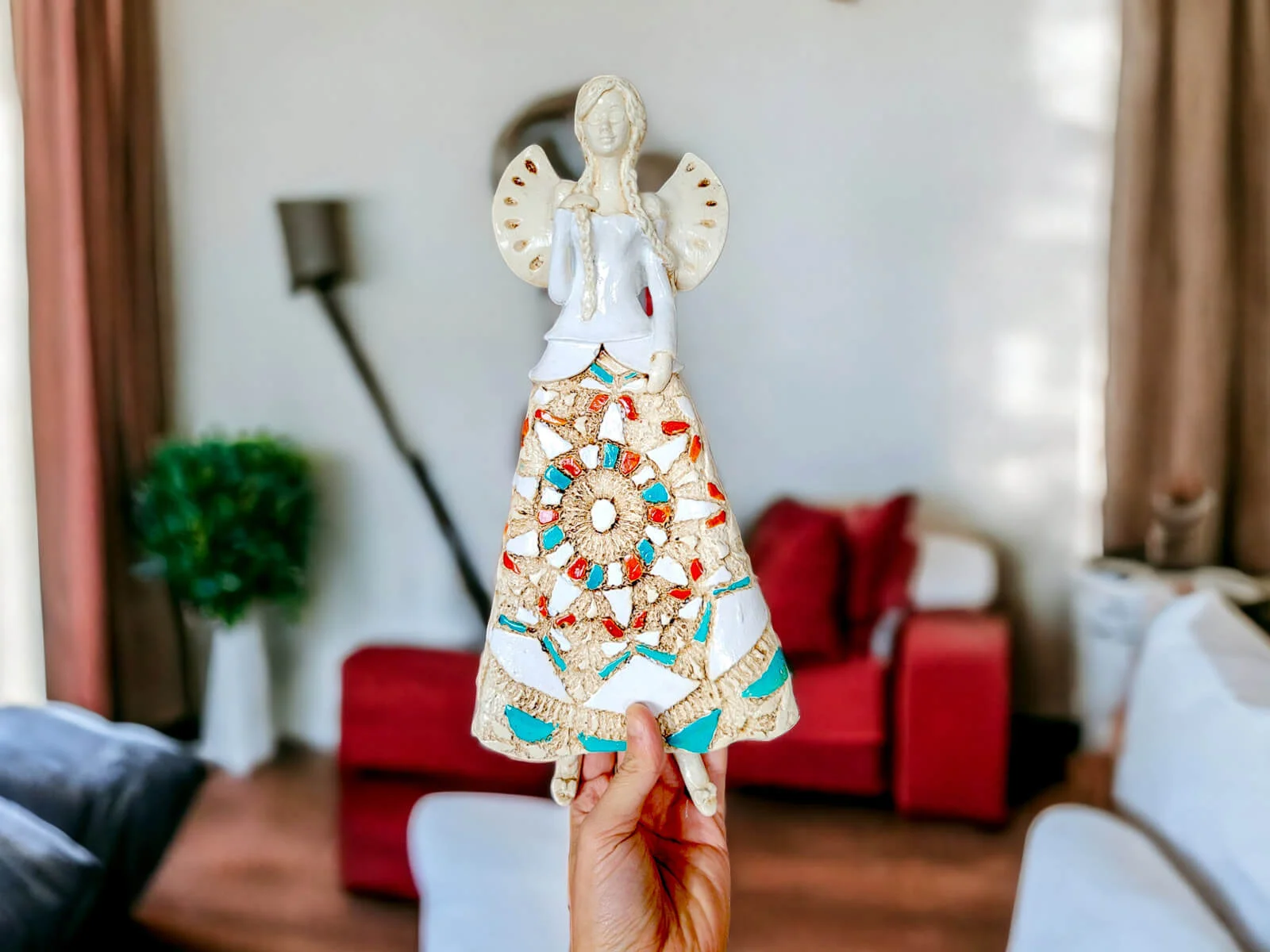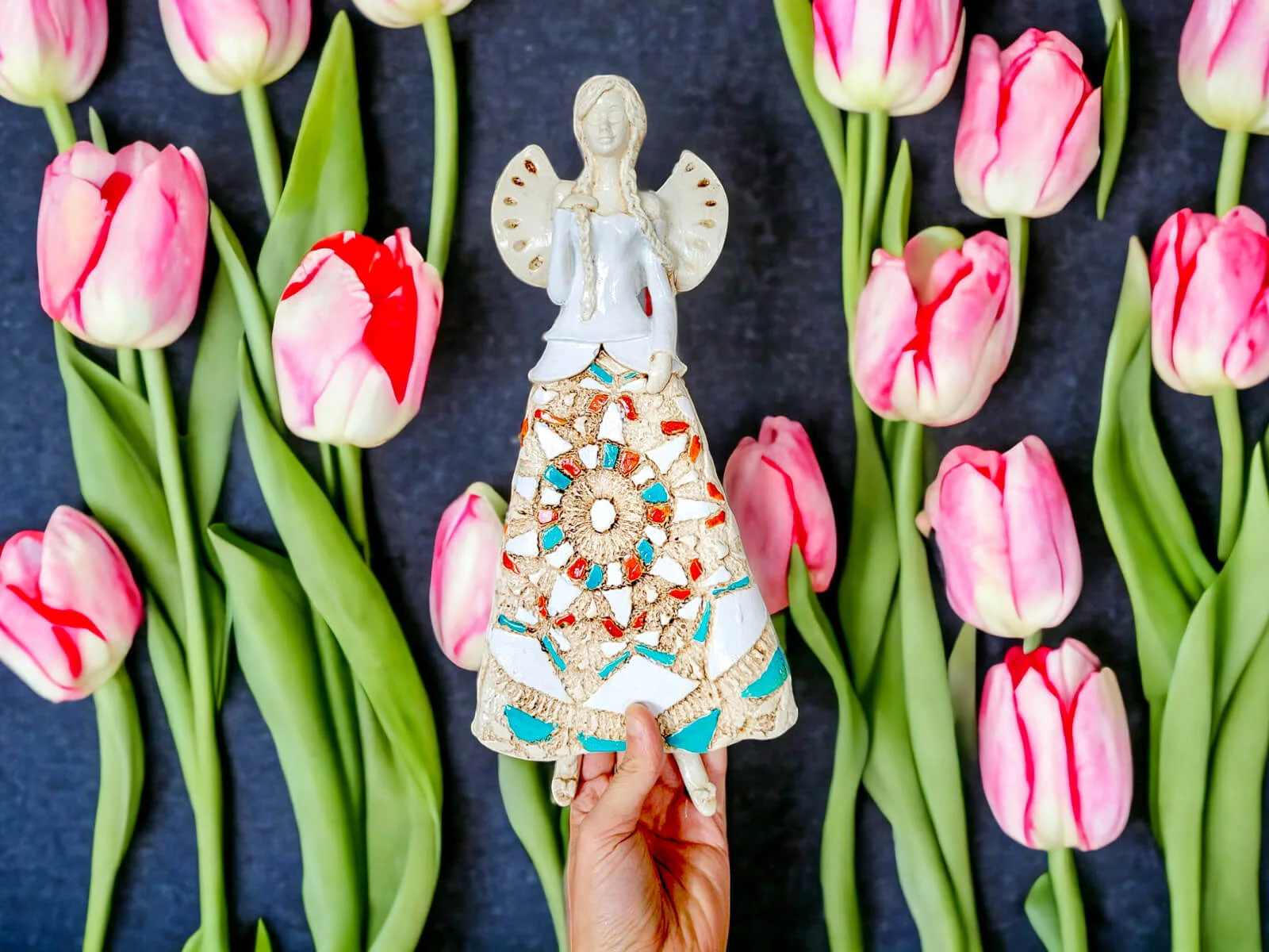 Anioł Heather to ręcznie wykonana figurka do zawieszenia na ścianę. Heather to śliczna anieliczka ceniąca sobie tradycję. Jest artystką uwielbia kulturę ludową swojej wioski. Jest ubrana w biało-beżową folklorystyczną suknie. Eksponuje piękne, długie warkocze. Ma delikatne, rozłożyste skrzydła. Figurka nadaje się na prezent na każdą okazję. Można ją zawiesić w każdym miejscu. Świetnie wkomponuje się w klasyczne jak i nowoczesne wnętrze.