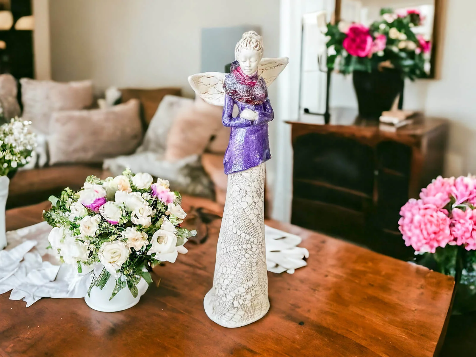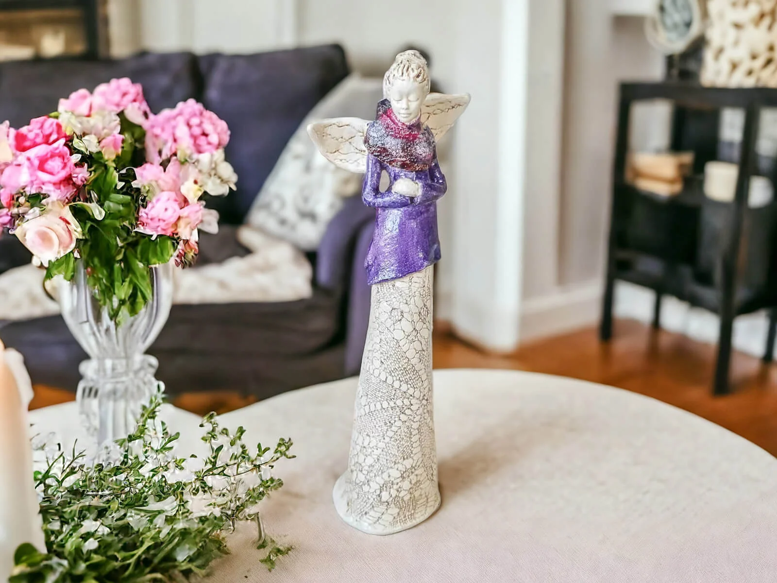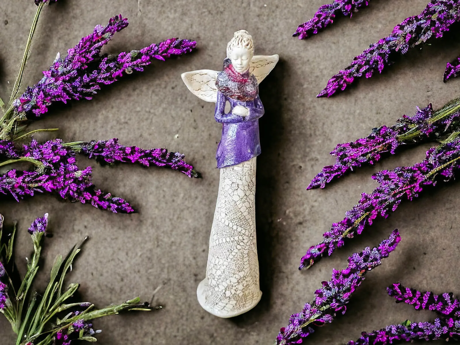 Anioł Catherine we wrzosowej, pastelowo fioletowej sukni. Kasia to kobieta pełna wdzięku i klasy. Urok Catherine kryje się w jej nieśmiałości - spuszczony wzrok świadczy o zawstydzeniu spojrzeniami, które ściąga na siebie anielskim blaskiem. Figura pięknie zaprezentuje się w ogrodzie bądź salonie i z pewnością wywoła uśmiechy na twarzach Twoich gości.