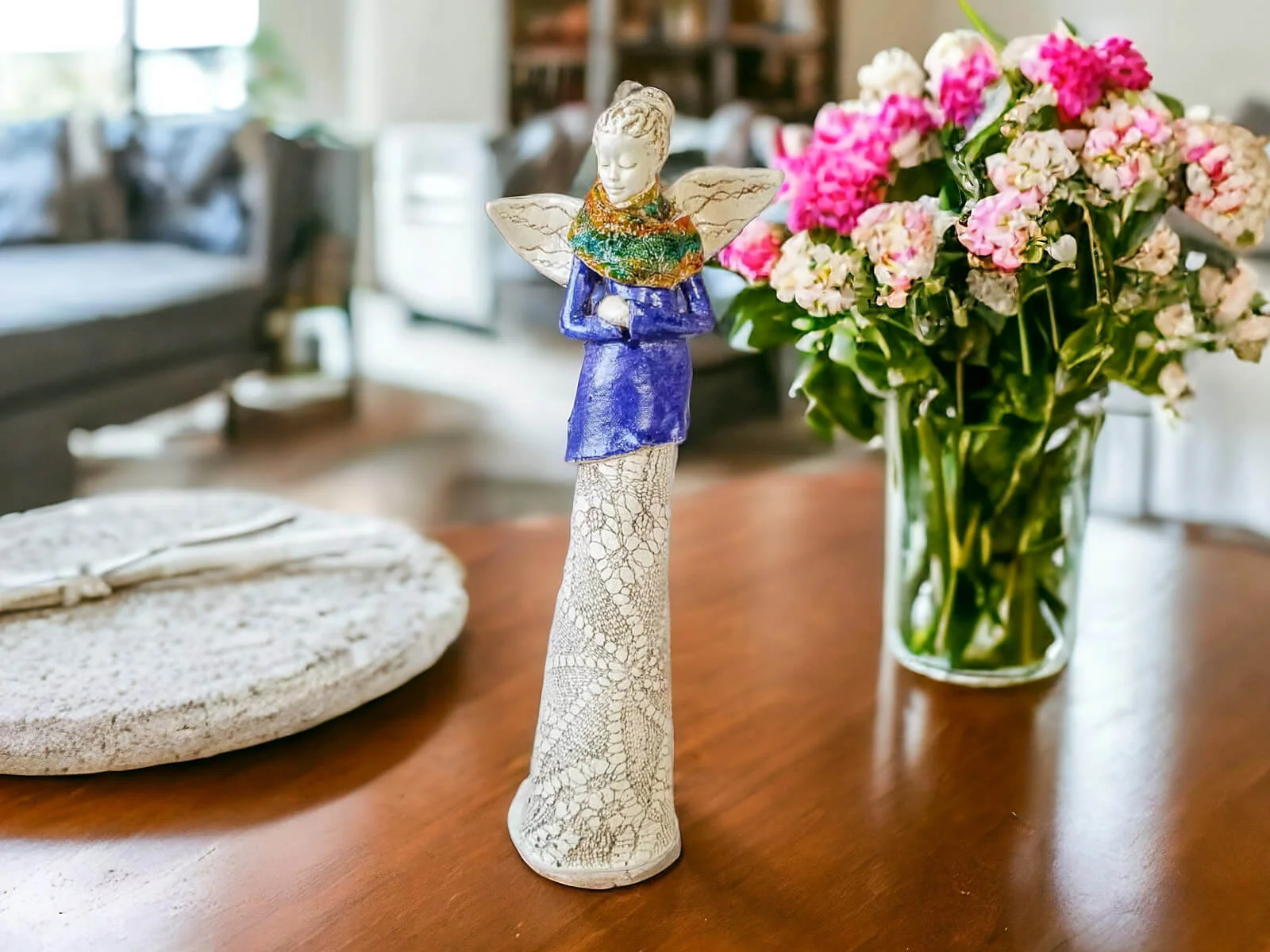 Anioł Catherine w granatowej sukni. Kasia to kobieta pełna wdzięku i klasy. Urok Catherine kryje się w jej nieśmiałości - spuszczony wzrok świadczy o zawstydzeniu spojrzeniami, które ściąga na siebie anielskim blaskiem. Figura pięknie zaprezentuje się w ogrodzie bądź salonie i z pewnością wywoła uśmiechy na twarzach Twoich gości.