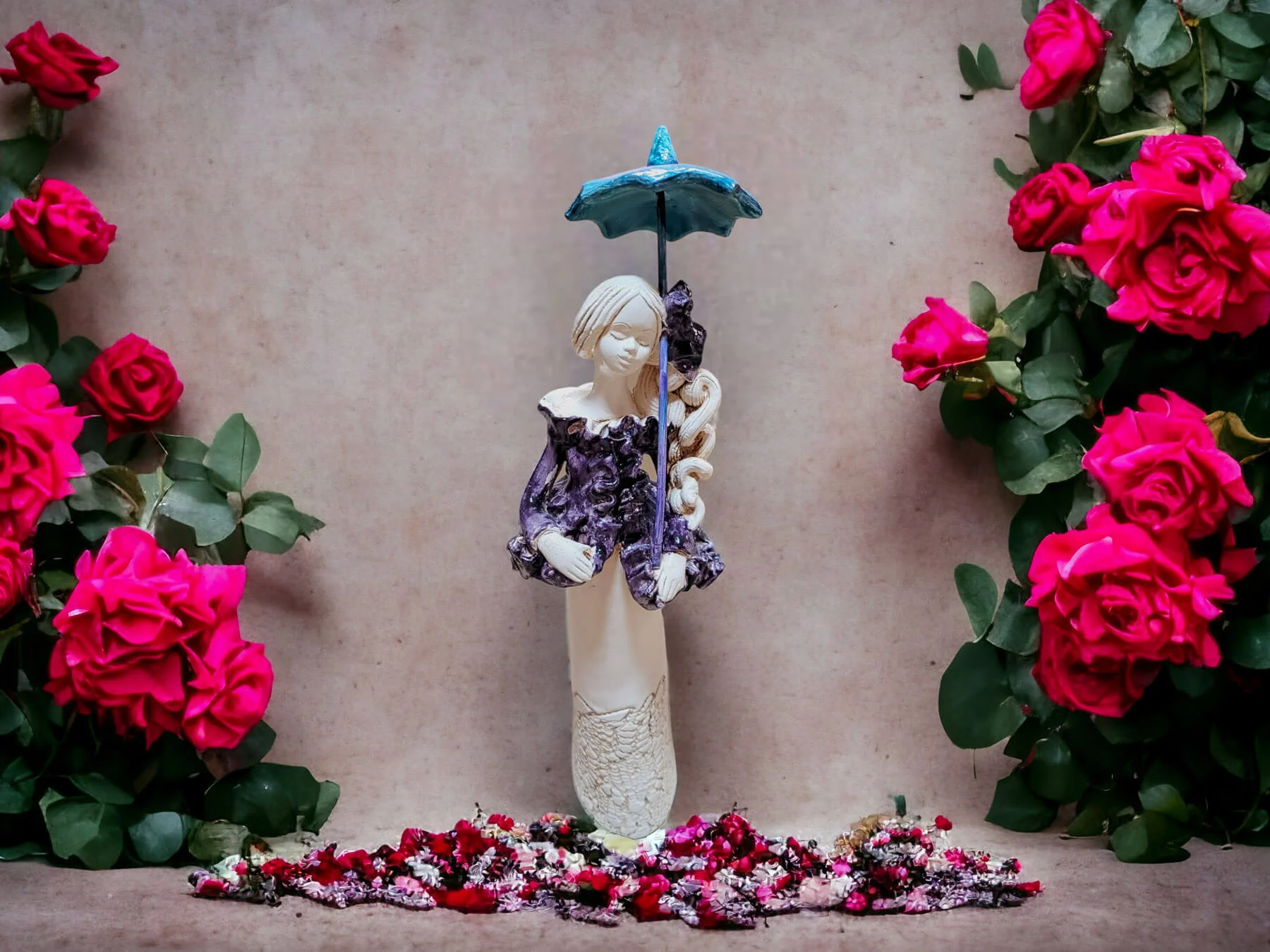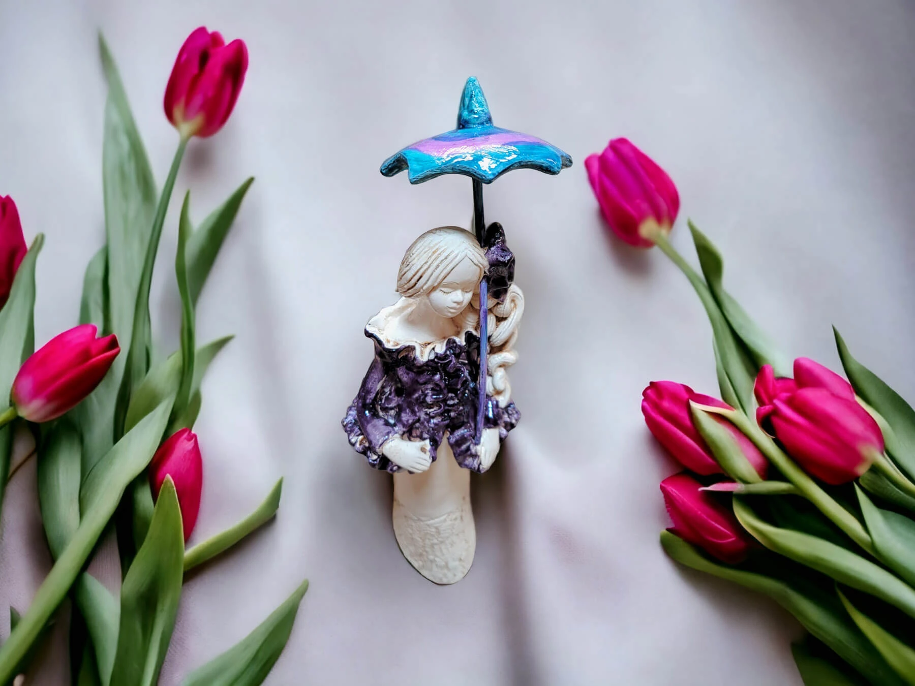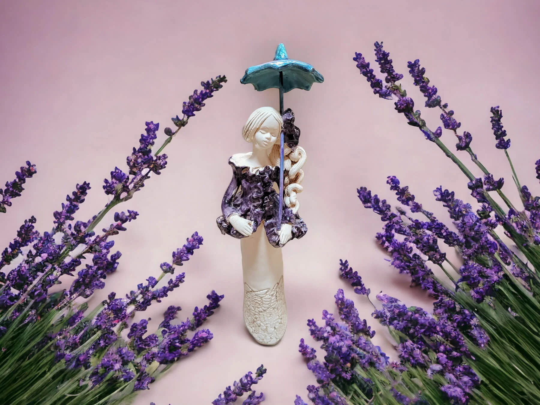 Anioł Konstancja w kolorze fioletowym to ręcznie wykonana figurka gipsowa. Jej fioletowy strój podkreślają parasolka. Figurka idealnie nadaje się na prezent na dziewczynki lub kobiety jak piękna ozdoba wnętrza.