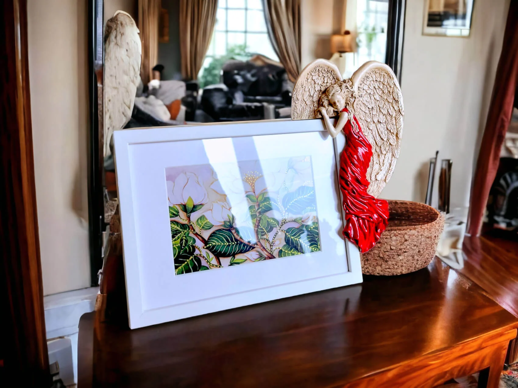 Anioł Andrea w kolorze czerewonym w komplecie z prostą nowoczesną białą ramką z passe - partout.