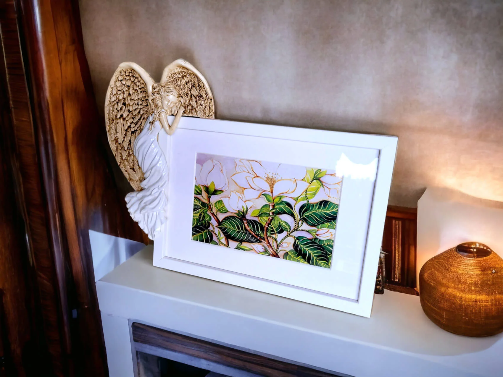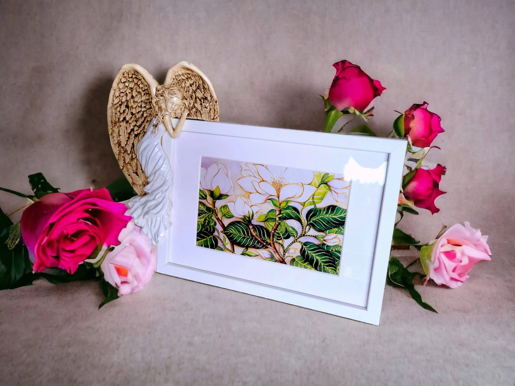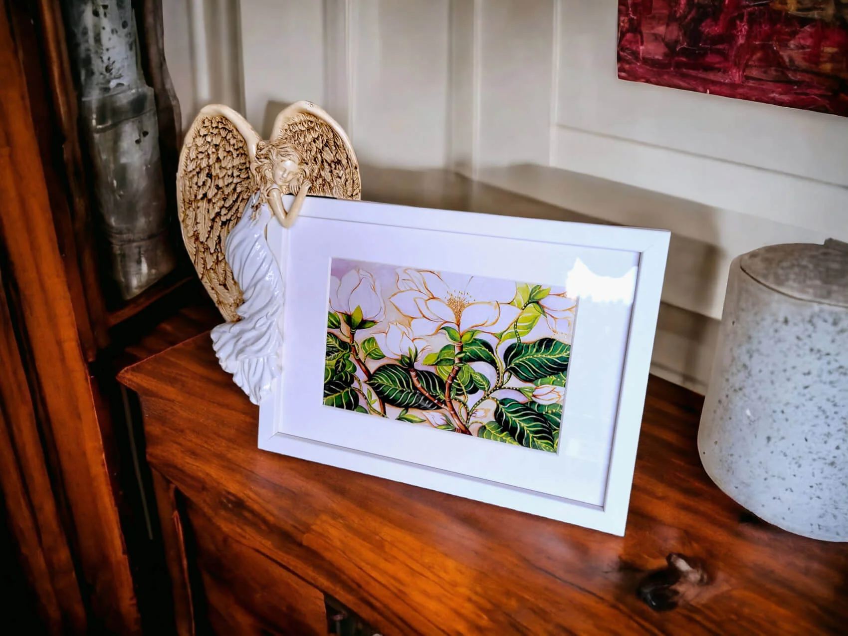 Anioł Andrea w kolorze czerewonym w komplecie z prostą nowoczesną białą ramką z passe - partout.