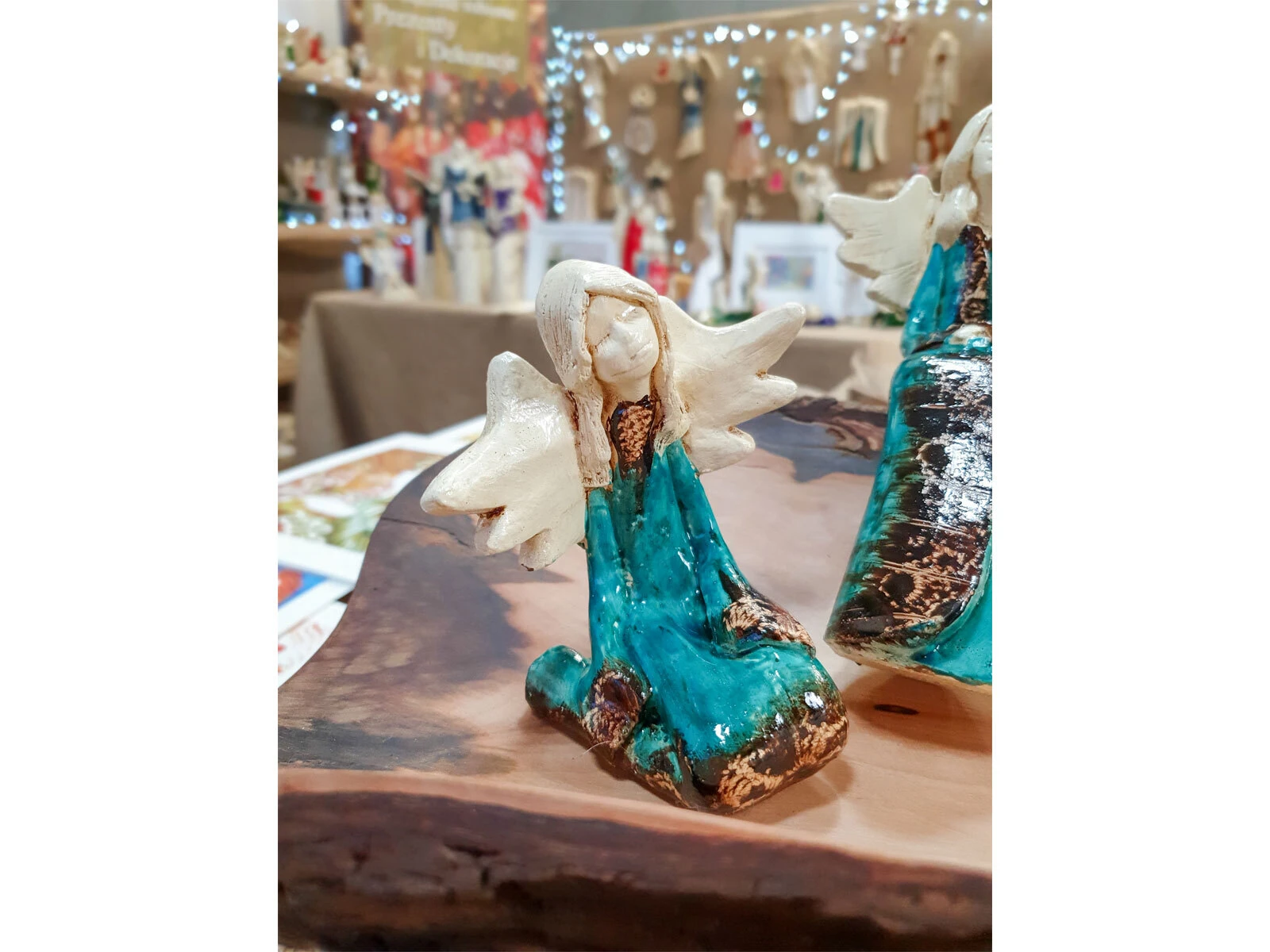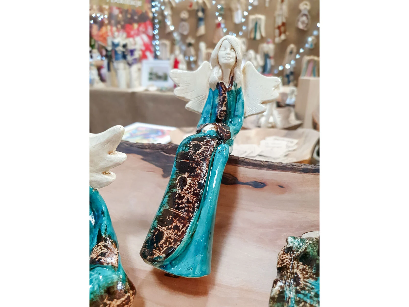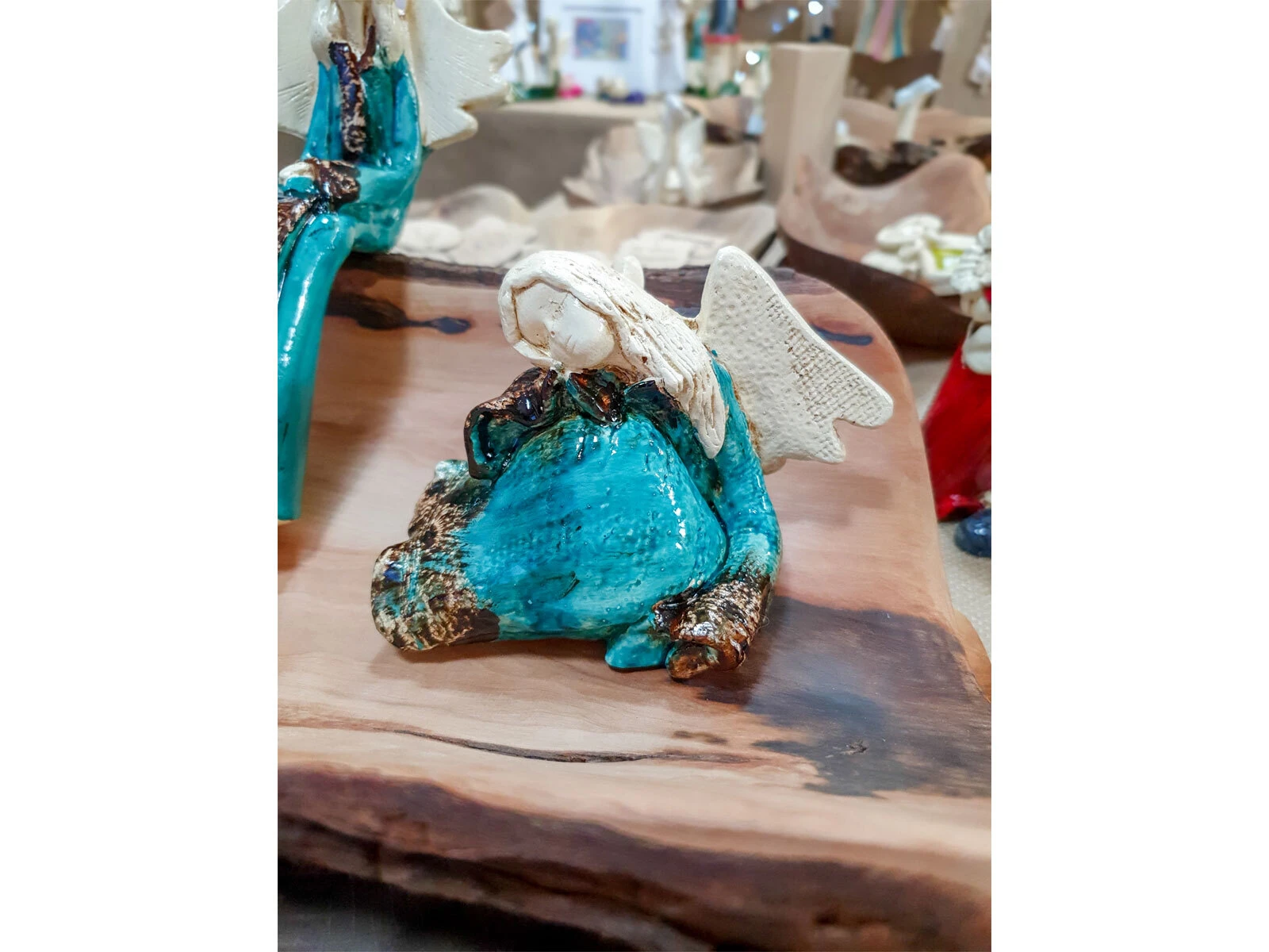 Komplet trzech turkusowych, ręcznie robionych i malowanych aniołków gipsowych. Wyjątkowe aniołki mają przepiękne, turkusowe suknie z efektownymi, brązowymi zdobieniami. Jasne elementy na brązowym tle wyglądają jak utkane wzory. To świetny kontrast do białych włosów i skrzydeł. Taka dekoracja w salonie od razu zwróci uwagę i zachwyci gości, a domowników będzie cieszyć niezwykłym ciepłem i spokojem. Wszystkie aniołki to siedzące figurki, jedna ma opuszczone nogi i można ją umieścić na wyższych elementach czy krawędziach. Ręcznie robione aniołki można postawić osobno, ale pięknie też wyglądają razem.
