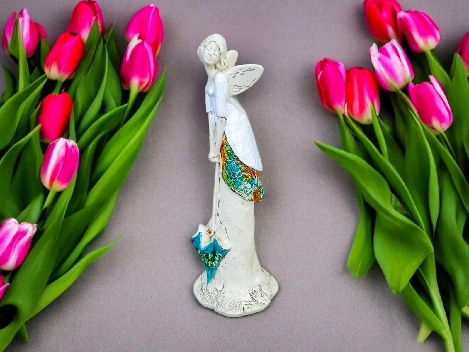 Annabel uwielbia wiosnę. Ten moment gdy wszystko budzi się do życia, zielenieje. W koło niej zawsze latają motyle albo jaskółki. Jest zawsze rozmarzona i chętnie nuci wesołe melodie. Jest tyle w niej optymizmu, że trudno się smucić. Annabel to Anioł wywołujący uśmiech. Wszędzie gdzie będzie stała wniesie trochę słońca, a tym swoim parasolem odgoni złe myśli i złe dni. Znasz kogoś kto się zamartwia i walczy z pesymistycznym postrzeganiem wszystkiego wokoło? Koniecznie opowiedz mu o Annabel albo zamów go u nas, a my go wyślemy.