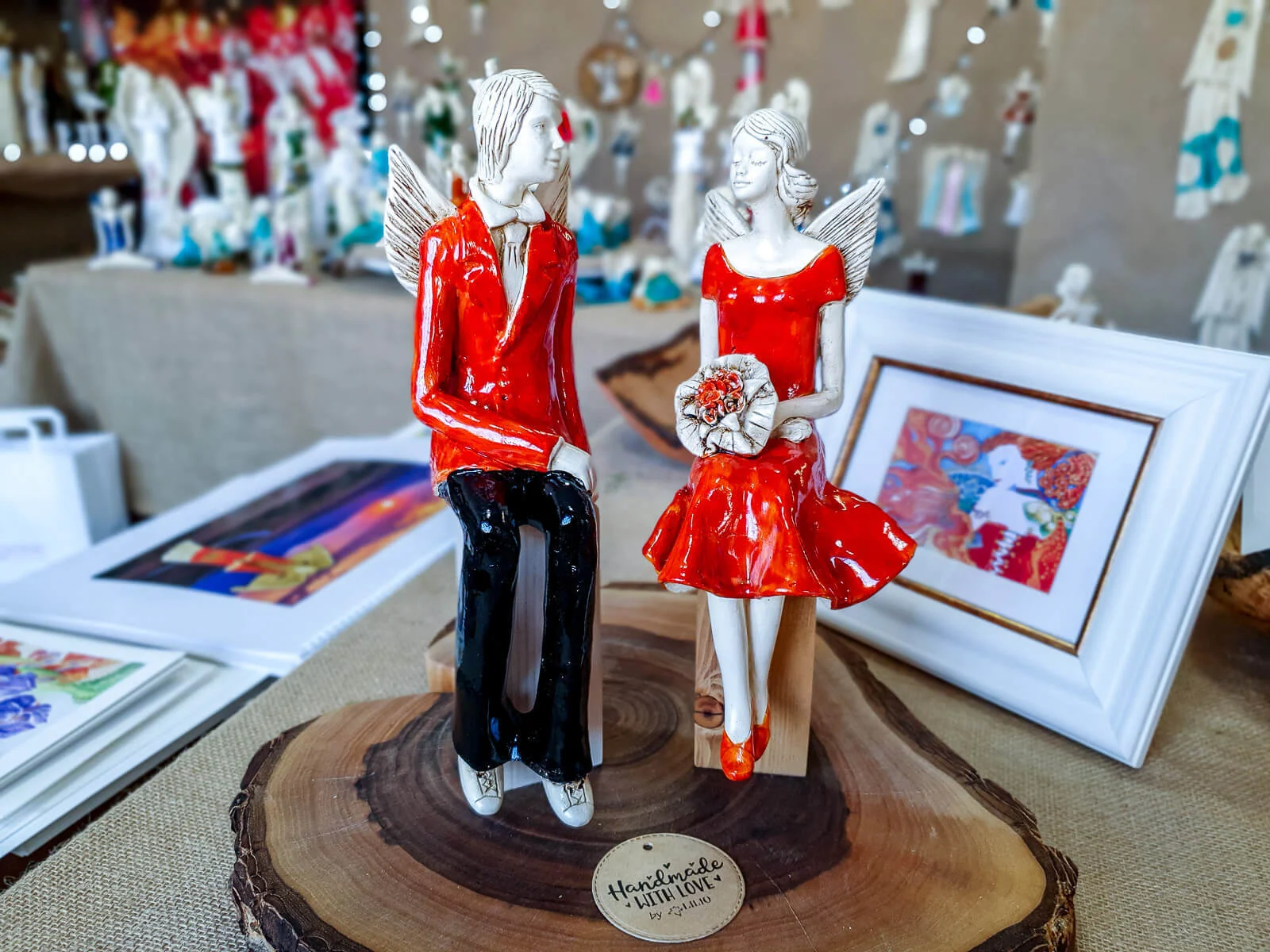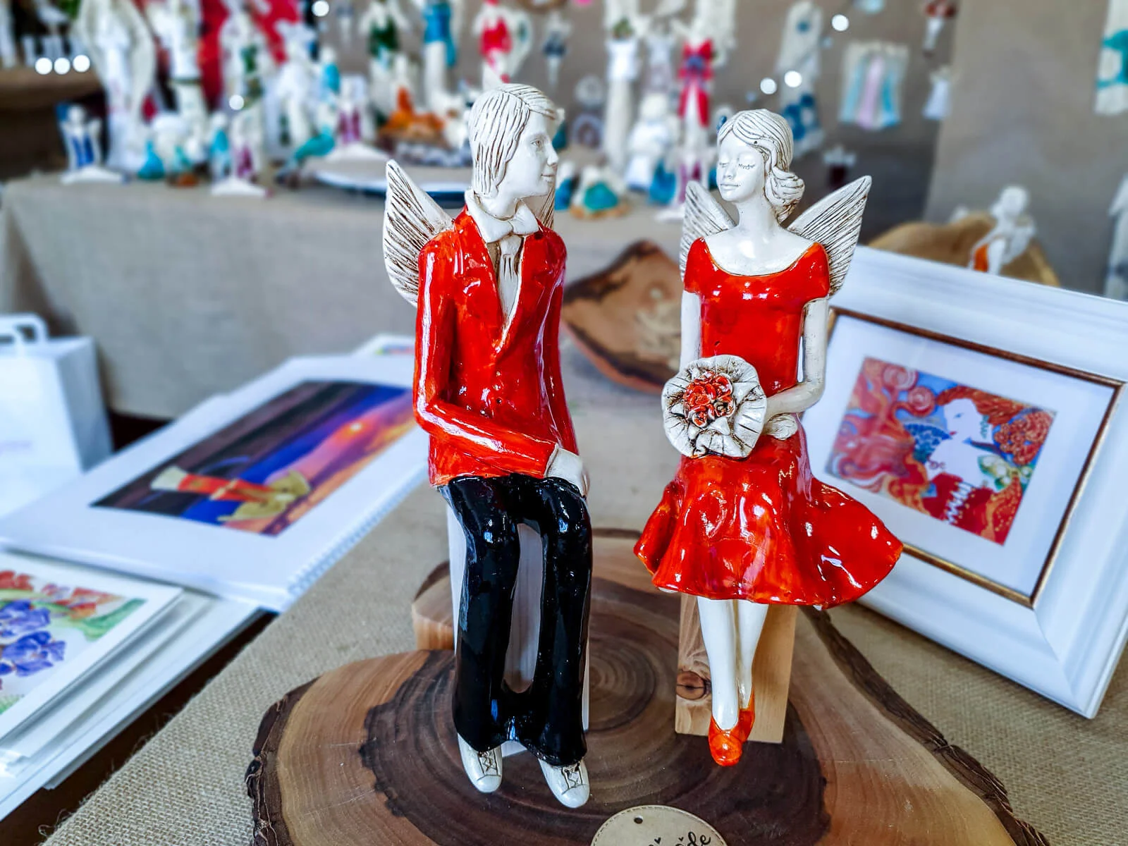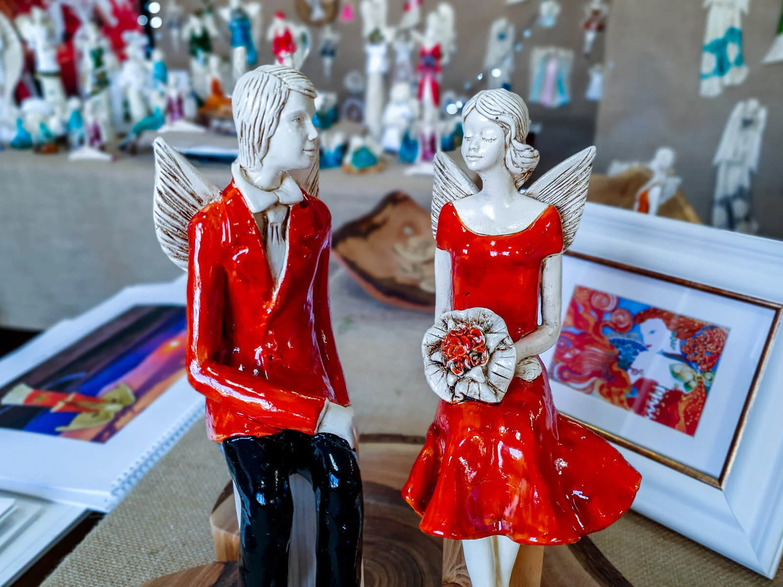 Para ręcznie wykonanych aniołów w pomarańczowym kolorze. Idealne na prezent dla młodej pary. Mogą pięknie ozdobić stół na przyjęciu weselnym.