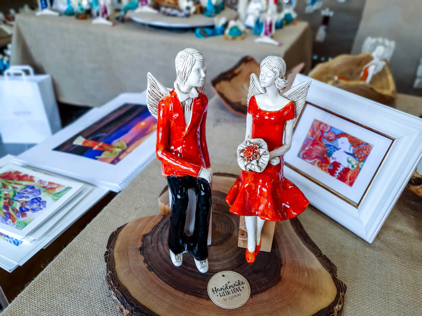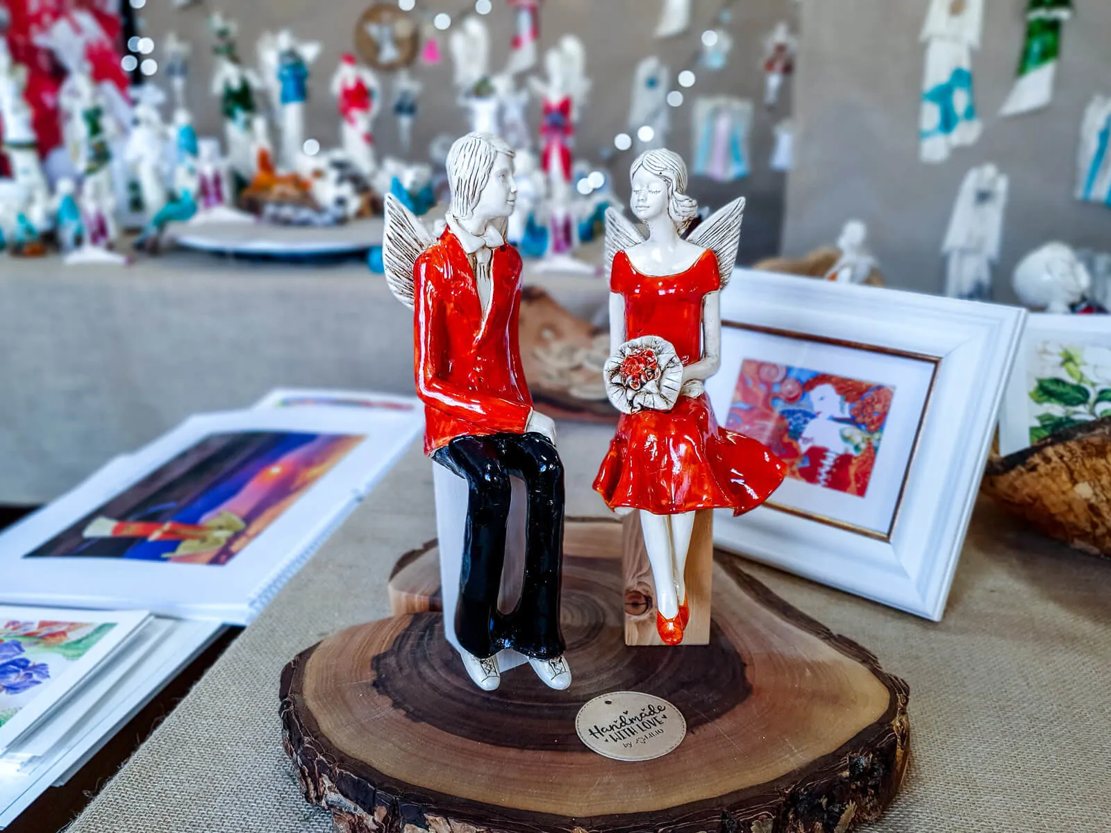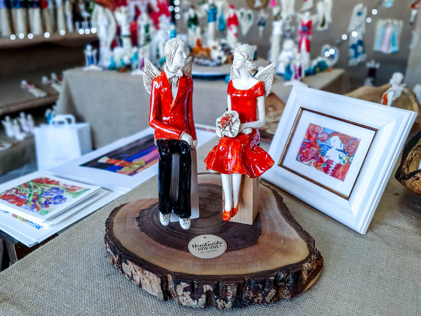 Para ręcznie wykonanych aniołów w pomarańczowym kolorze. Idealne na prezent dla młodej pary. Mogą pięknie ozdobić stół na przyjęciu weselnym.