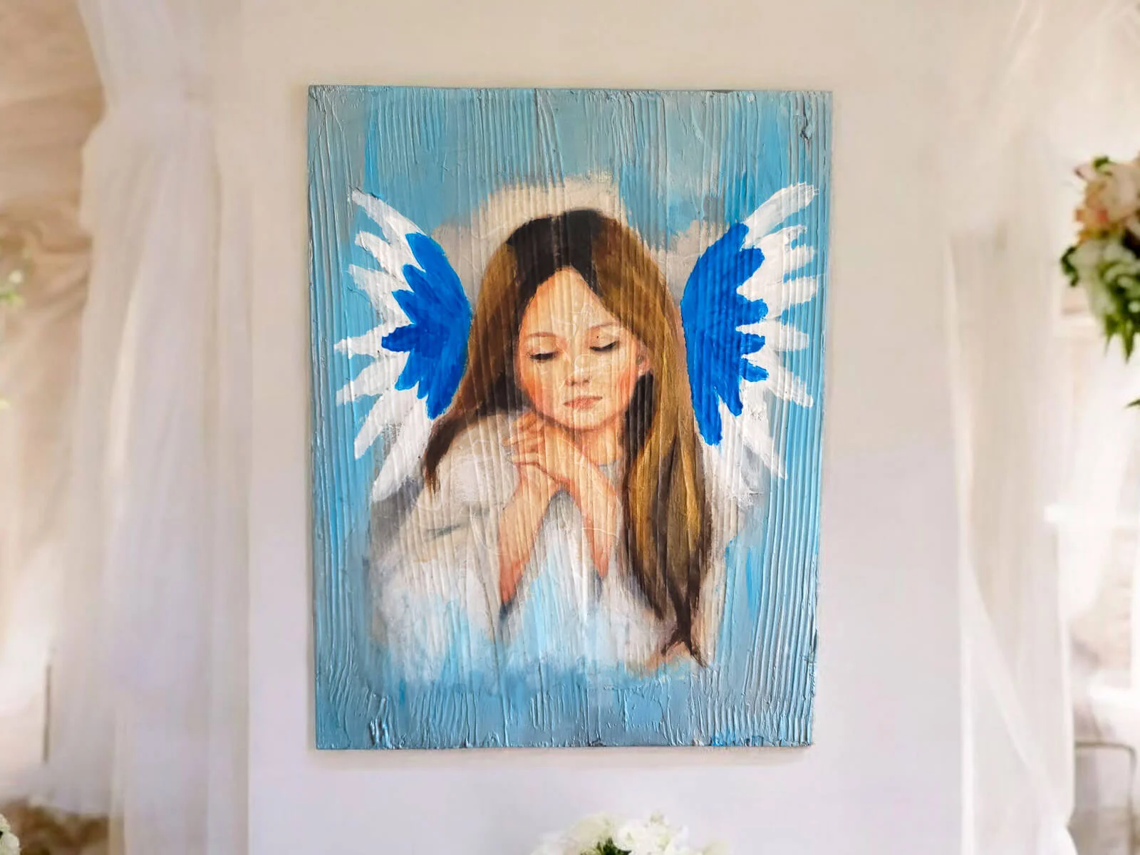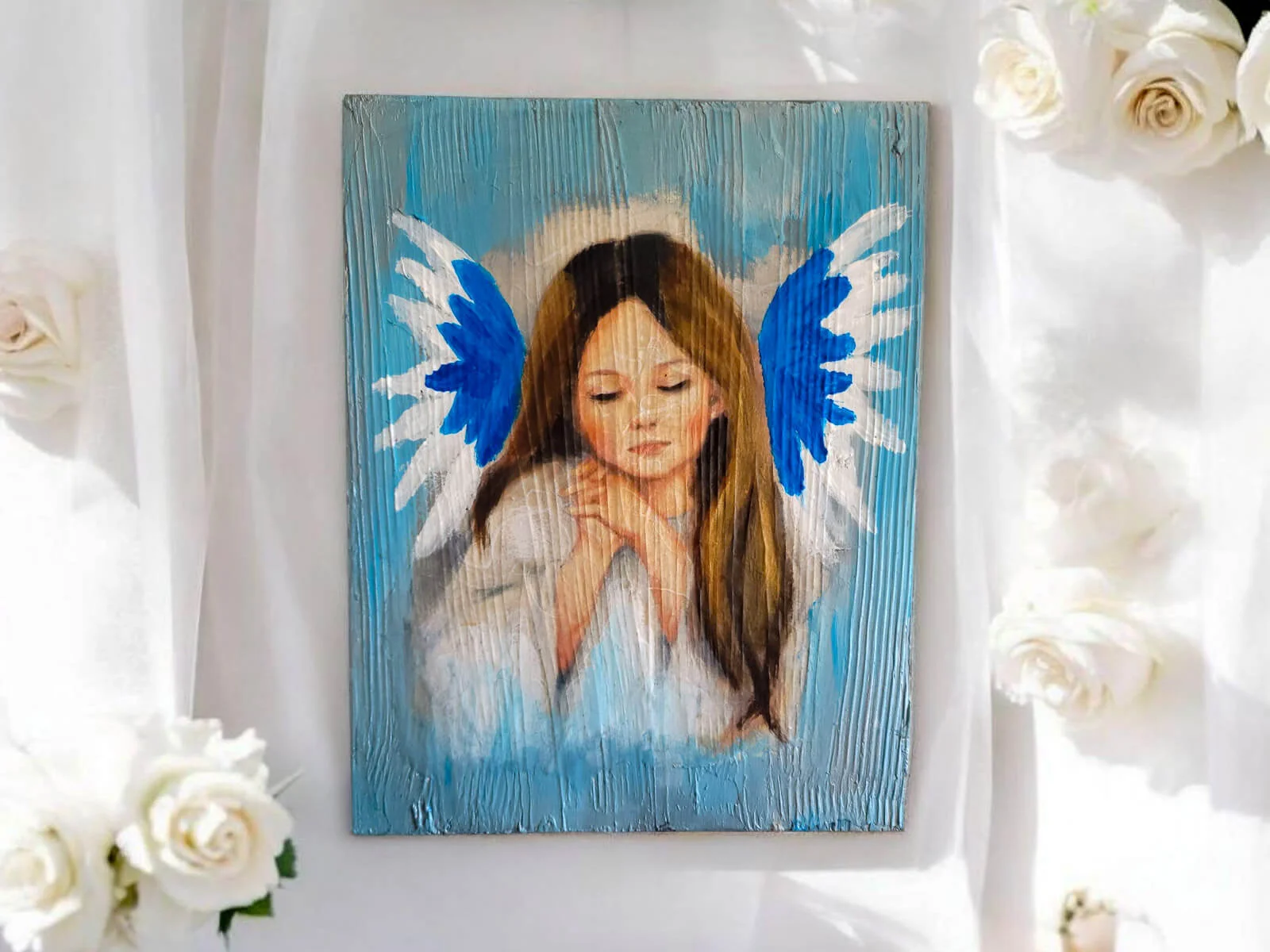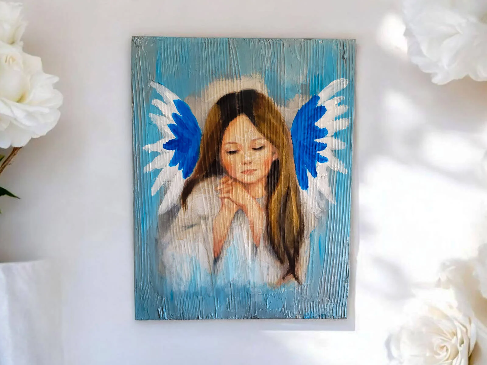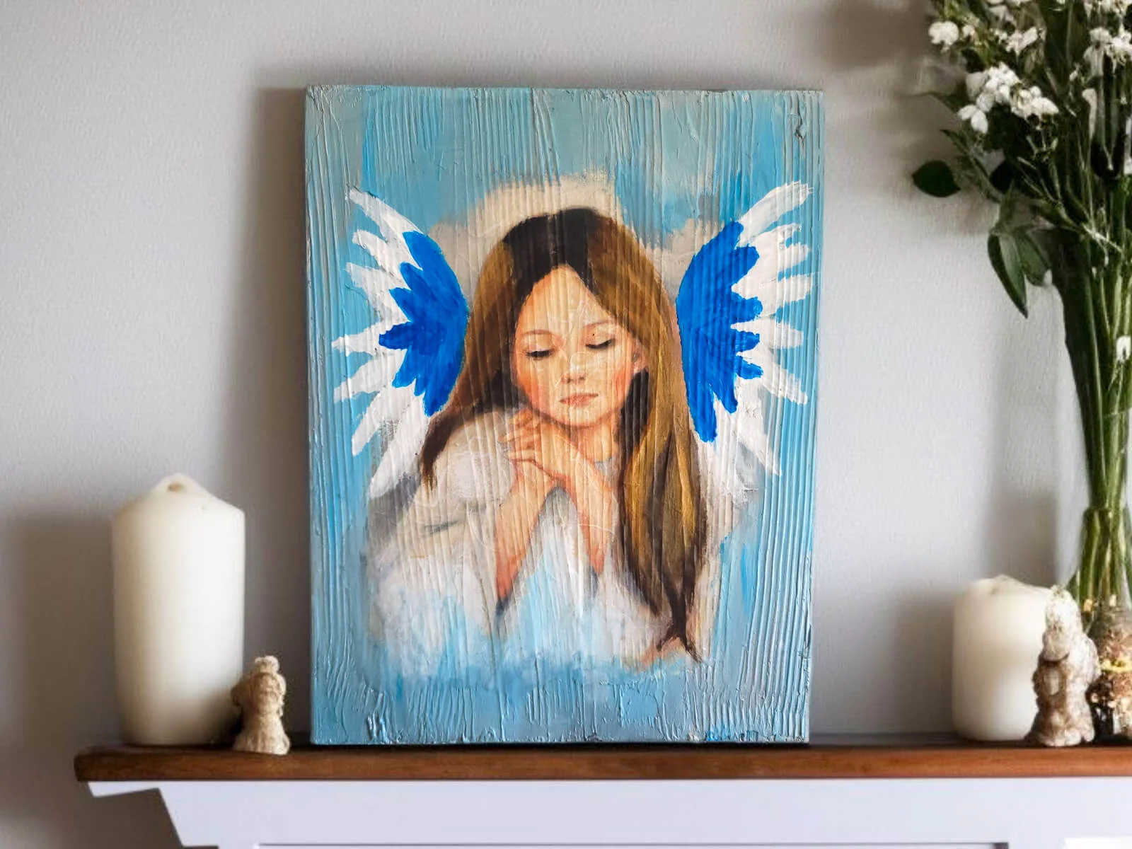 Obraz anioła dziewczynki w białych szatach namalowany na desce - emanuje spokojem, nadzieją i pięknem duchowym. Ten uroczy obraz wykonany jest na desce, co dodaje mu wyjątkowego charakteru.