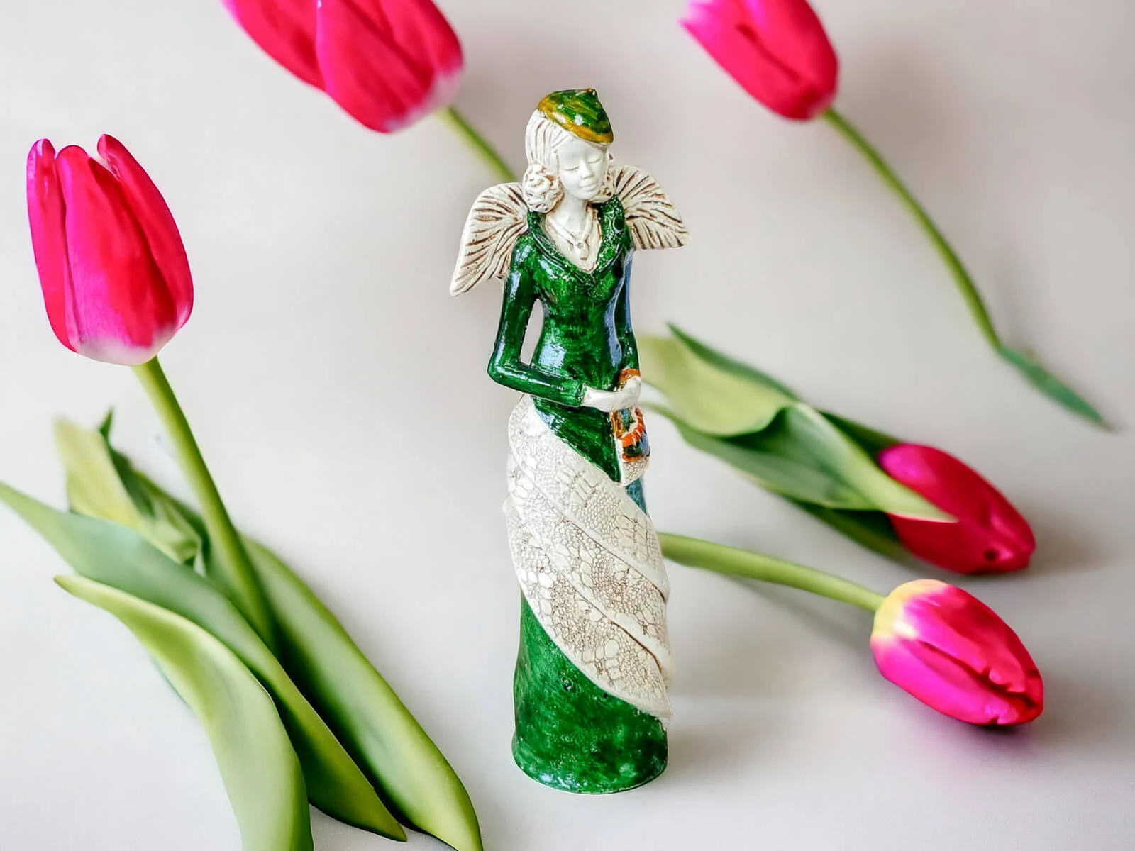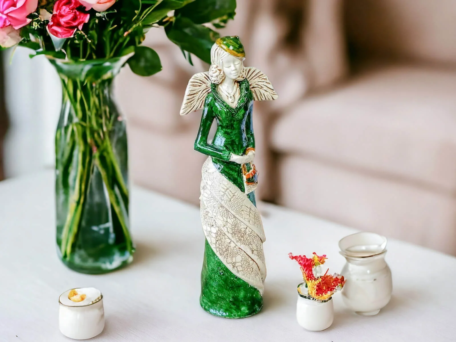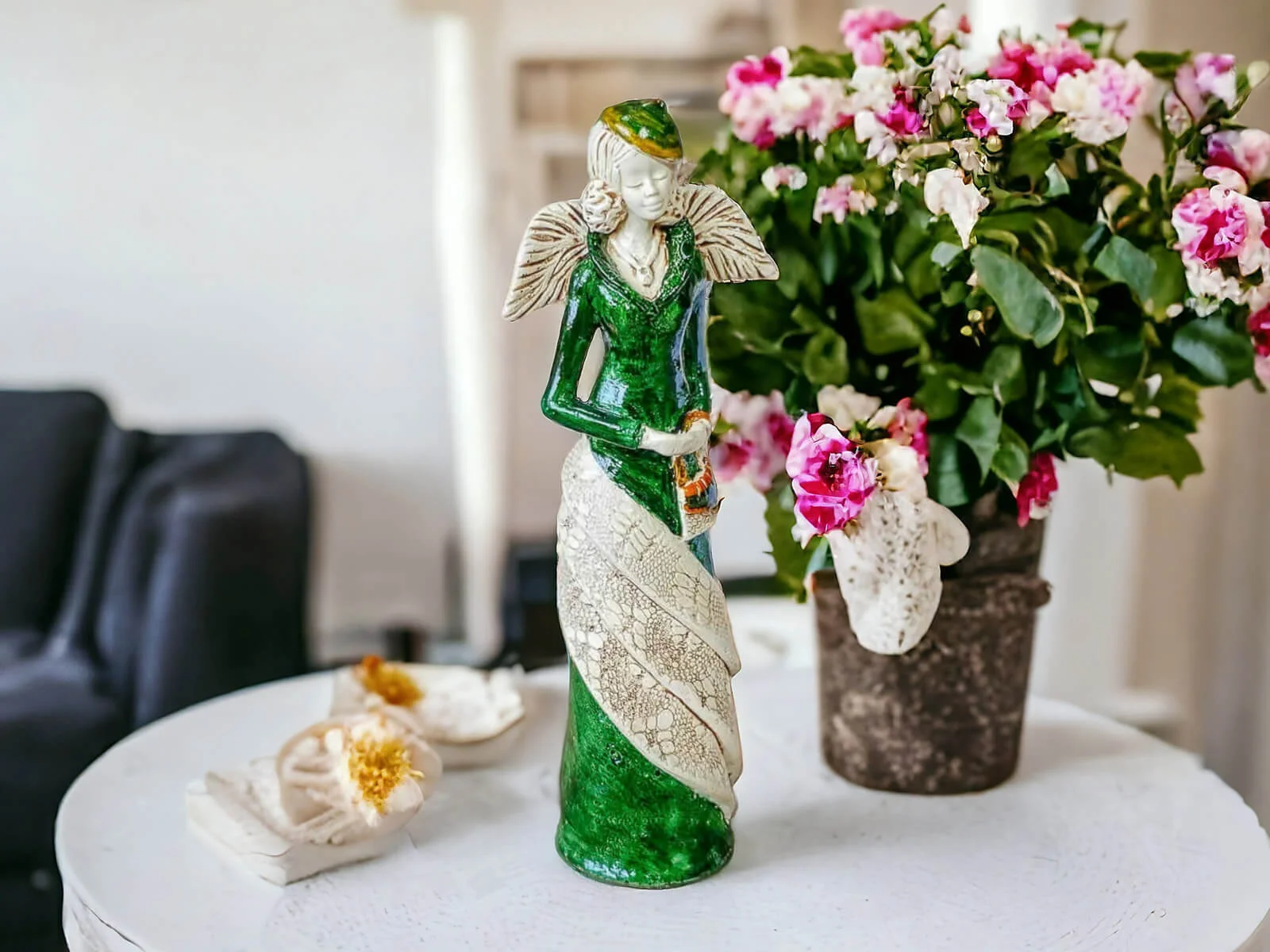 Charlotte w ciemno zielonej sukni. Uwielbia wyjścia do teatru i do kina. Podróżuje po całym świecie i podziwia architekturę miast. Kolekcjonuje śnieżne kule z miejsc, w których już była. Pomoże uleczyć duszę. Z pewnością przypomni jak używa się skrzydeł i jak się lata. Anioł, który przyda się w każdym domu, i każdym biurze. Przywróci wiarę we własne siły, pomoże w walce o lepszy czas. Charlotte jak nikt potrafi podziękować za wszystko. Jeśli chcesz komuś podziękować podaruj mu tego Anioła.