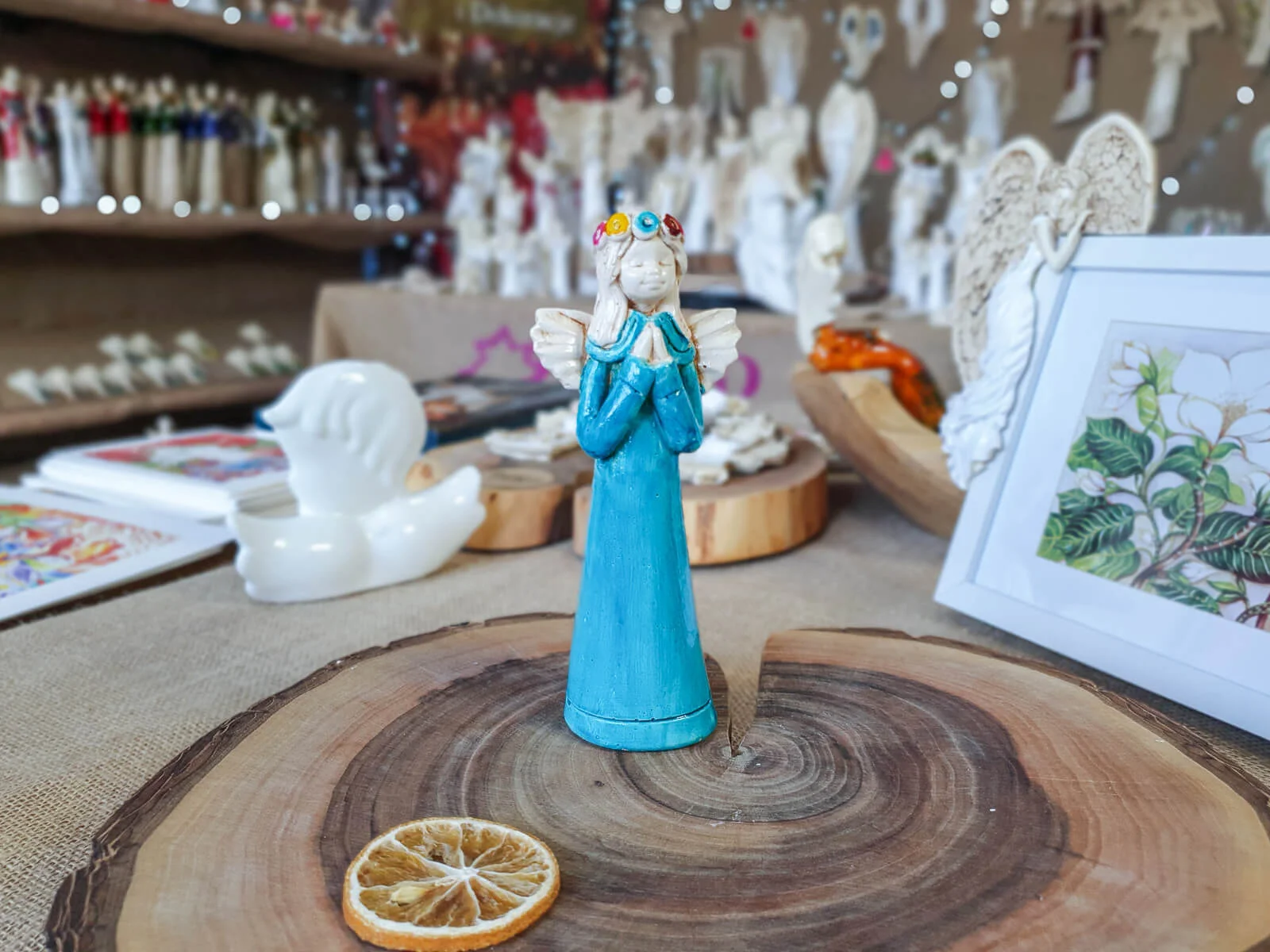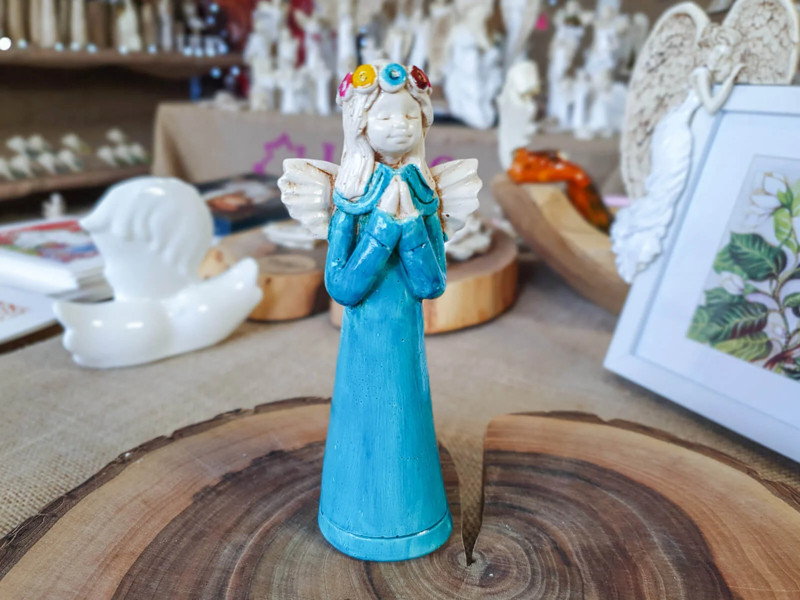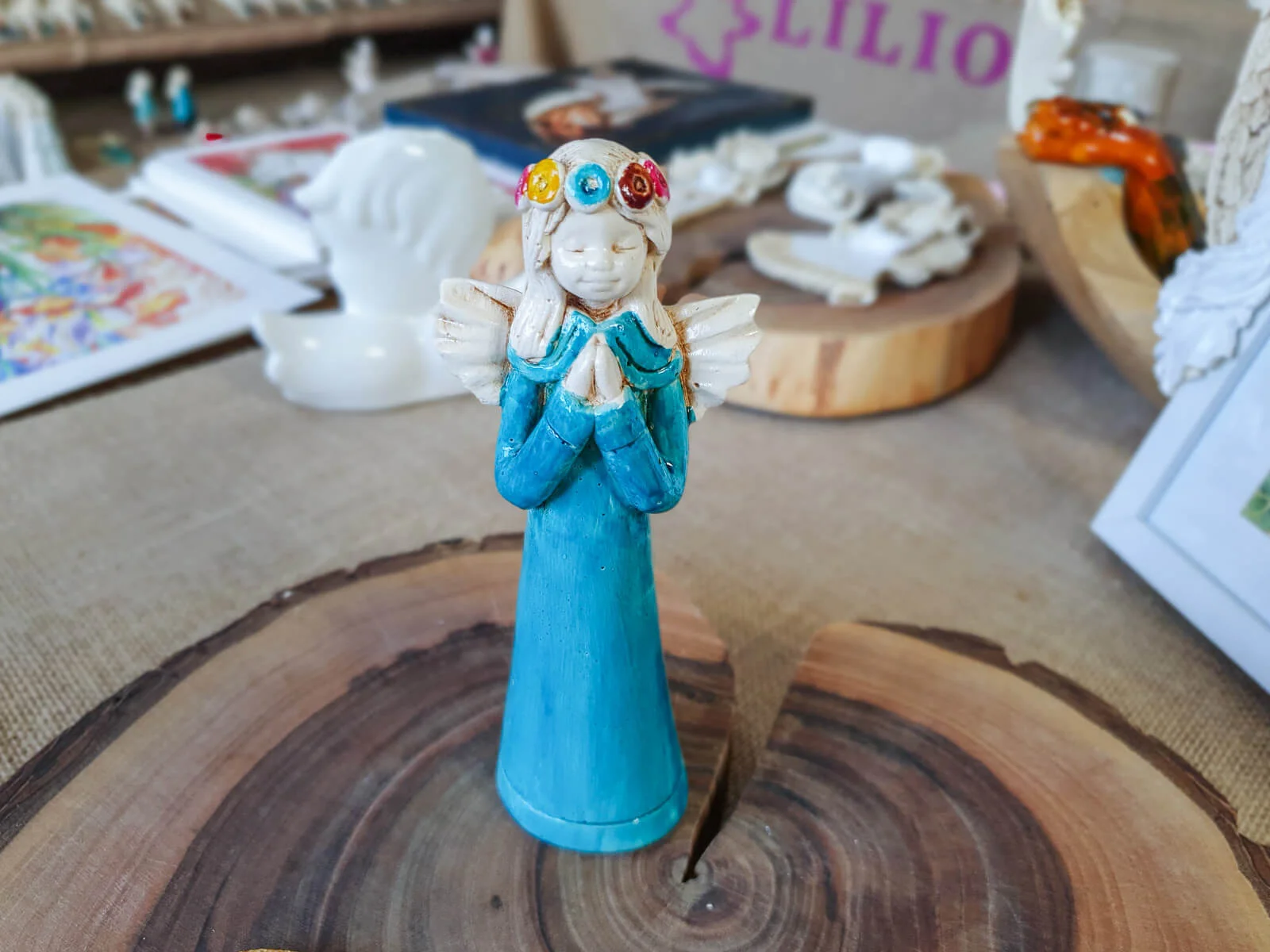 Aniołek Eva to urocza figurka dziewczynki w turkusowej sukience, która delikatnie opada wzdłuż jej małego ciała, emanuje czystością i niewinnością. Na główce ma wianek spleciony z delikatnych kwiatów, które podkreślają jej anielski urok. Jej ręce złożone w modlitwie wyrażają spokój i pokorę.
