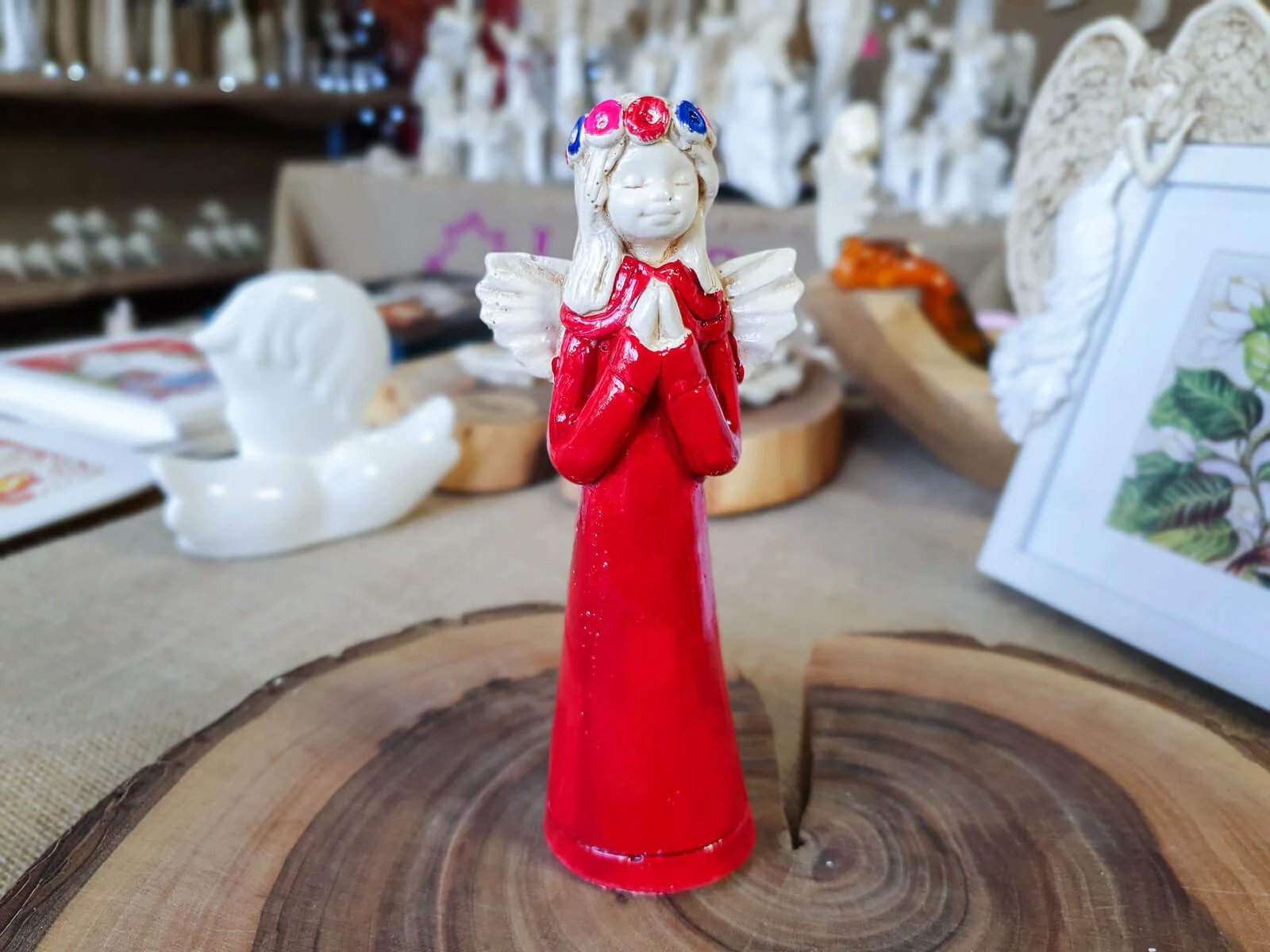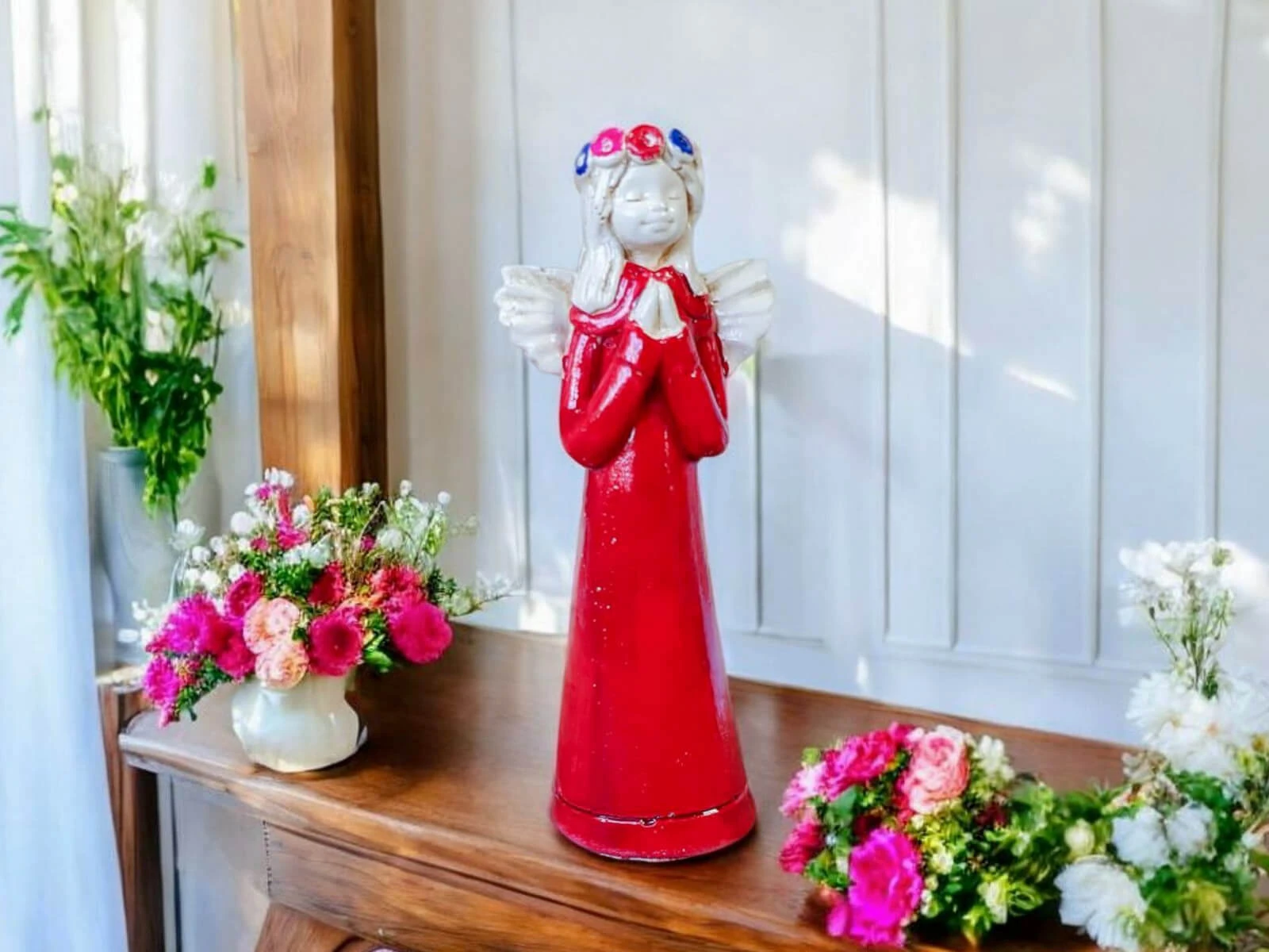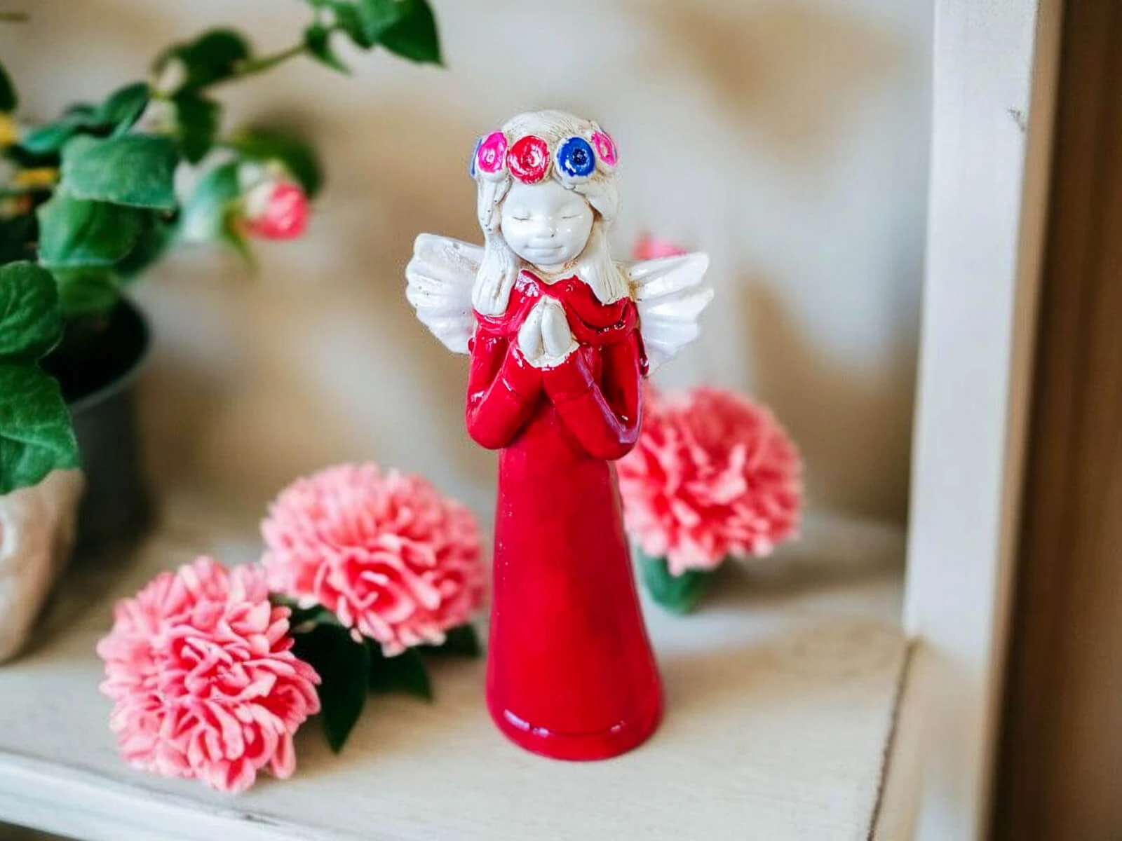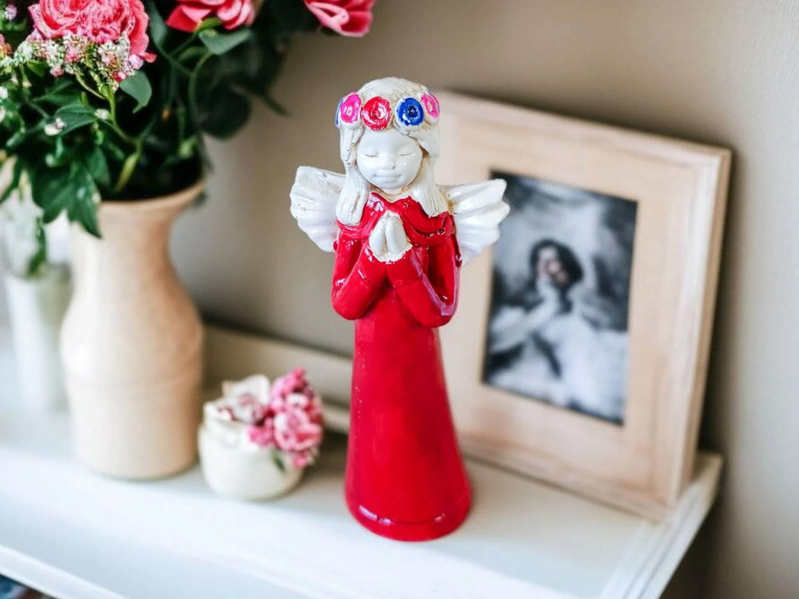 Aniołek Eva to urocza figurka dziewczynki w czerwonej sukience, która delikatnie opada wzdłuż jej małego ciała, emanuje czystością i niewinnością. Na główce ma wianek spleciony z delikatnych kwiatów, które podkreślają jej anielski urok. Jej ręce złożone w modlitwie wyrażają spokój i pokorę.