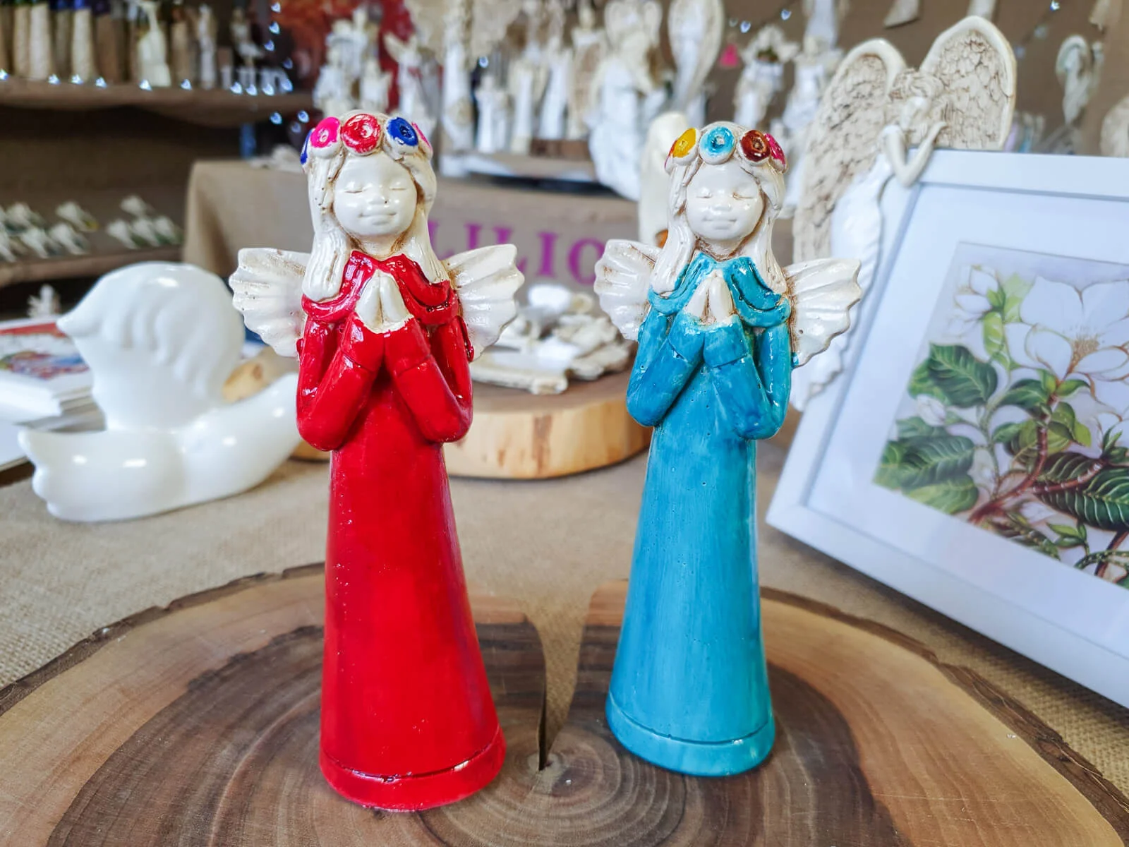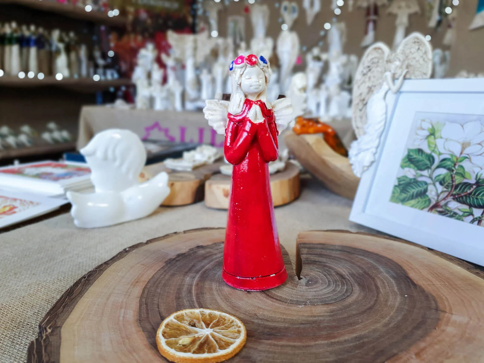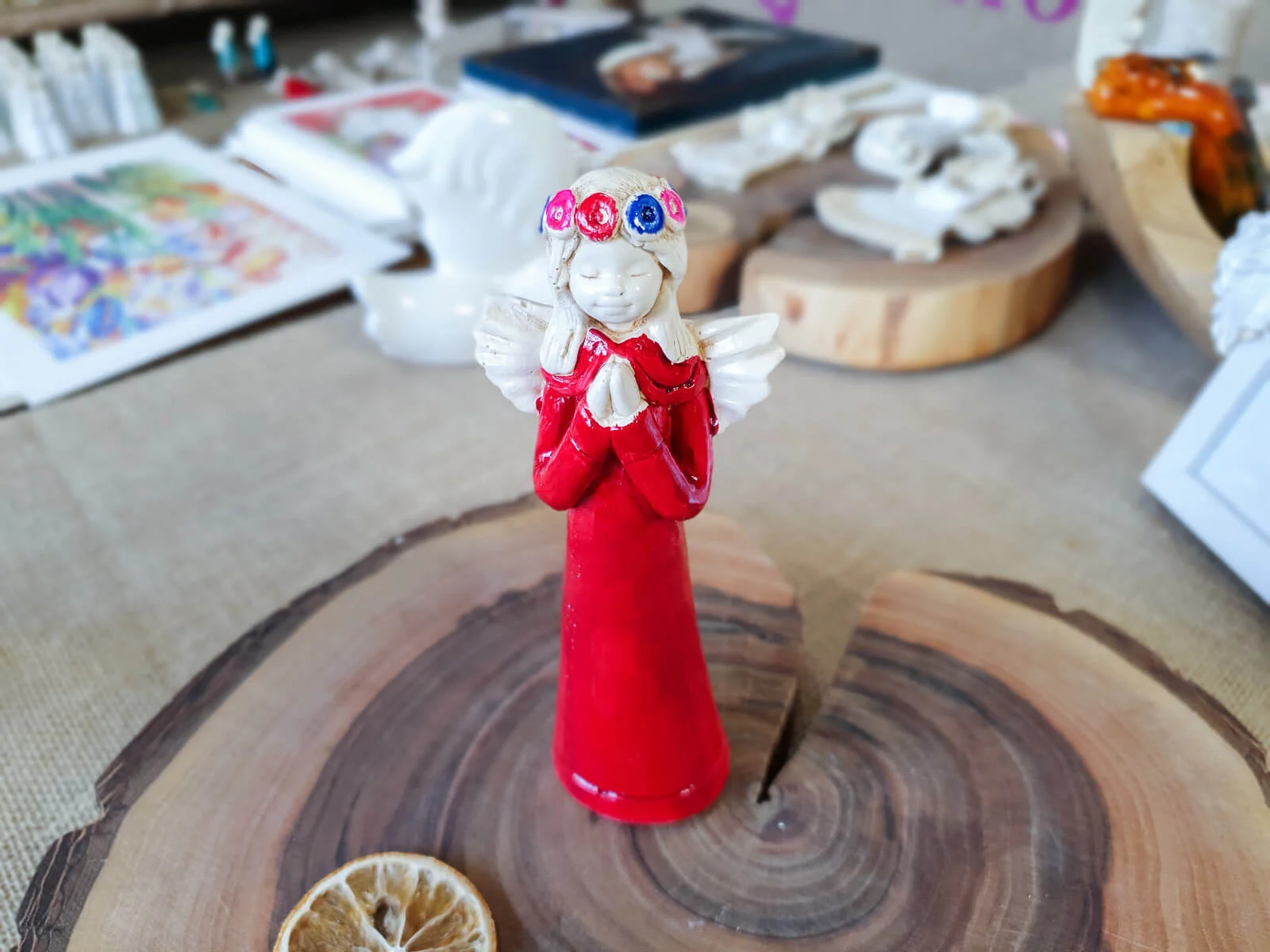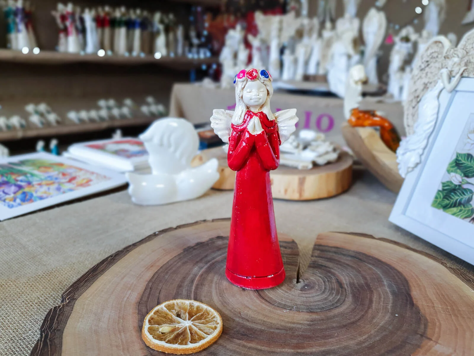 Aniołek Eva to urocza figurka dziewczynki w czerwonej sukience, która delikatnie opada wzdłuż jej małego ciała, emanuje czystością i niewinnością. Na główce ma wianek spleciony z delikatnych kwiatów, które podkreślają jej anielski urok. Jej ręce złożone w modlitwie wyrażają spokój i pokorę.