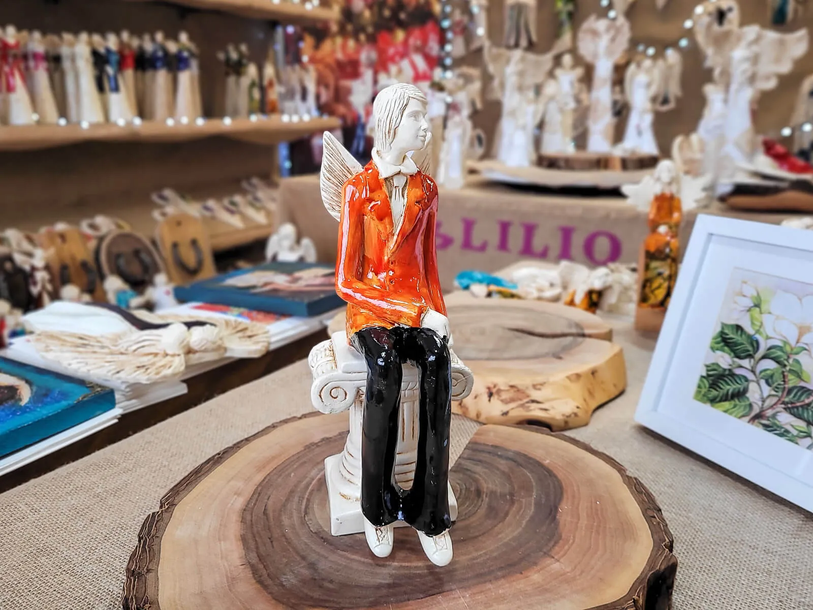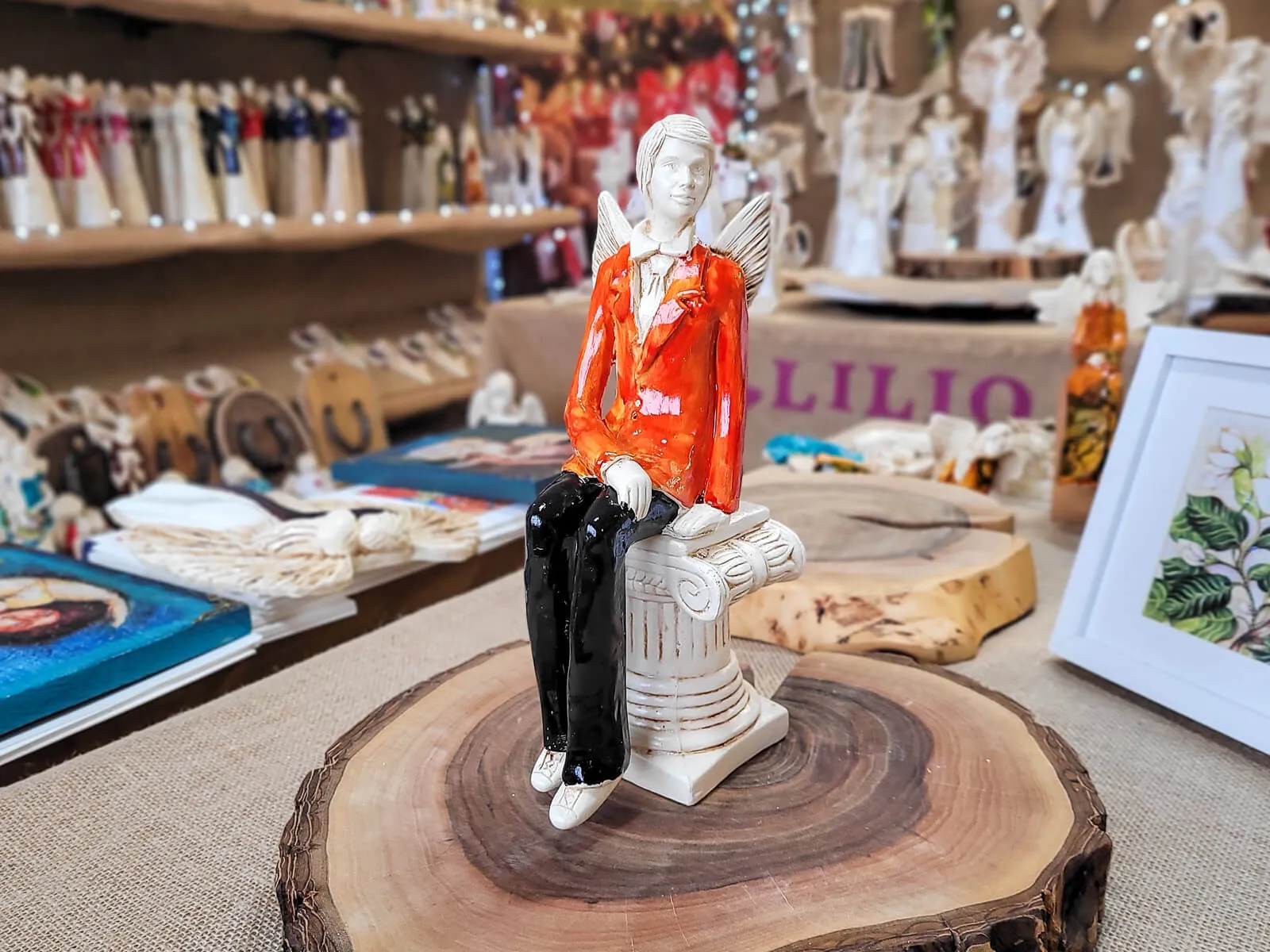 Anioły Młoda Para to ręcznie wykonana figurka. Czekają na ceremonię ślubną. Pan Młody ubrany jest w pomarańczowy garnitur. Panna Młoda ma na sobie krótką, pomarańczową sukienkę. W ręku trzyma bukiet z róż. Anioły są świetny pomysłem na prezent ślubny lub dekorację ślubną. Pięknie mogą ozdobić stół na przyjęciu weselnym.