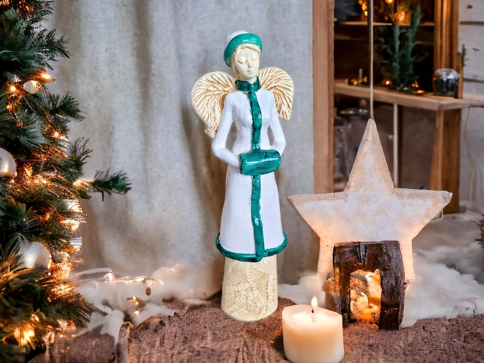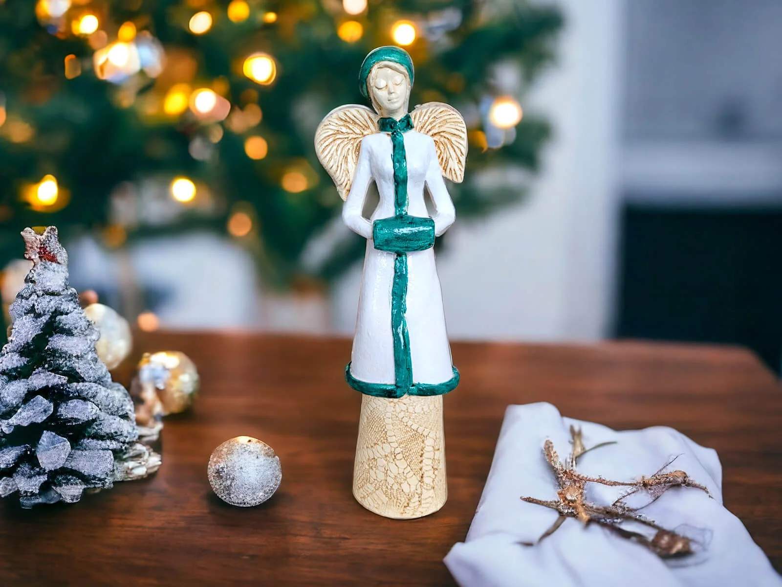 Anioł Gia w biało turkusowym zimowym płaszczu to ręcznie wykonana figurka. Gia jest elegancką damą, prezentującą swój wdzięk i włoski styl. Fascynuje się wszystkim co włoskie. W ten zimowy wieczór wybiera się na spotkanie. Na głowie ma elegancki beret. Chętnie służy radą rodzinie i bliskim. Posiada wielu adoratorów. Nie ma żadnych autorytetów, ponieważ sama chce nim pozostać. Idealna jako prezent dla kobiet. Świetnie sprawdzi się jako dekoracja w każdym wnętrzu.