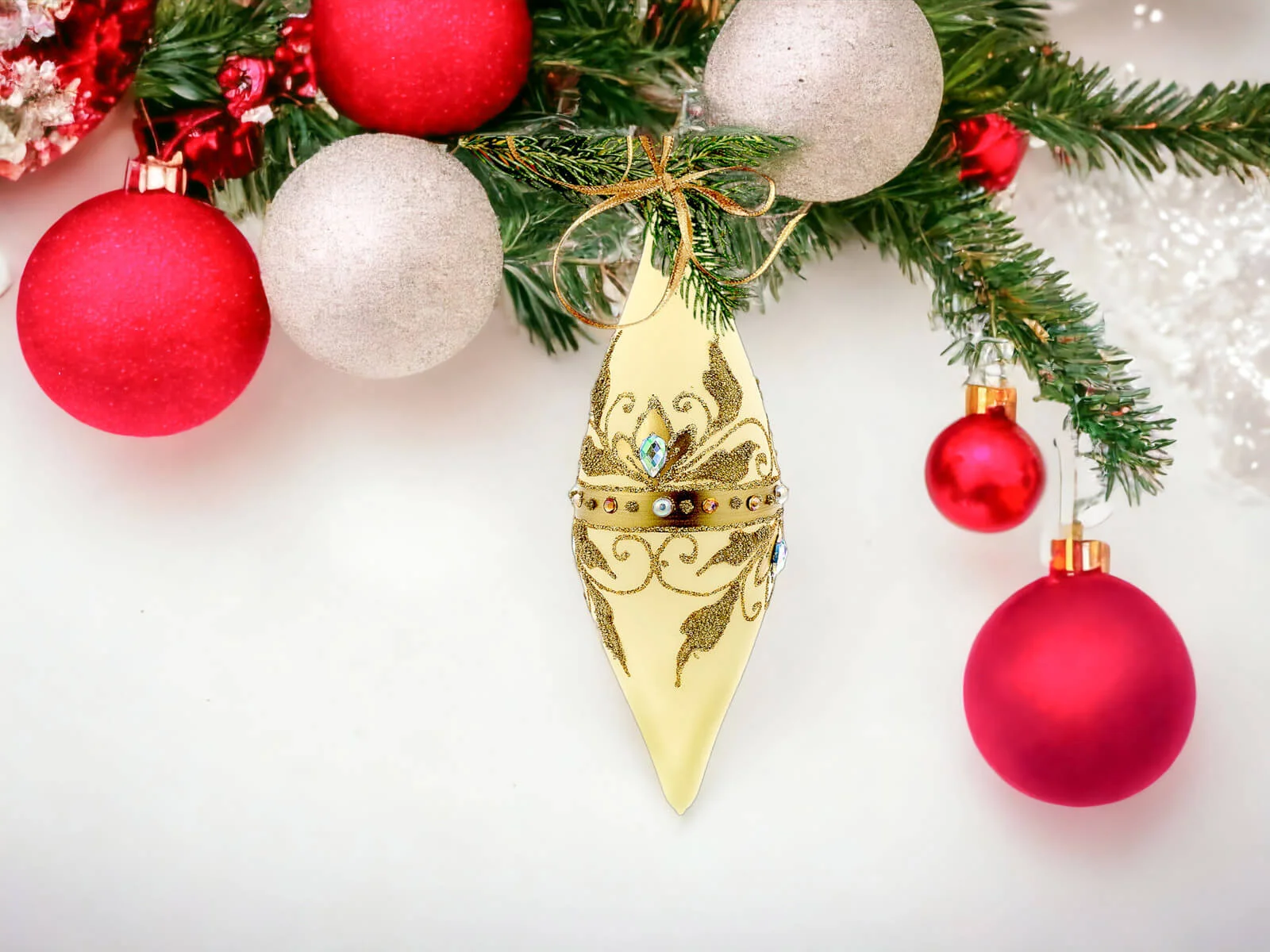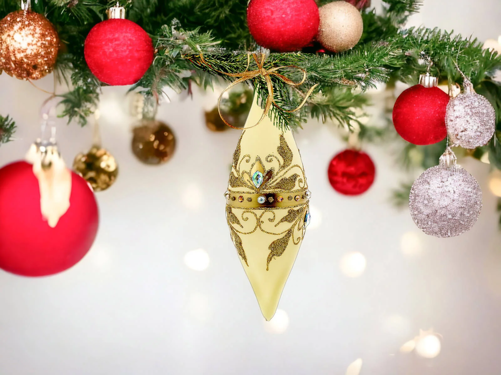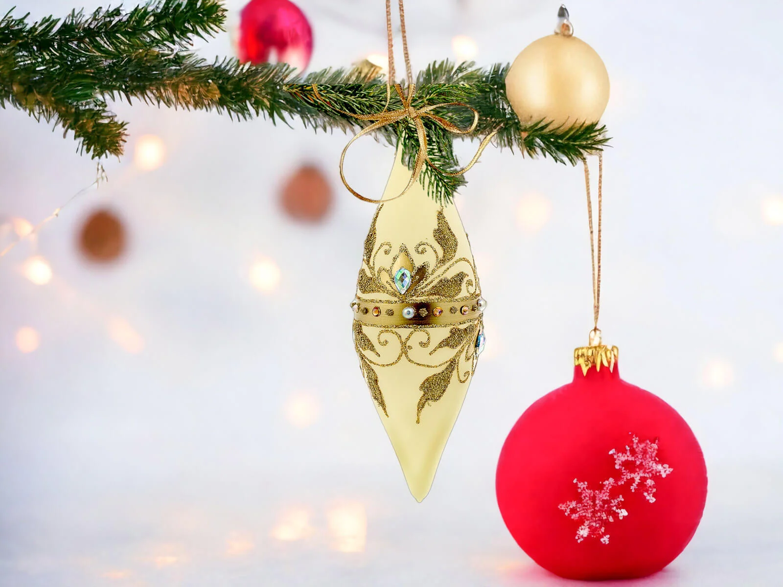 Ciepłe waniliowe tło bombek stanowi idealne podkład dla bogatych, złotych zdobień, które zdobią sople na powierzchni każdej z nich. Złote elementy, precyzyjnie ręcznie nanoszone, nadają bombkom wyjątkowego blasku, tworząc efektowny zestaw, który z pewnością przyciągnie uwagę i stworzy wyjątkowy klimat świąt Bożego Narodzenia.