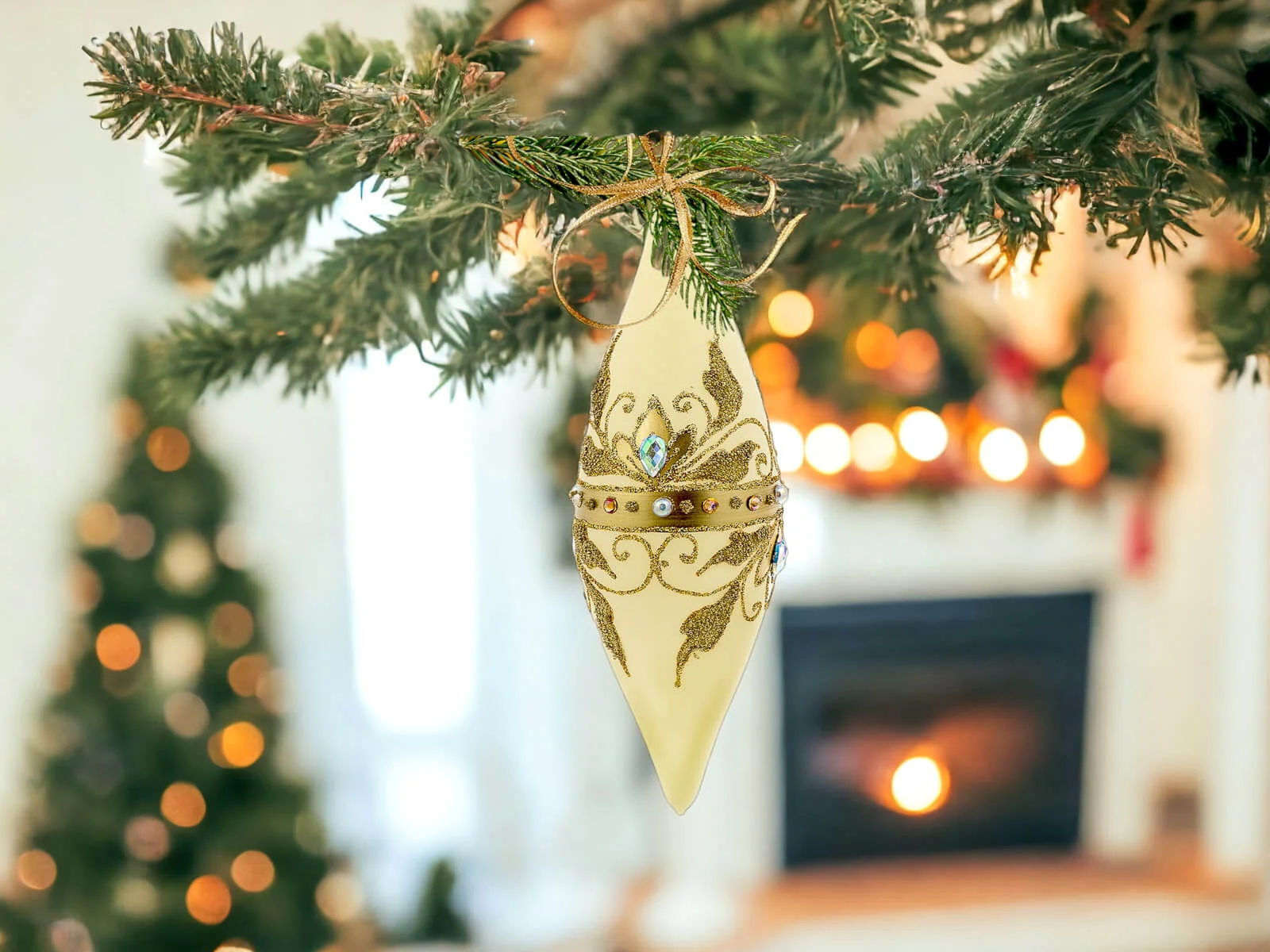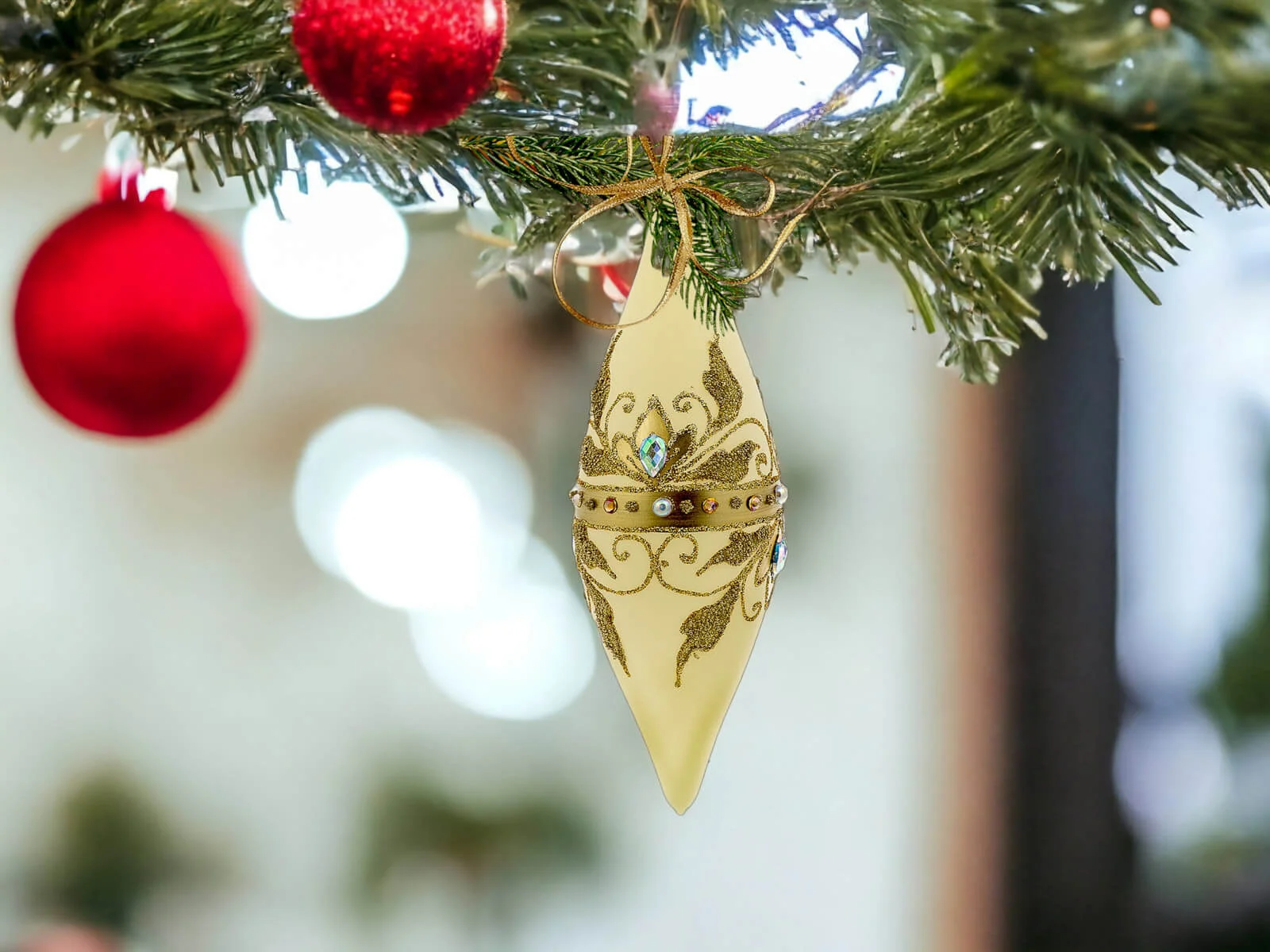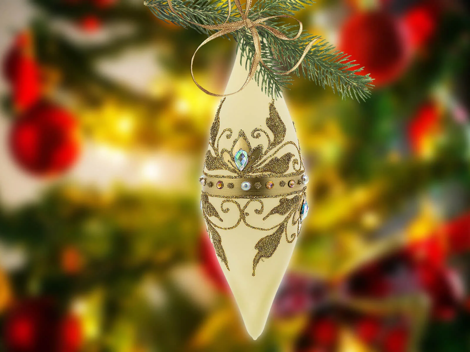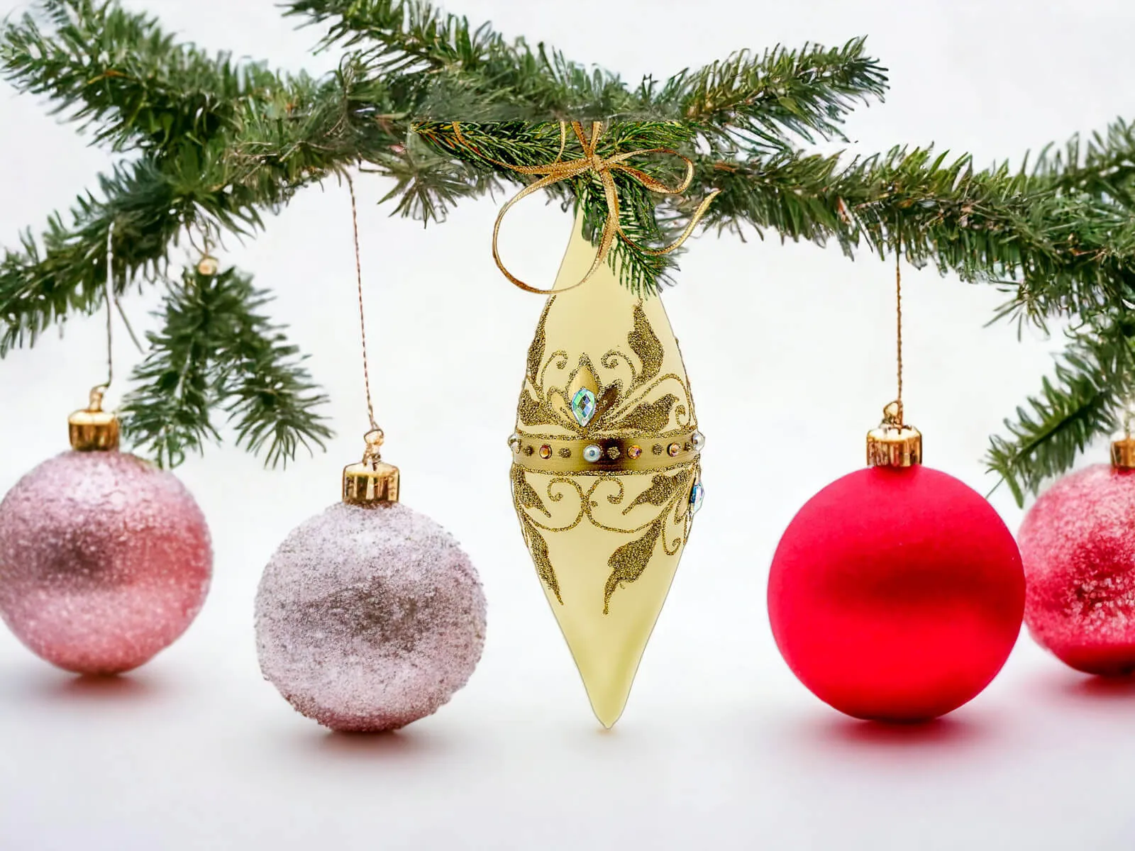 Ciepłe waniliowe tło bombek stanowi idealne podkład dla bogatych, złotych zdobień, które zdobią sople na powierzchni każdej z nich. Złote elementy, precyzyjnie ręcznie nanoszone, nadają bombkom wyjątkowego blasku, tworząc efektowny zestaw, który z pewnością przyciągnie uwagę i stworzy wyjątkowy klimat świąt Bożego Narodzenia.