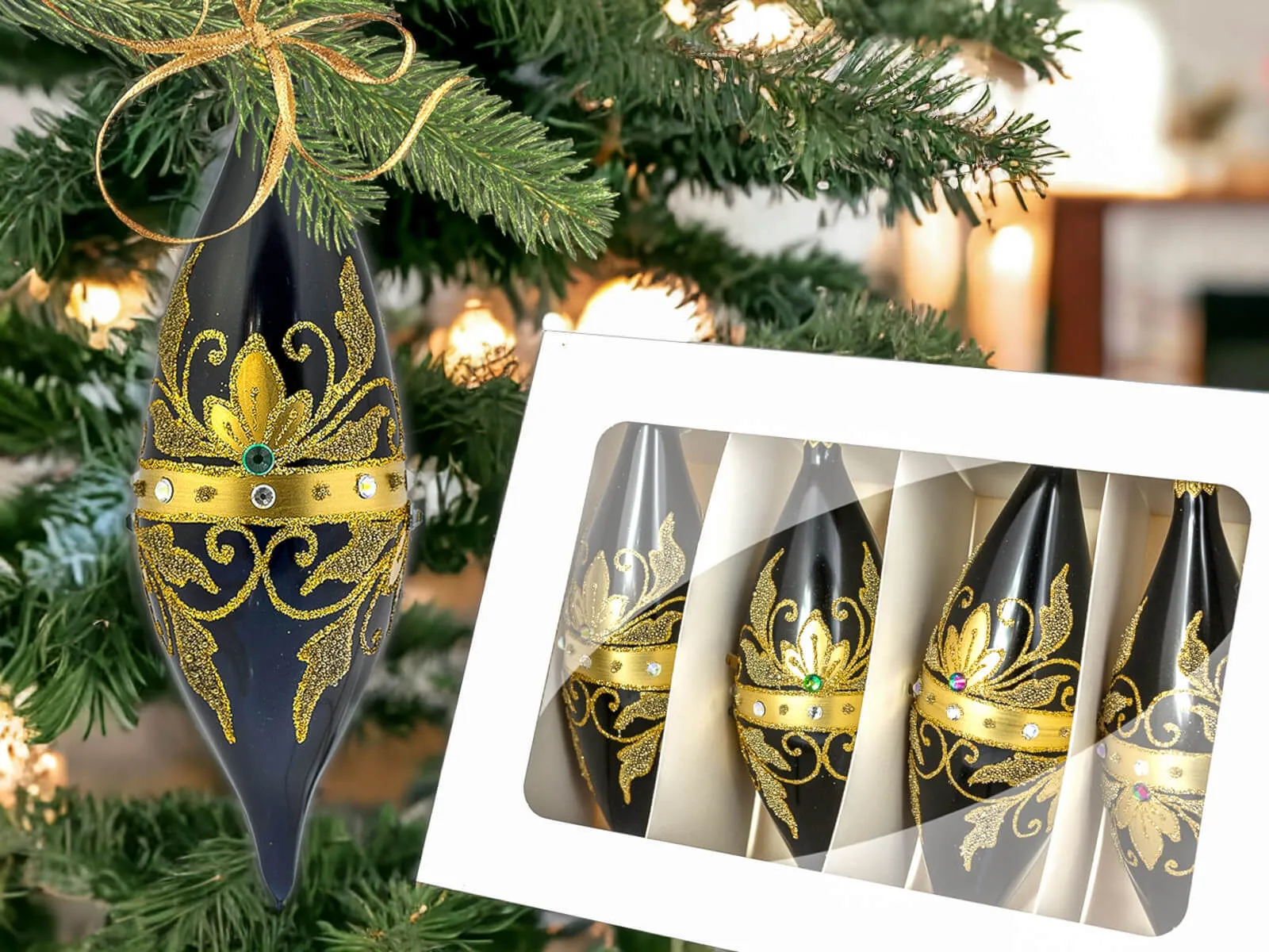 Czarna porcelana stanowi eleganckie tło dla bogatych, złotych zdobień, które zdobią sople na powierzchni każdej z bombek. Złote elementy, precyzyjnie ręcznie nanoszone, nadają bombkom wyjątkowego blasku, tworząc efektowny zestaw, który z pewnością przyciągnie uwagę i stworzy wyjątkowy klimat świąt Bożego Narodzenia.