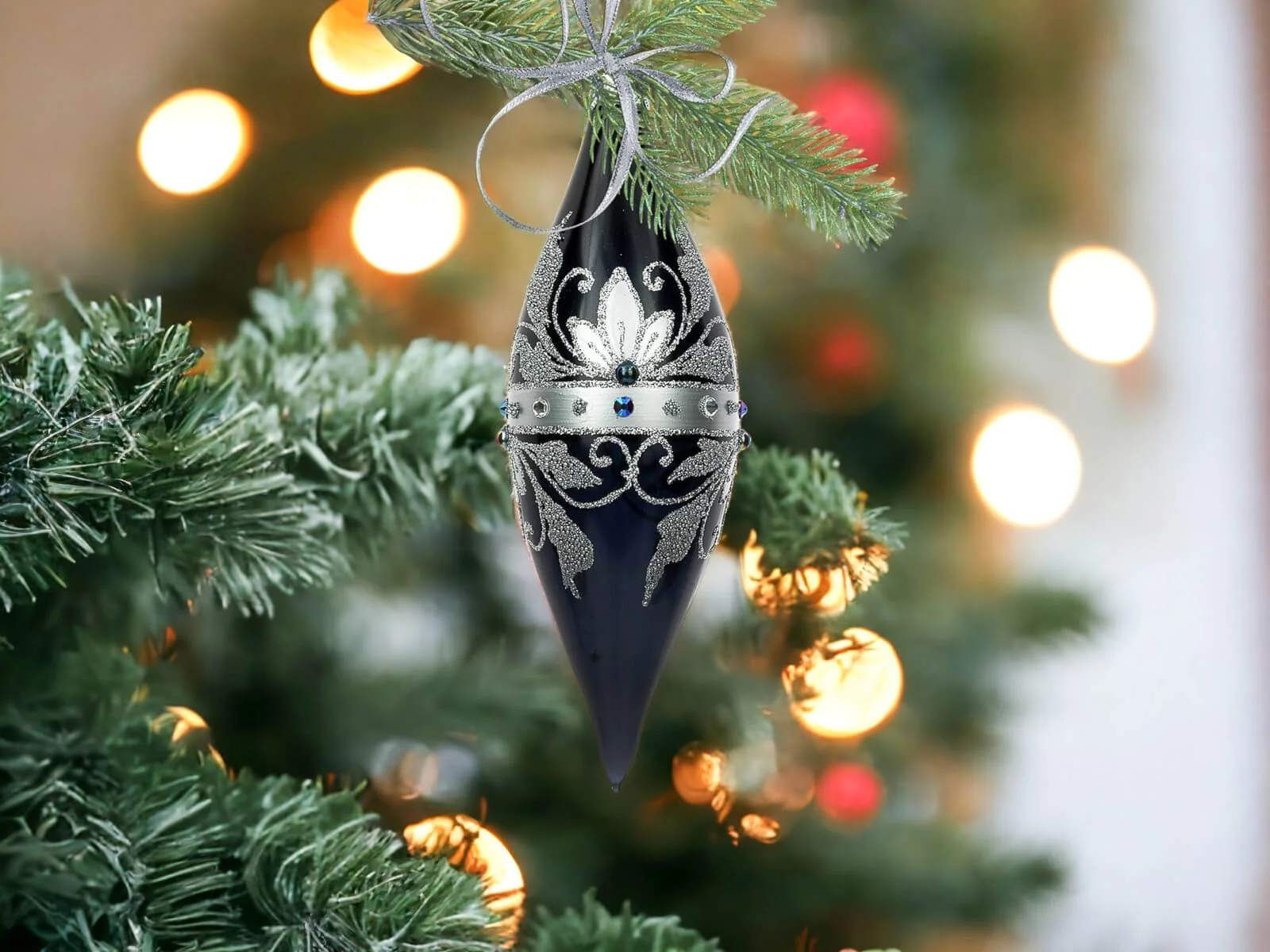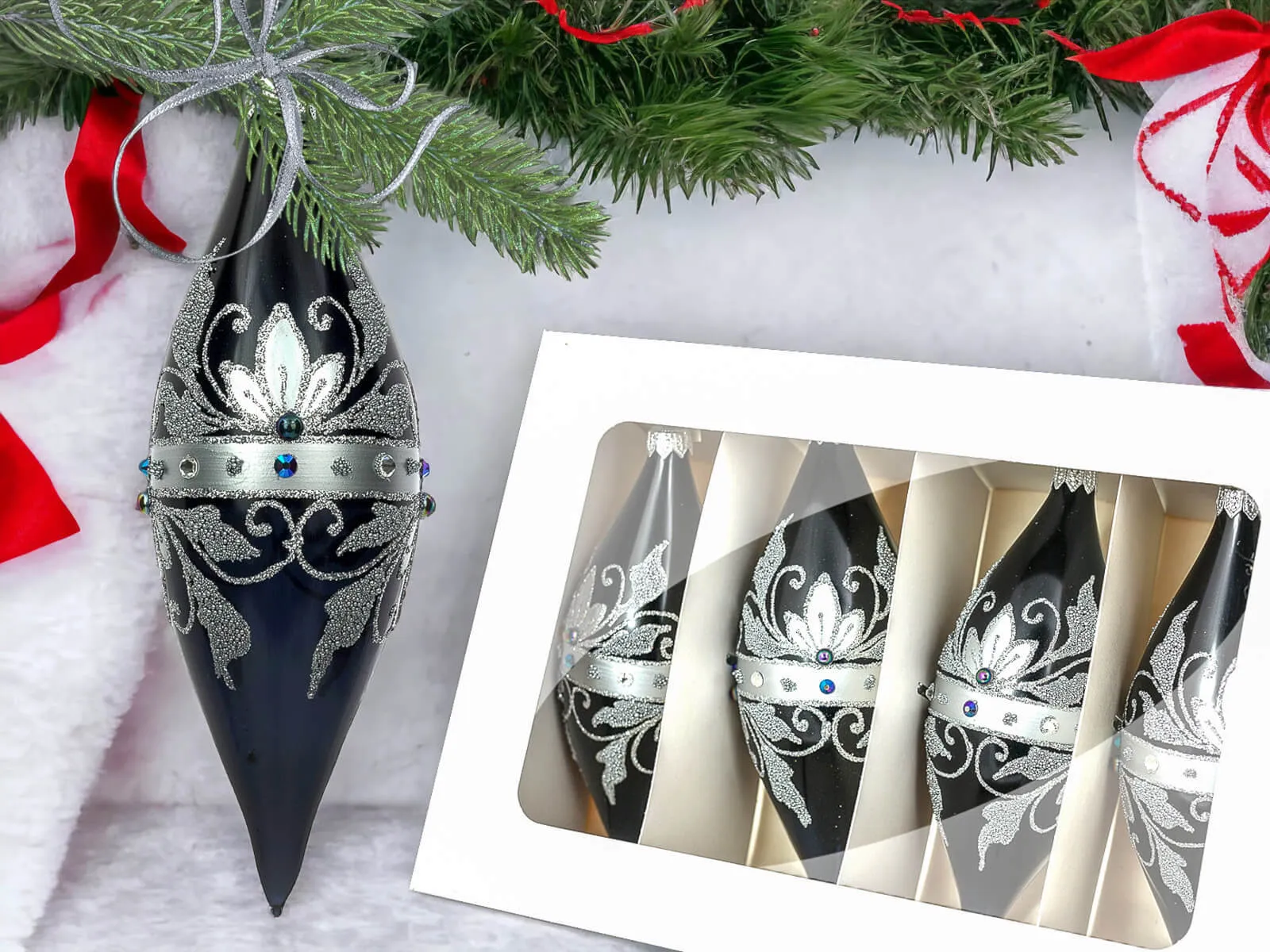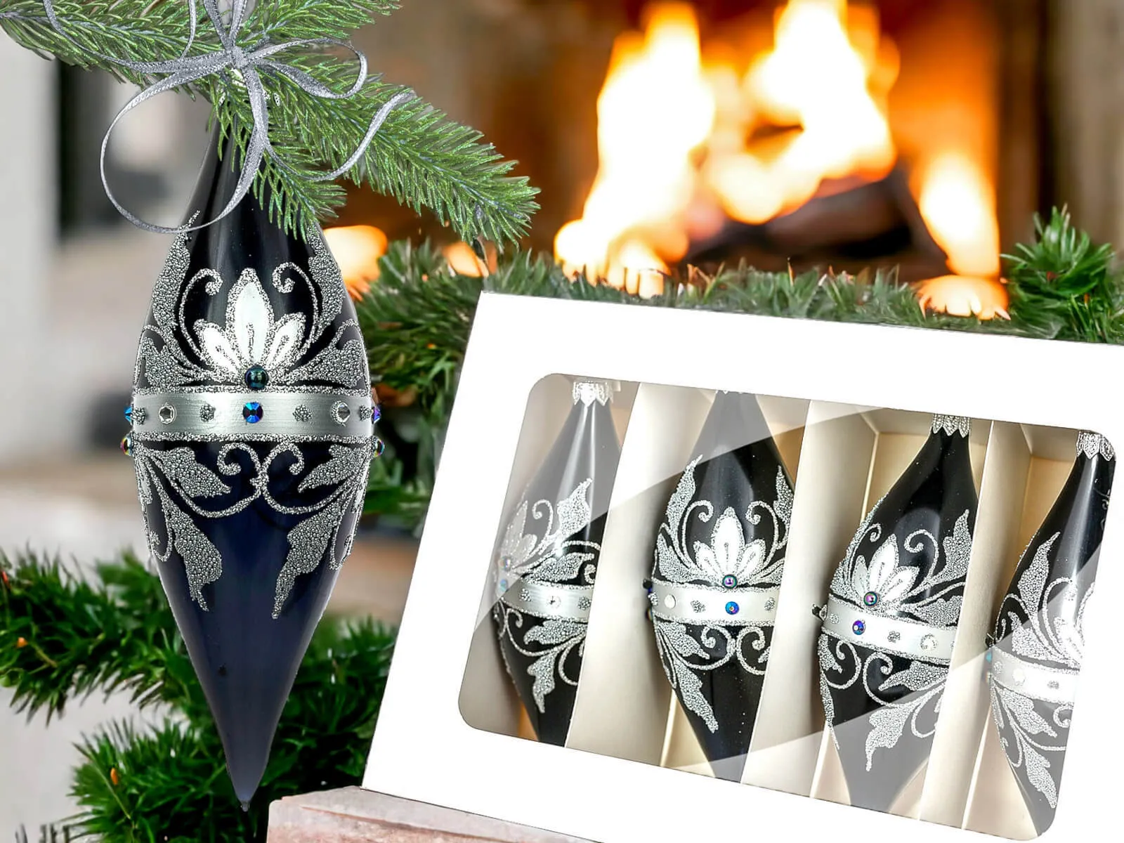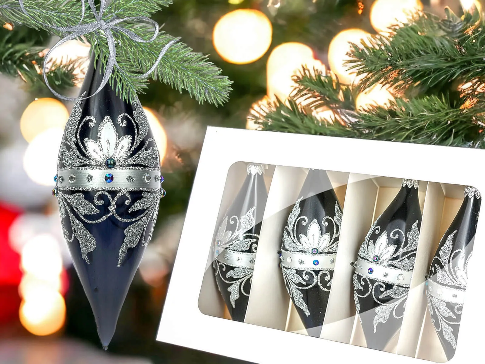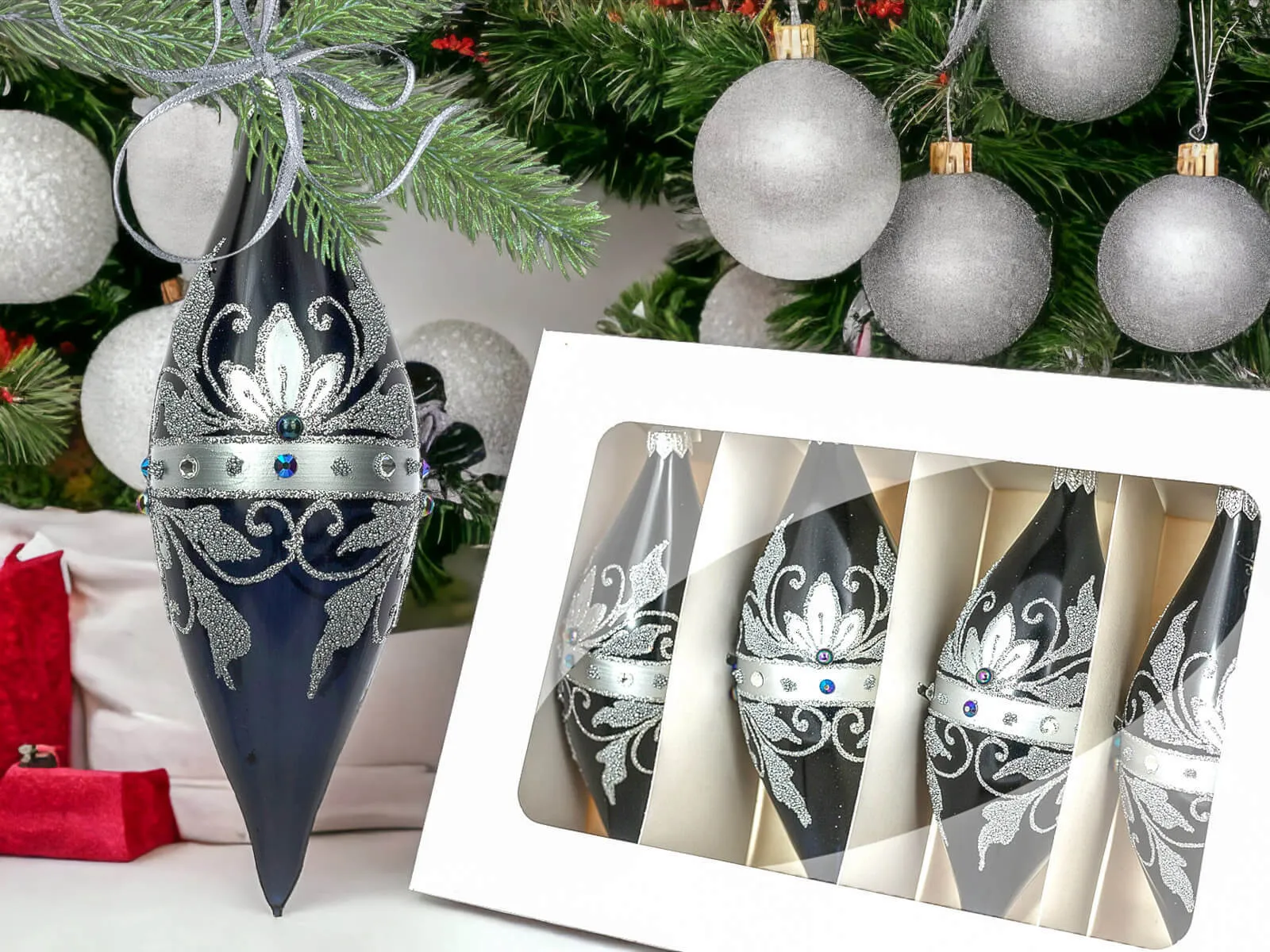 Komplet szklanych bombek choinkowych Królewskie Srebrne Sople na Czarnej Porcelanie to majestatyczna kolekcja, która łączy w sobie urok srebra, elegancję czarnej porcelany oraz błyszczący blask szlifowanych kamieni. Ręcznie robione i malowane bombki w formie sopli nadają świątecznej choince niepowtarzalny charakter.