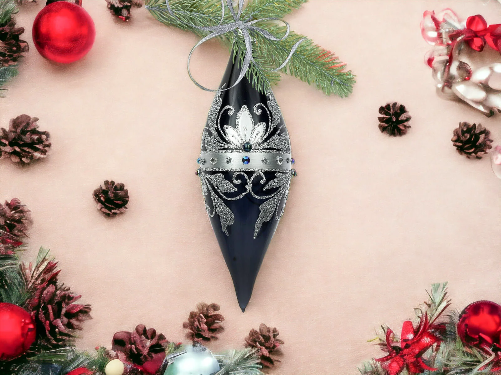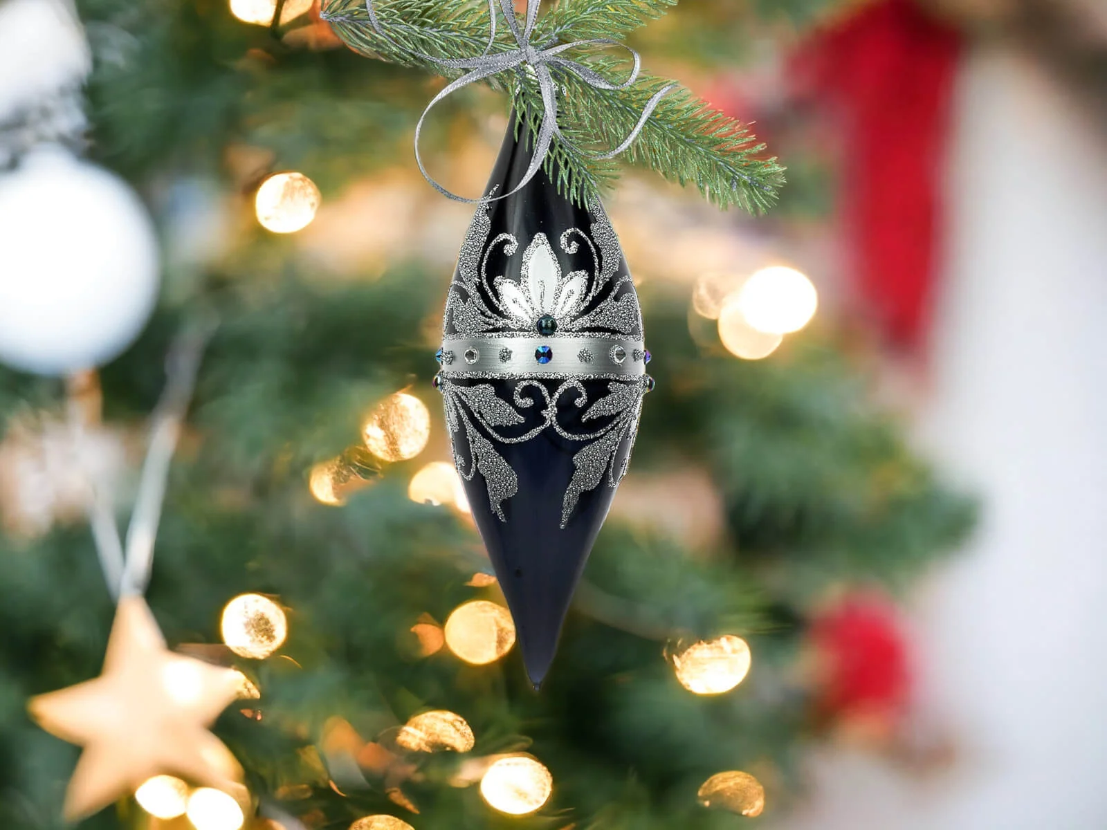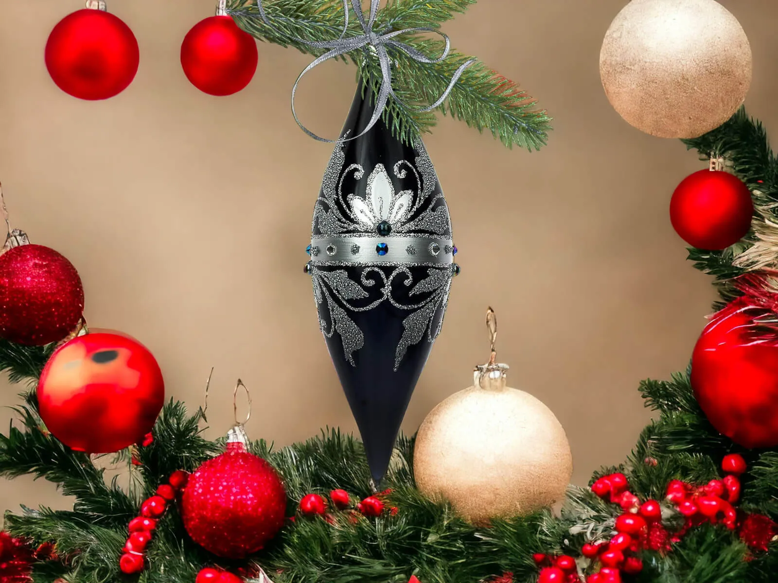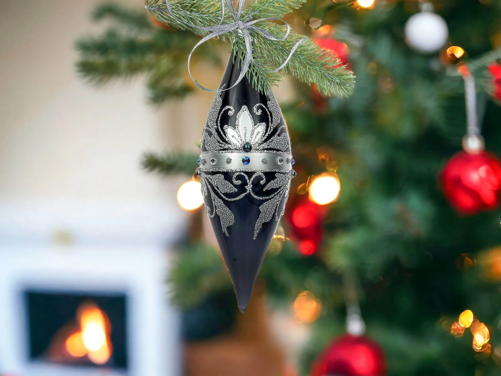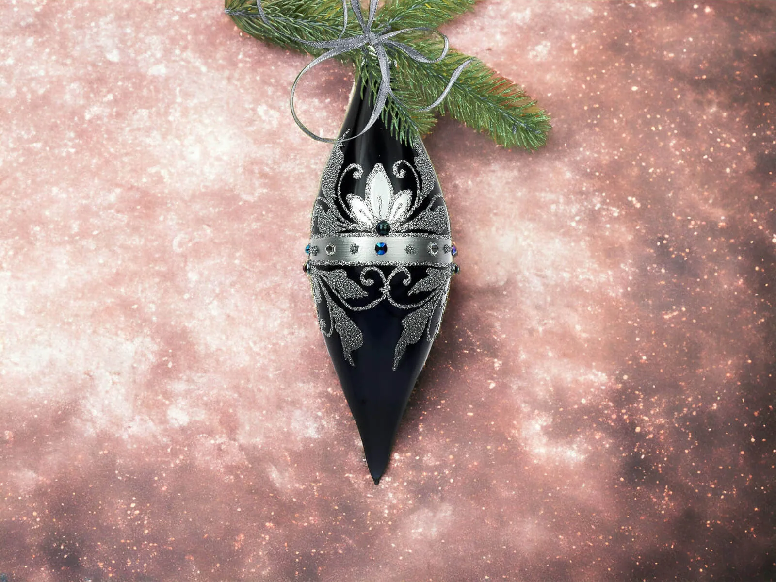 Komplet szklanych bombek choinkowych Królewskie Srebrne Sople na Czarnej Porcelanie to majestatyczna kolekcja, która łączy w sobie urok srebra, elegancję czarnej porcelany oraz błyszczący blask szlifowanych kamieni. Ręcznie robione i malowane bombki w formie sopli nadają świątecznej choince niepowtarzalny charakter.