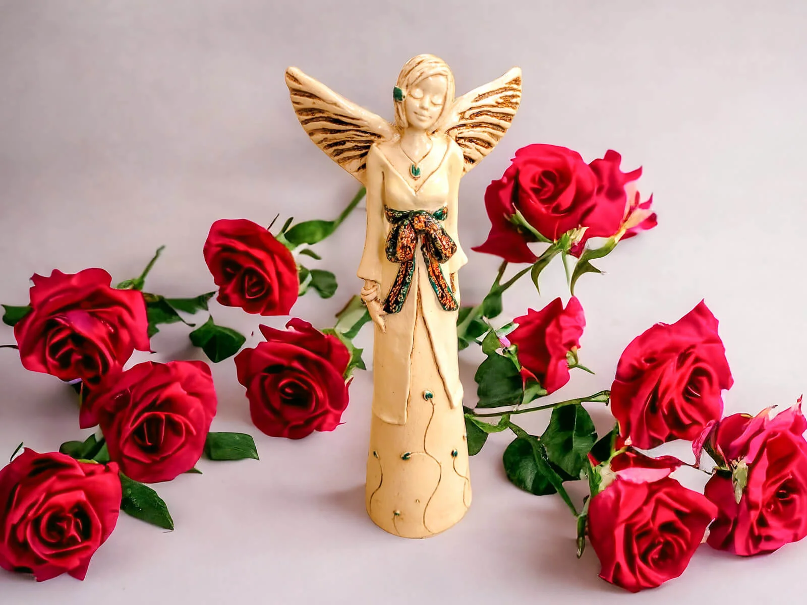 Anioł Lily w kolorze ecru. Uwielbia spędzać czas pośród kwiatów i drzew, ciesząc się nieskazitelnie czystym powietrzem i wsłuchując w śpiew ptaków. Może właśnie dlatego, że utożsamia się z naturą, po jej sukni pną się kwiaty, a pióra jej skrzydeł lekko rozwiewa wiatr. Na szyi ma talizman, więc figurka może stać się Twoim talizmanem - Lily będzie dbała o Twój wewnętrzny spokój i harmonię ducha.