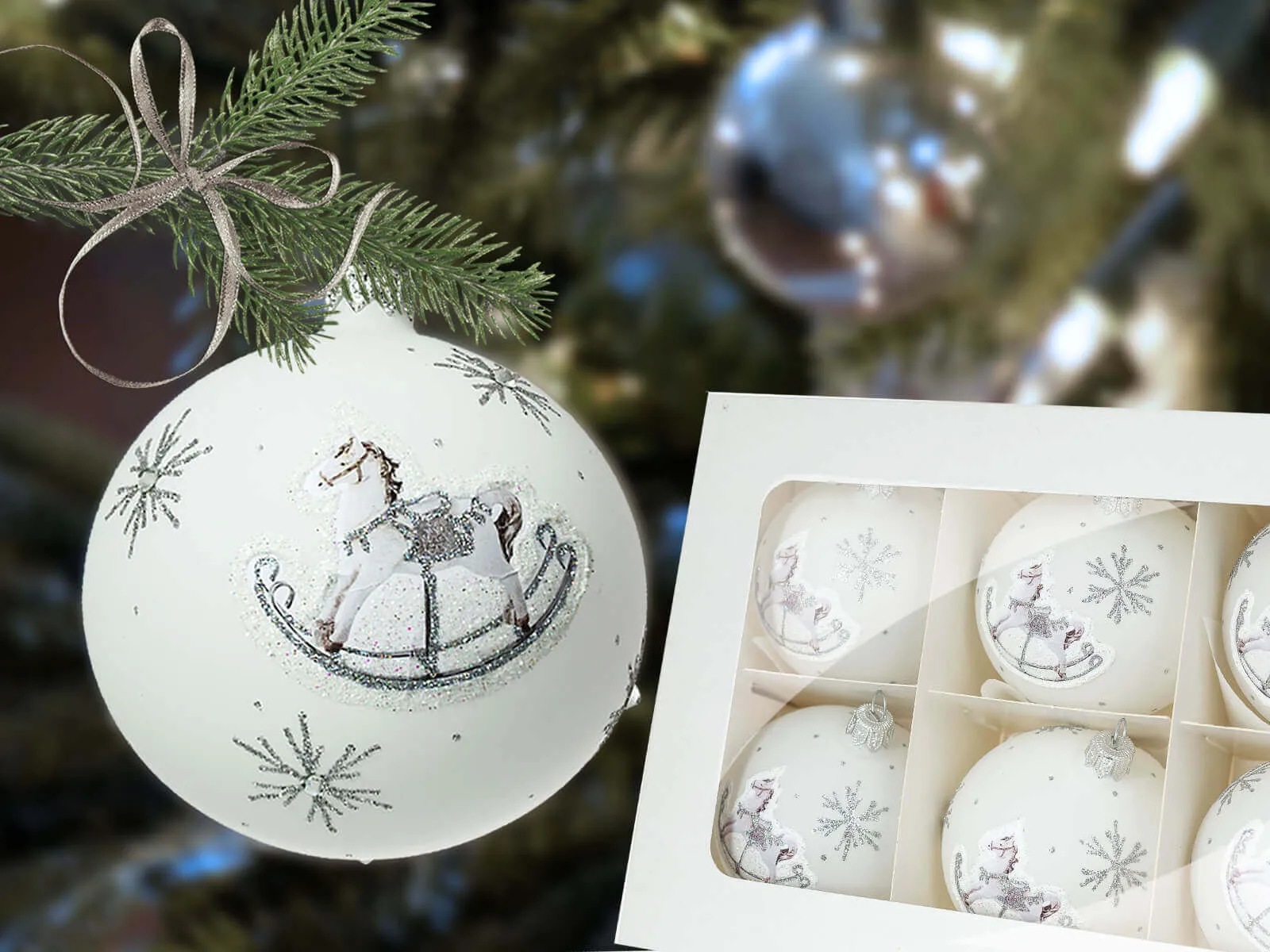 Zestaw składa się z 6 szklanych bombek w kolorze białej kredy z konikami na biegunach. Bombki są ręcznie malowane dzięki czemu wyróżniają się swoją oryginalnością. Mogą służyć jako prezent świąteczny dla dziadków lub rodziców lub najmnłodszych.