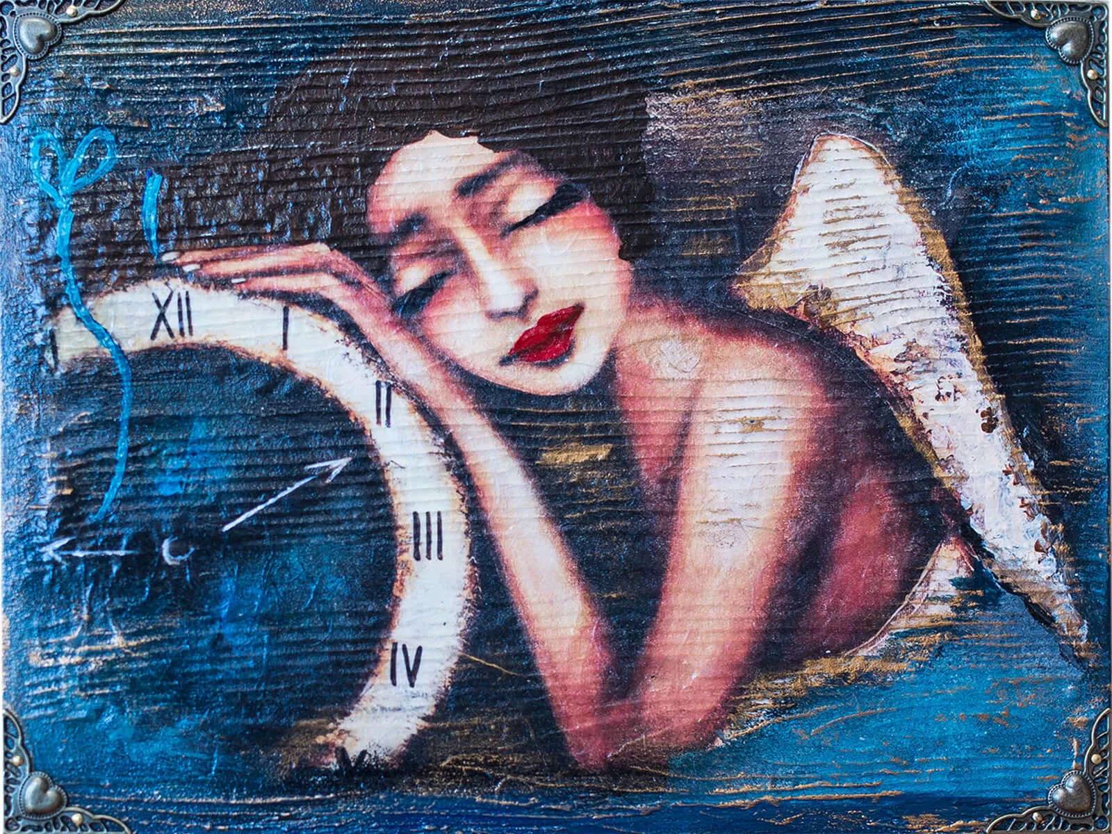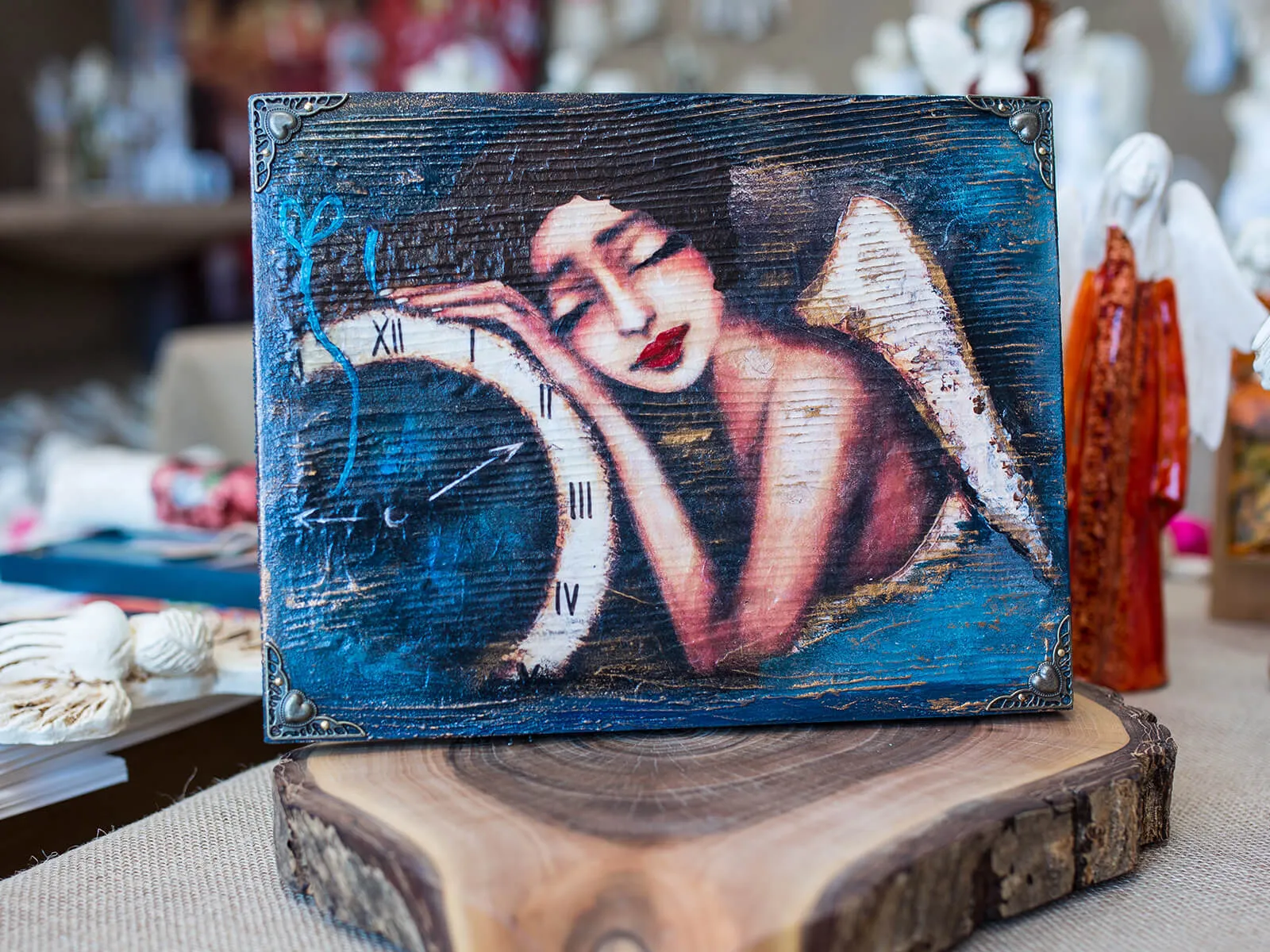 Obraz anioła o imieniu Karolina śpiąca nad zegarem. Obraz wykonany na desce w rozmiarze 22.5 x 29.5 cm z klamrami w rogach. Idealny na prezent