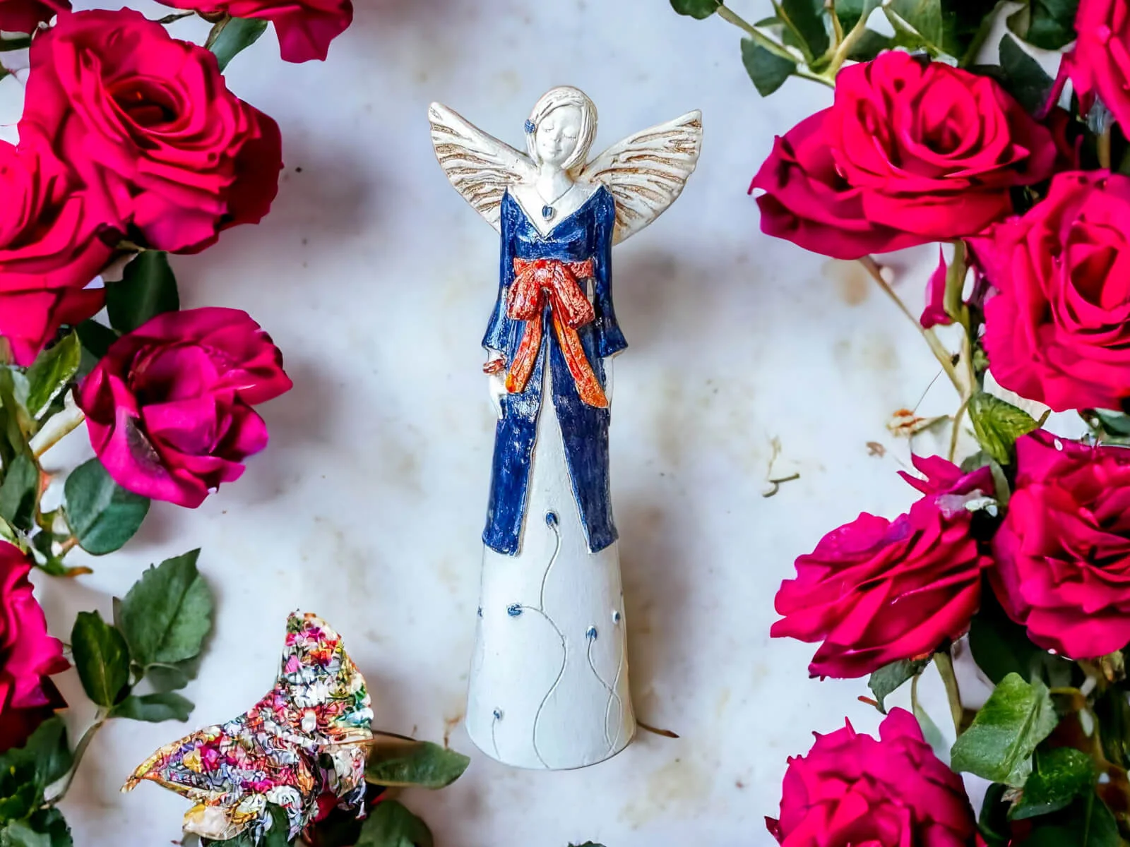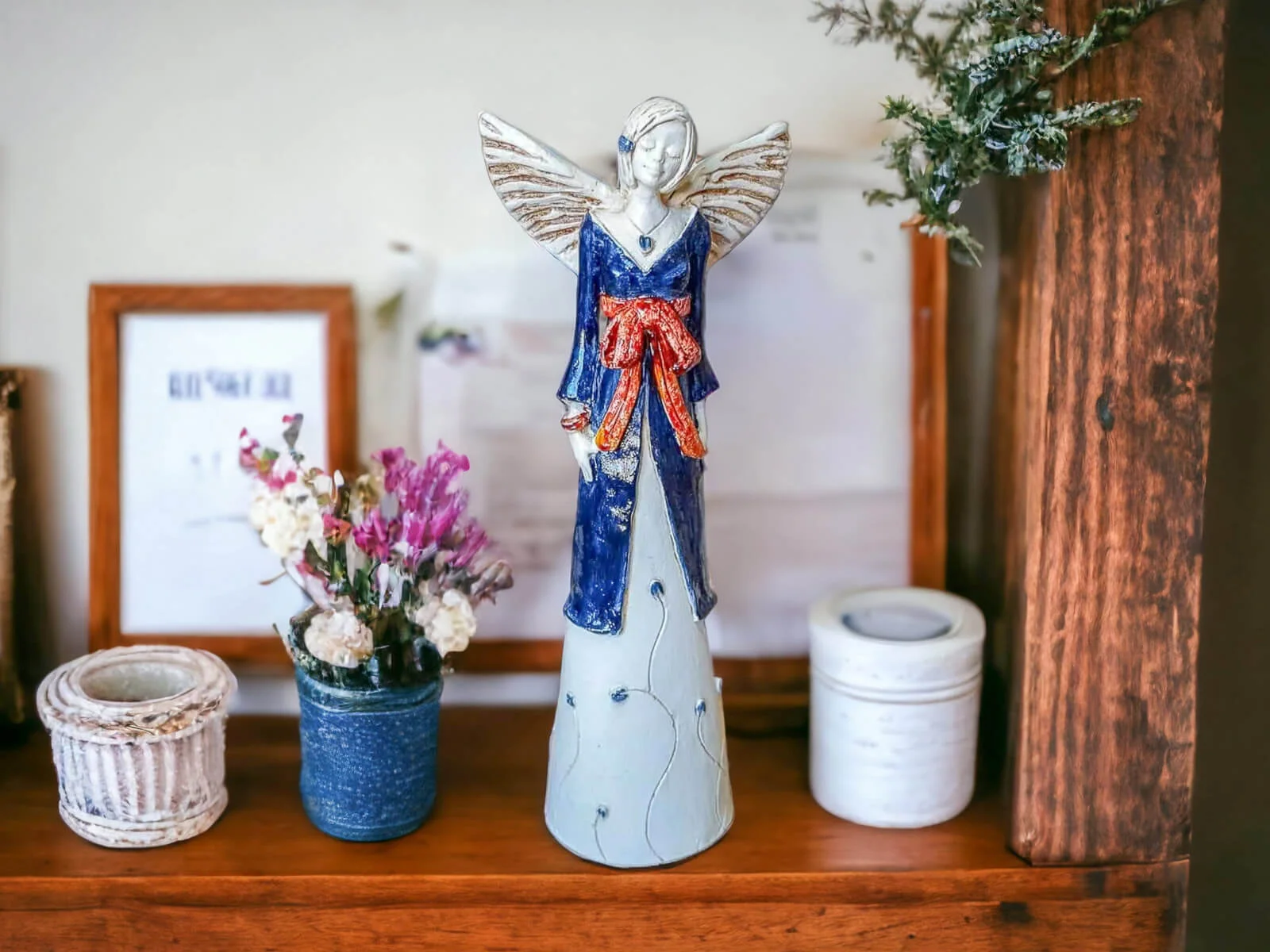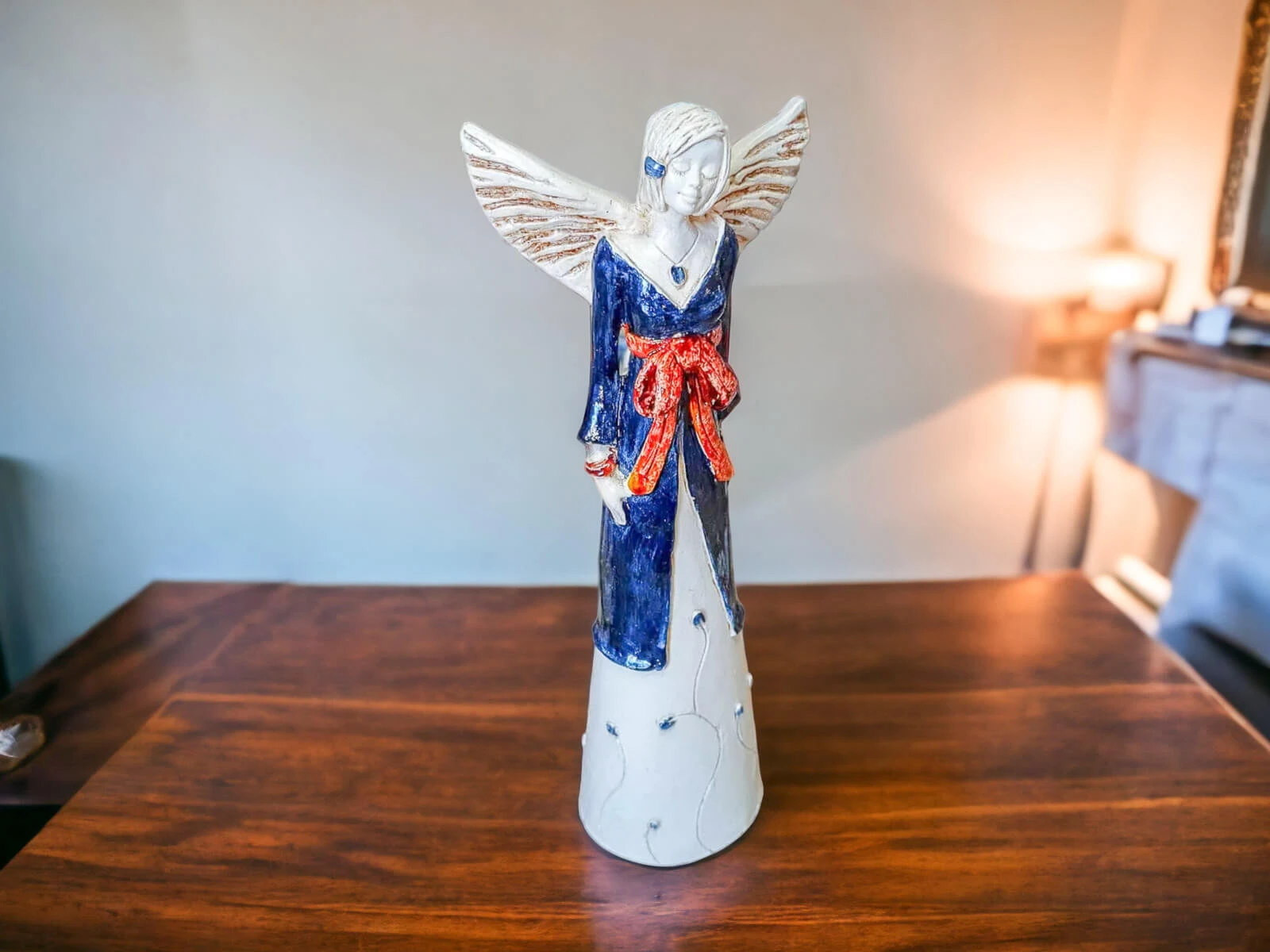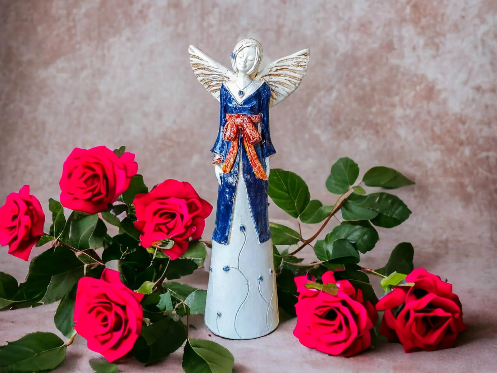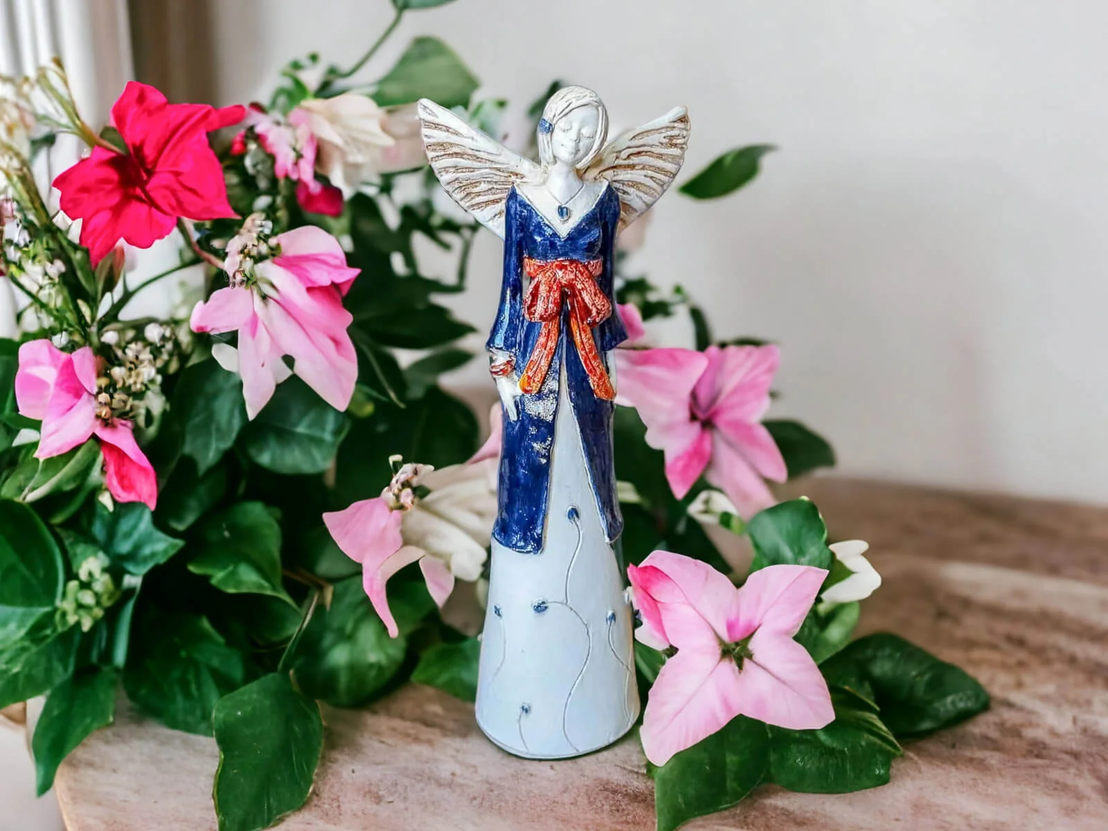 Anioł Lily w granatowej sukni z brązową szarfą jest przepiękną postacią o uspokajającym i kojącym wyrazie twarzy. Jej delikatne skrzydła dopełniają jej idylliczny charakter. Ma na sobie granatową suknię, po której pną się kwiaty. Figurka jest bardzo uniwersalna. Sprawdzi się bowiem jako prezent z wielu okazji, a przy tym będzie pięknym akcentem w każdym mieszkaniu.