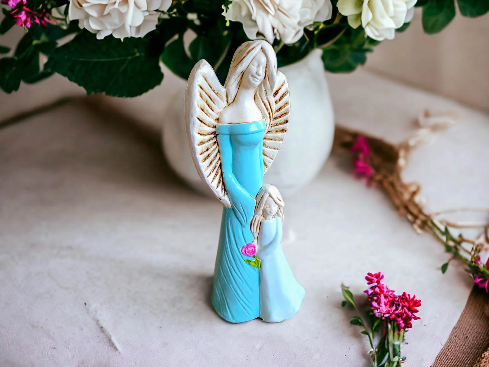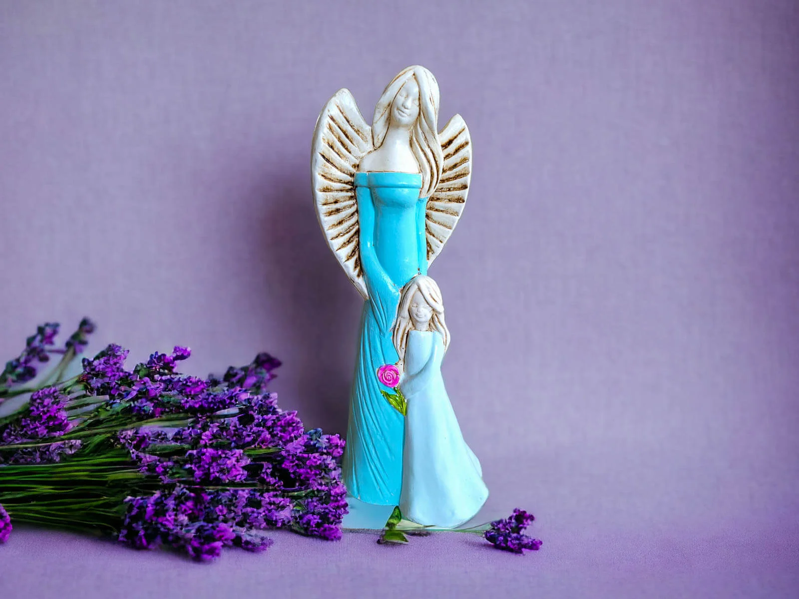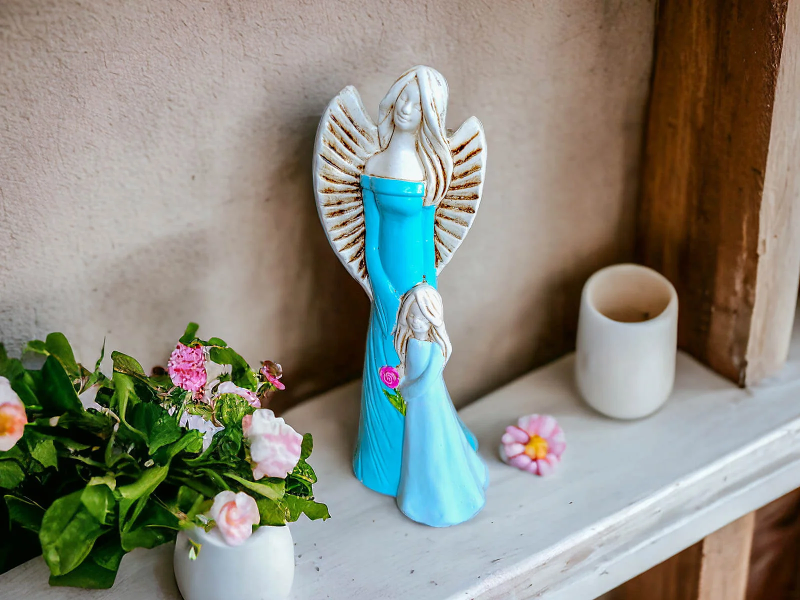 Figurka przedstawiająca Hannah w błękitnej sukni i Evelyn w seledynowej sukni to piękny obraz rodzicielskiej miłości. Symbolizuje matczyną opiekę nad dzieckiem. Skrzydła są oznaką troski, można z nich wyczytać, że matka jest dla swojego dziecka aniołem stróżem, który nie pozwoli, aby dziecku stała się krzywda. Figurka może być pięknym prezentem z okazji dnia matki, w ramach podziękowania jej za trud włożony w wychowanie i opiekę. Sprawdzi się również jako podarunek z okazji chrztu czy I Komunii Świętej np. od matki chrzestnej.