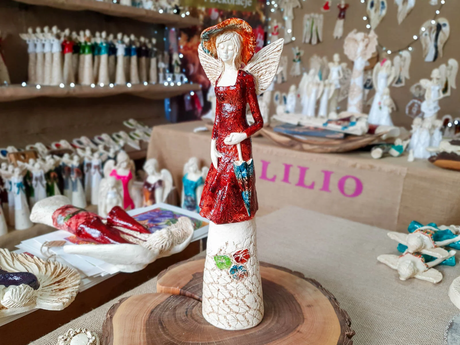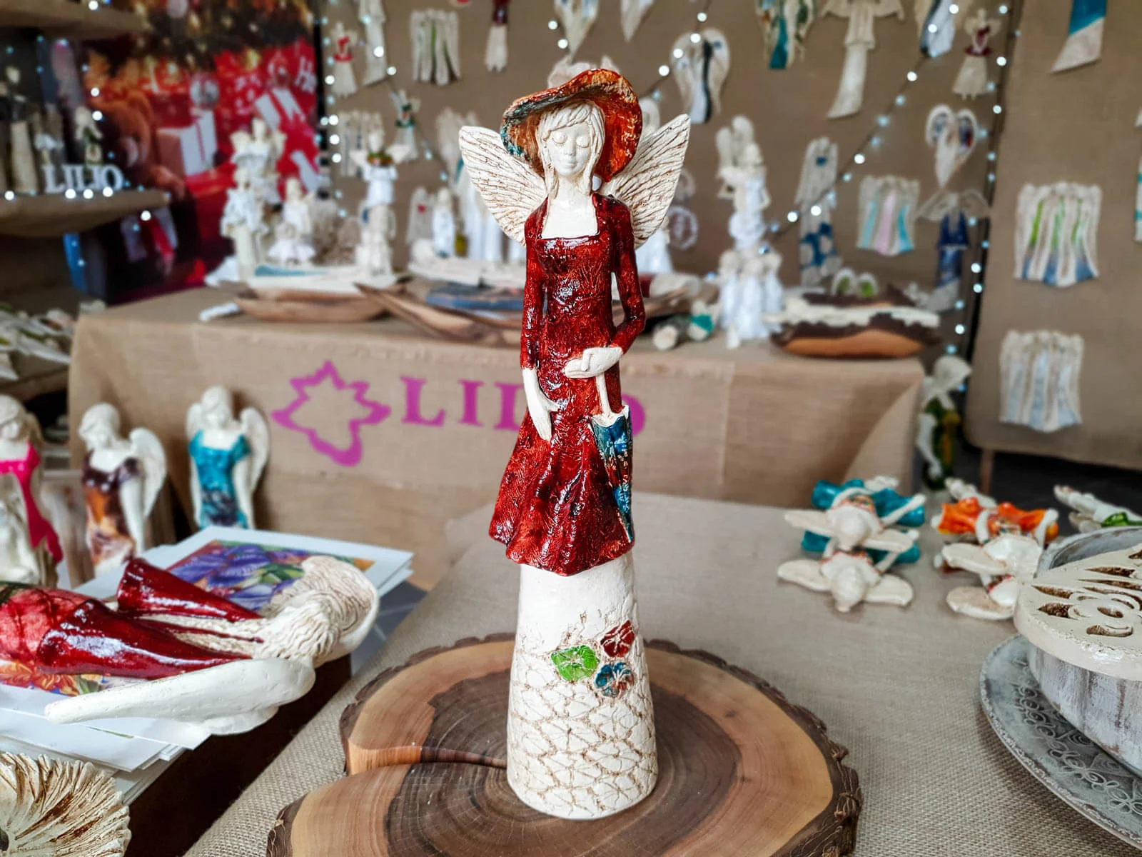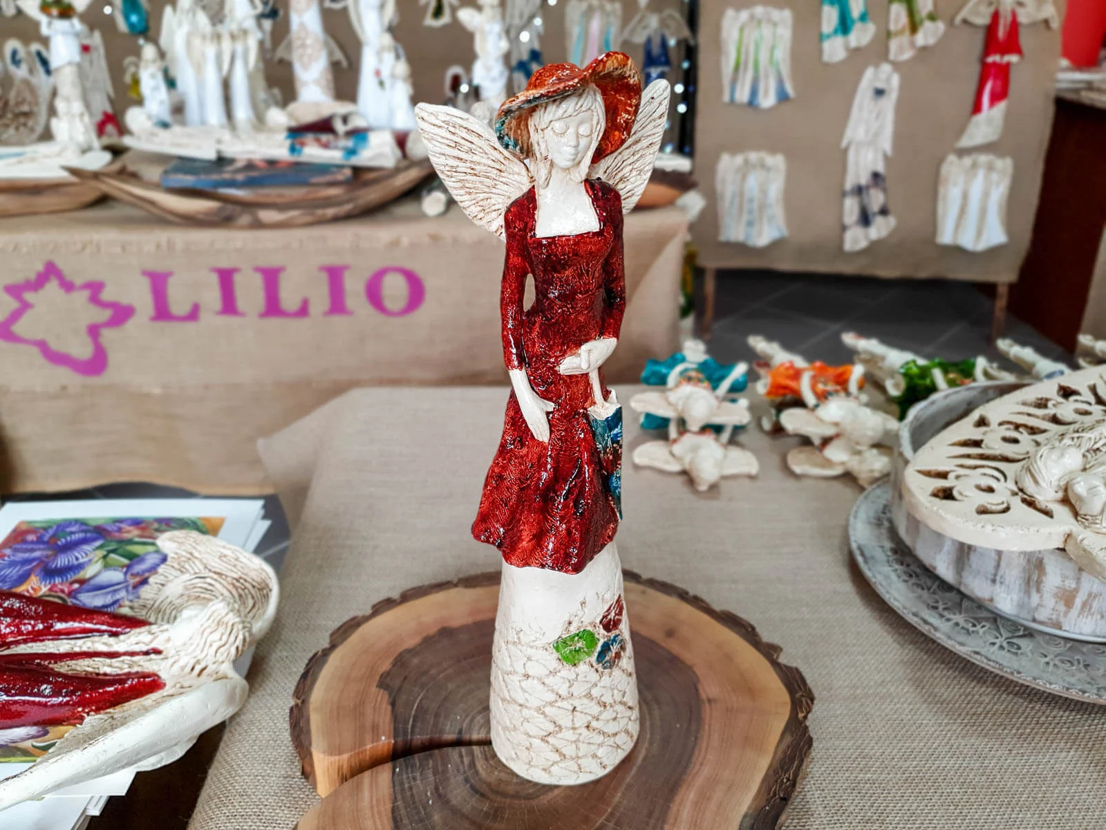 Anioł Olivia w brązowej sukni to dekoracja stojąca, ręcznie wykonana z gipsu. Anioł ma krótkie, jasne włosy, a w lewej dłoni trzyma parasol. Z tyłu wystają małe skrzydła. Figurka pięknie zaprezentuje sie w stylowym wnętrzu np. w salonie. Idealnie nadaje się na prezent dla osoby, która lubi oryginalność.