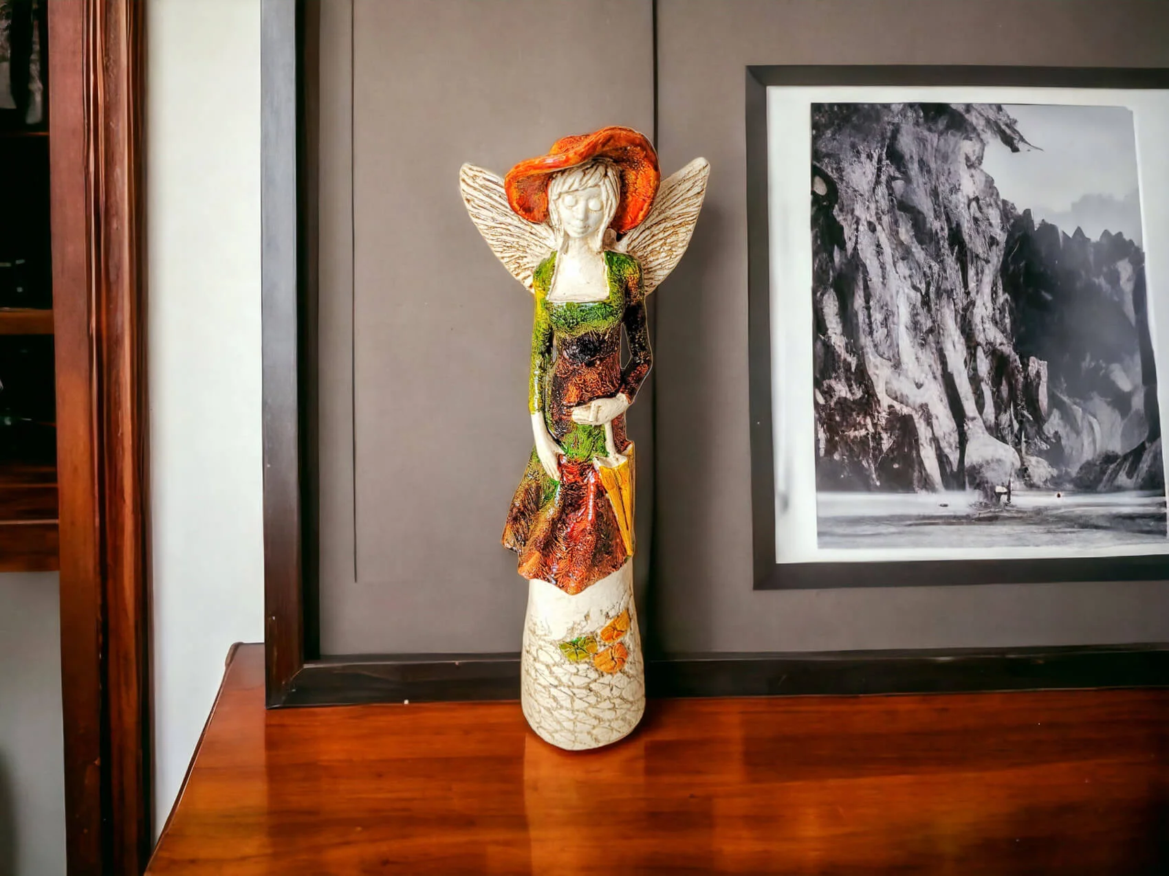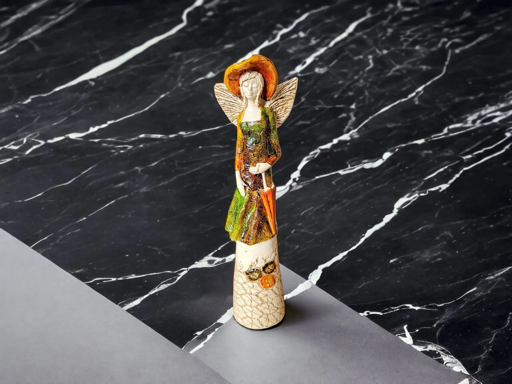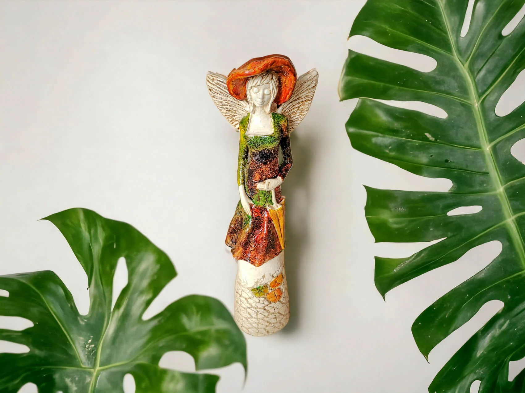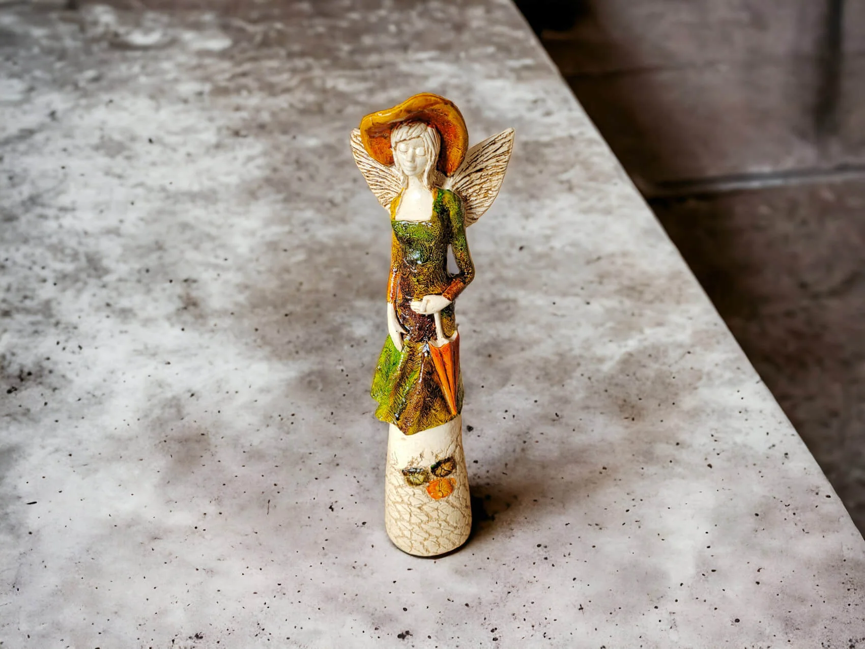 Anioł Olivia w brązowo zielonej sukni to dekoracja stojąca, ręcznie wykonana z gipsu. Anioł ma krótkie, jasne włosy, a w lewej dłoni trzyma parasol. Z tyłu wystają małe skrzydła. Figurka pięknie zaprezentuje sie w stylowym wnętrzu np. w salonie. Idealnie nadaje się na prezent dla osoby, która lubi oryginalność.