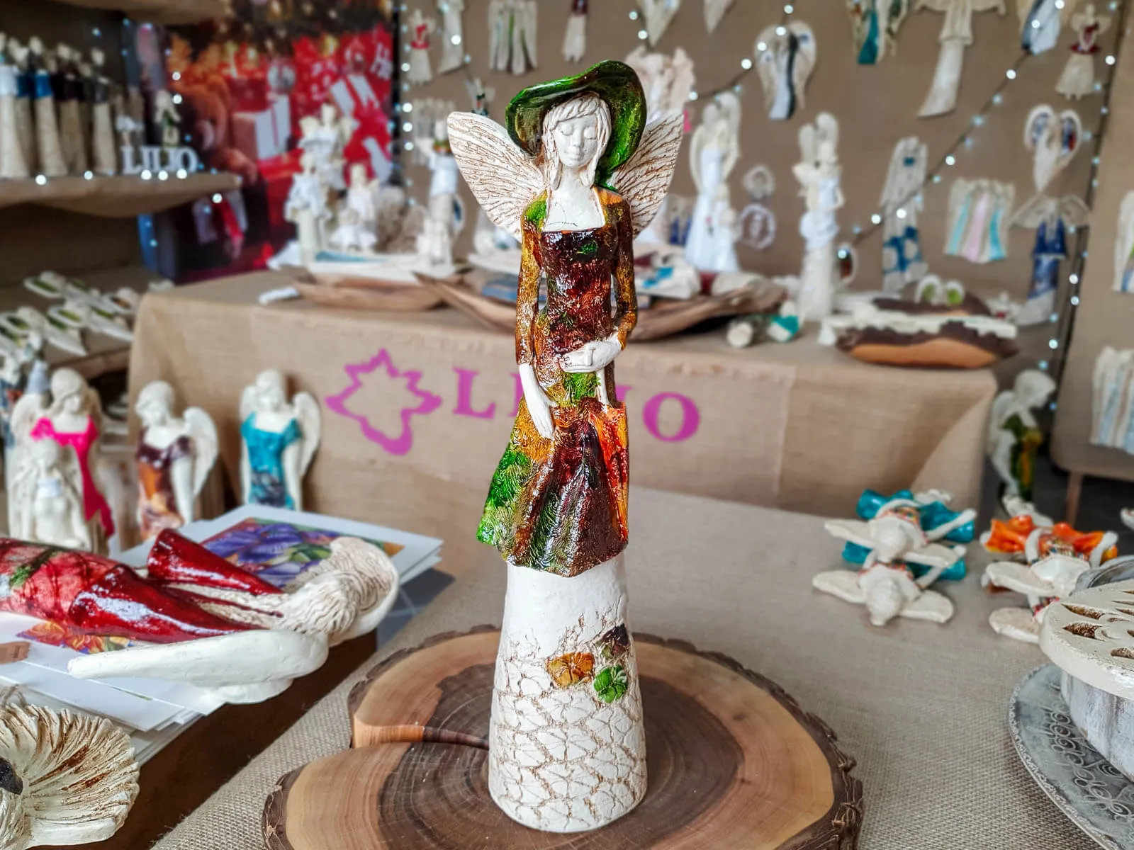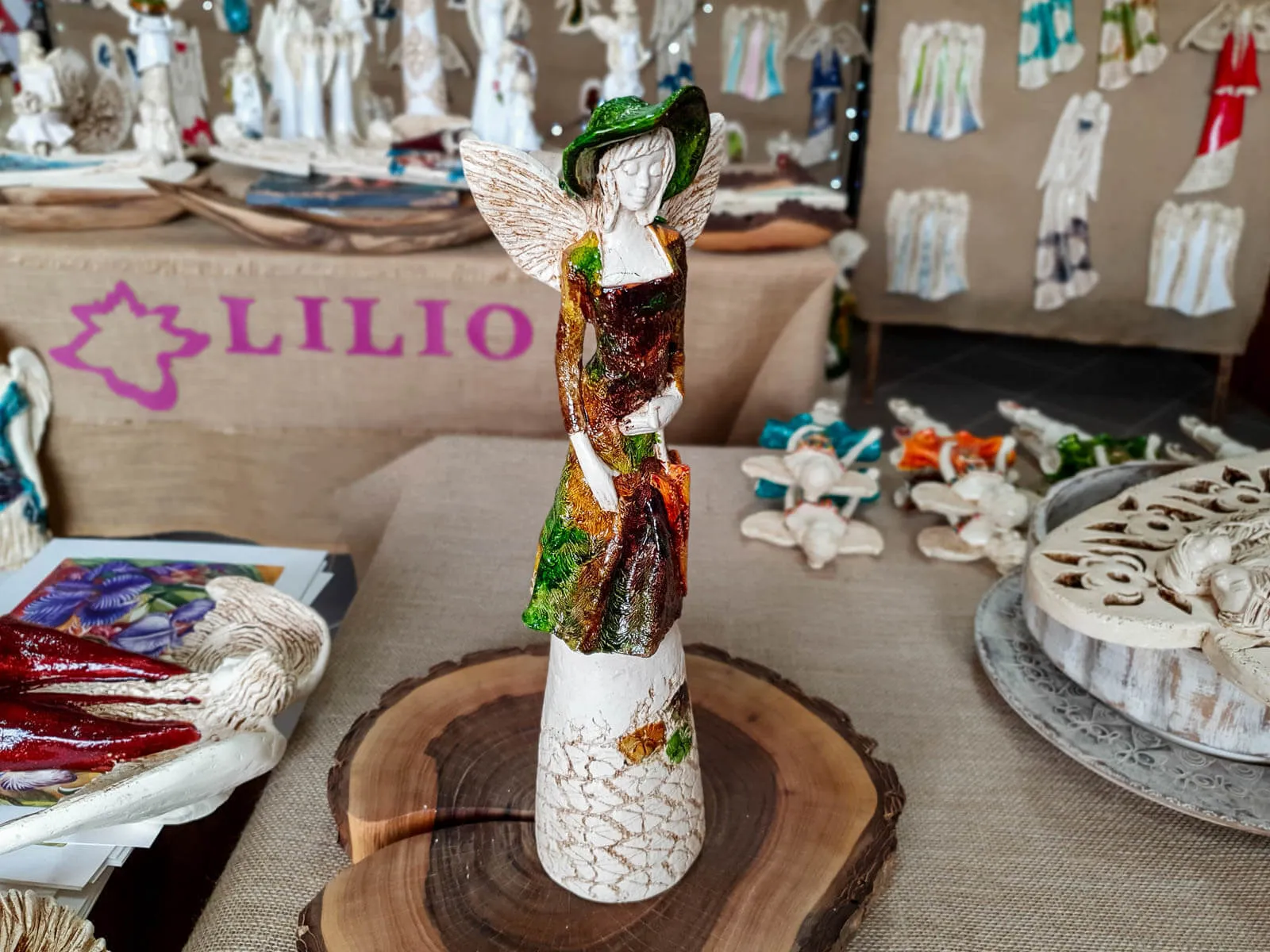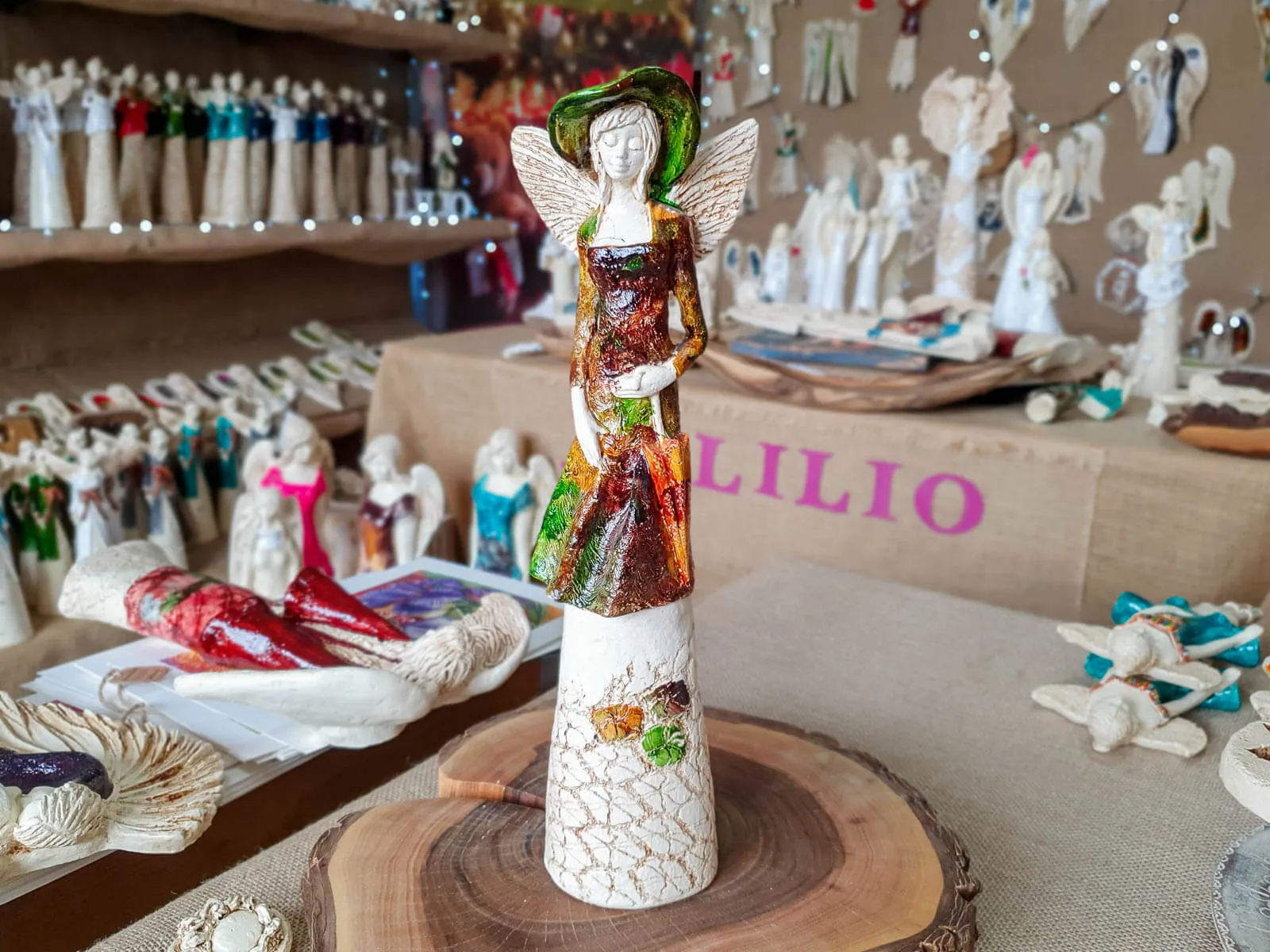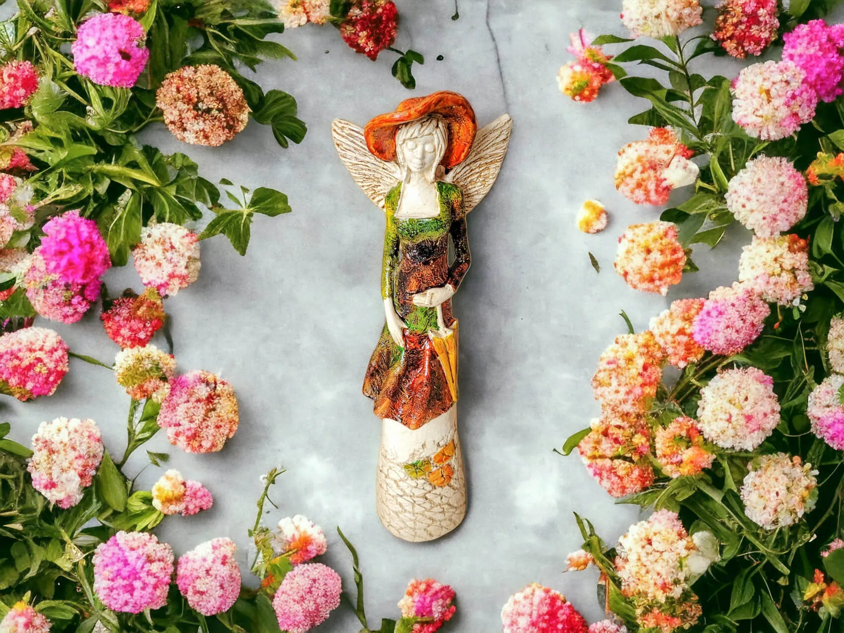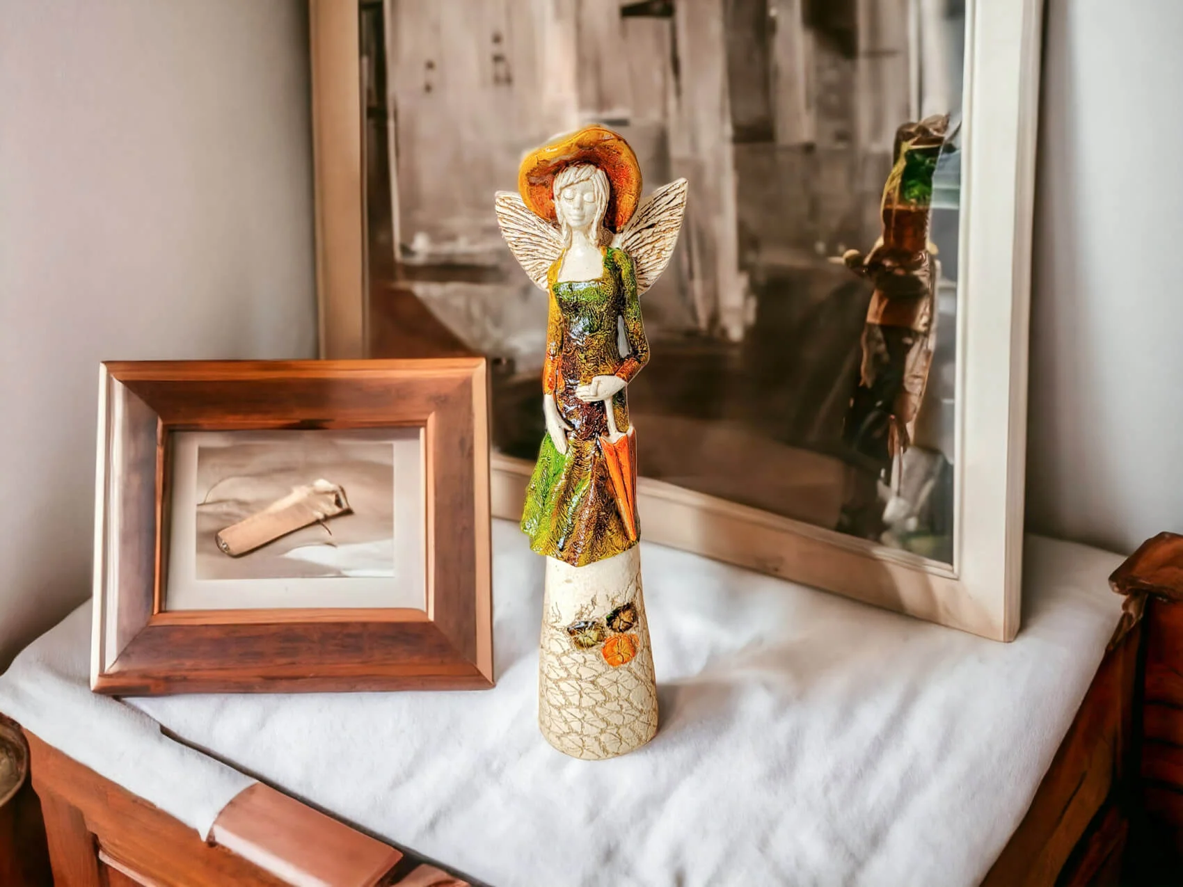 Anioł Olivia w brązowo zielonej sukni to dekoracja stojąca, ręcznie wykonana z gipsu. Anioł ma krótkie, jasne włosy, a w lewej dłoni trzyma parasol. Z tyłu wystają małe skrzydła. Figurka pięknie zaprezentuje sie w stylowym wnętrzu np. w salonie. Idealnie nadaje się na prezent dla osoby, która lubi oryginalność.