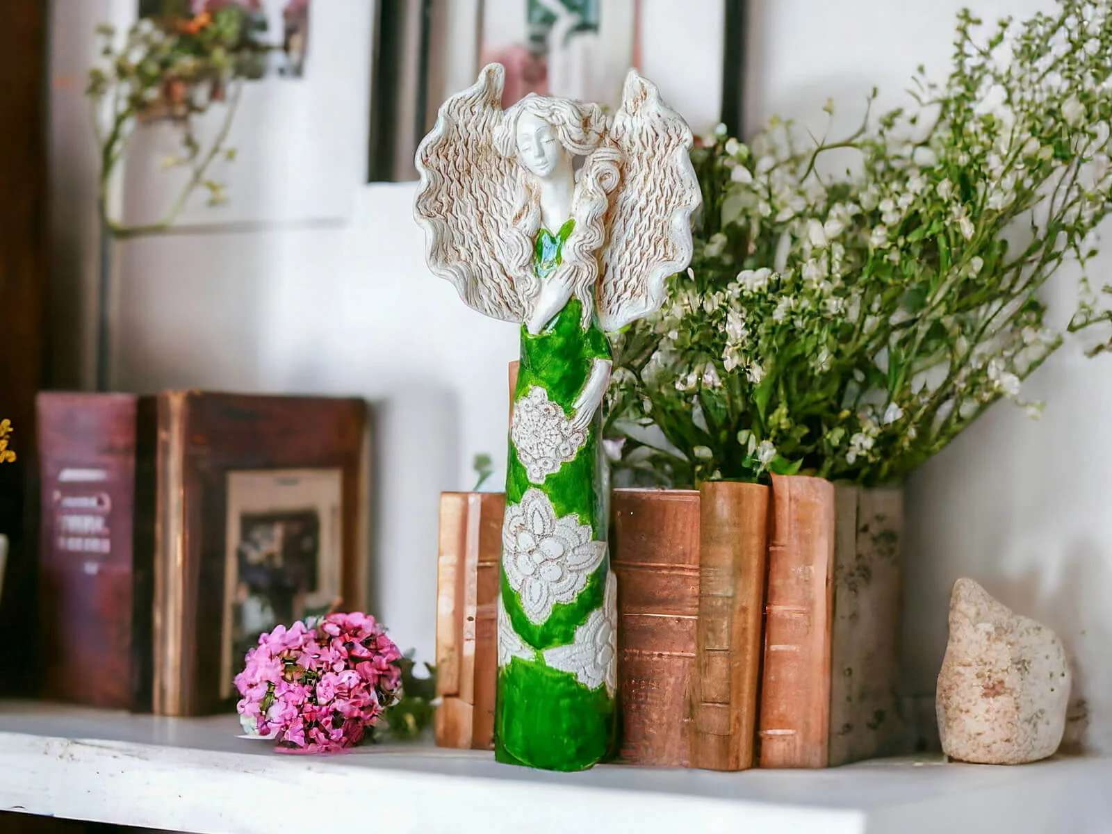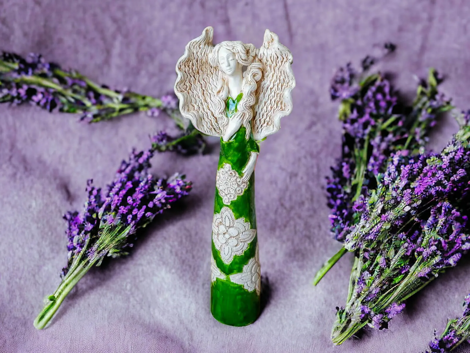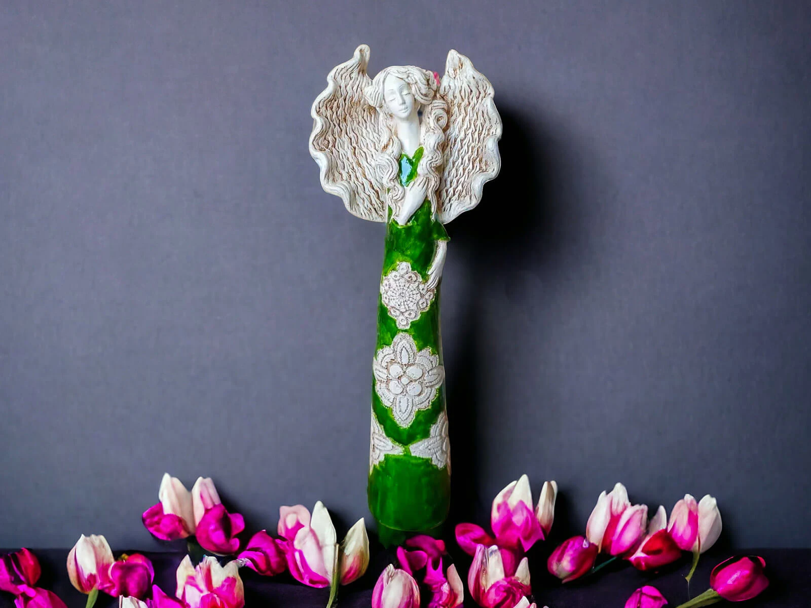 Anioł Madelyn przedstawia kobietę z długimi kręconymi włosami w zielonej wiosennej sukni. Ma duże skrzydła skierowane ku górze oraz prawą dłoń na piersi. Jest figurką stojącą, wykonaną ręcznie z gipsu. Nadaje się na ozdobę do salonu ale też doskonale będzie czuć się w sypialni. Może służyć jako prezent na Dzień Kobiet, Walentynki, a także na Dzień Mamy i Dzień Babci.