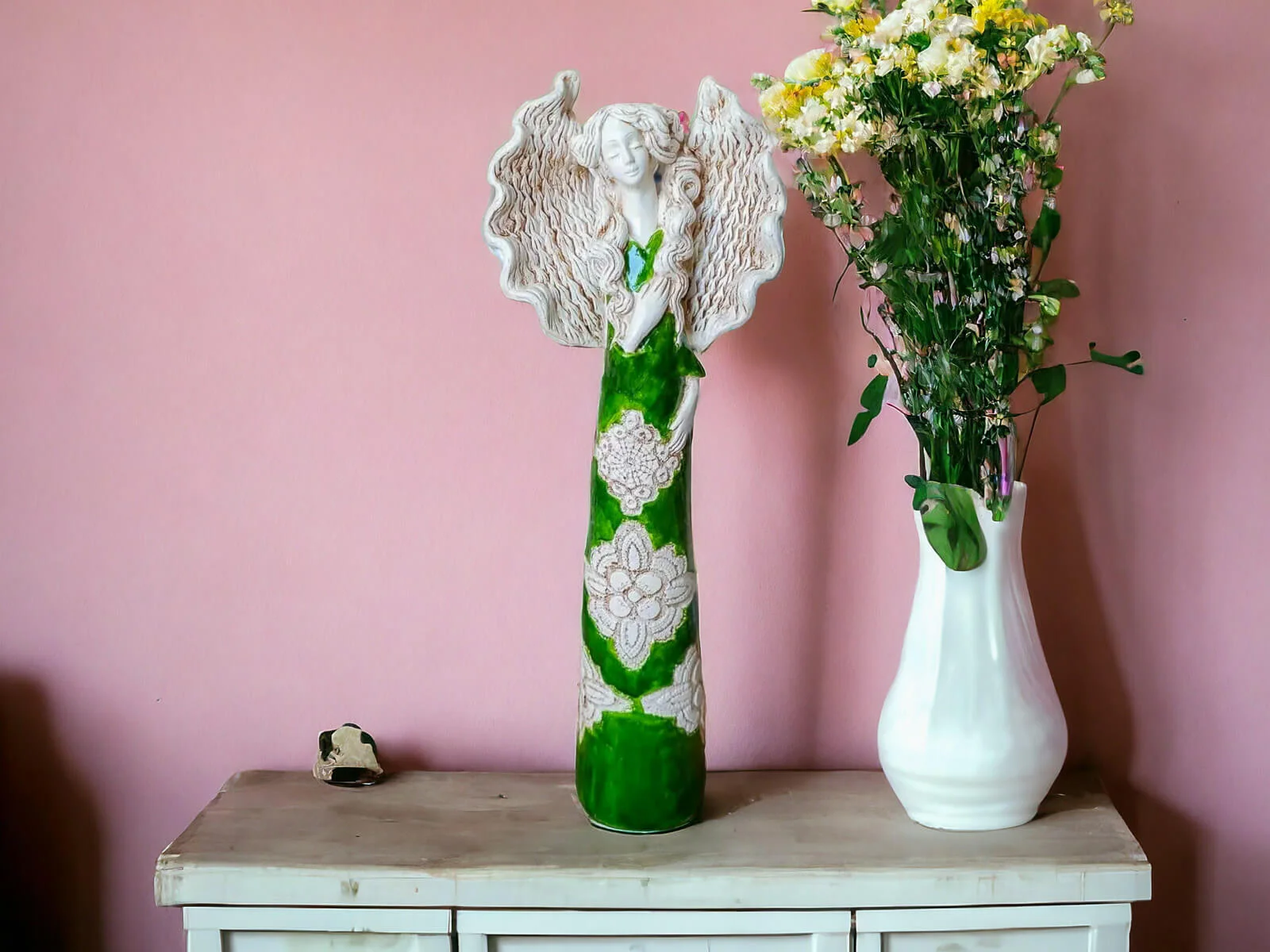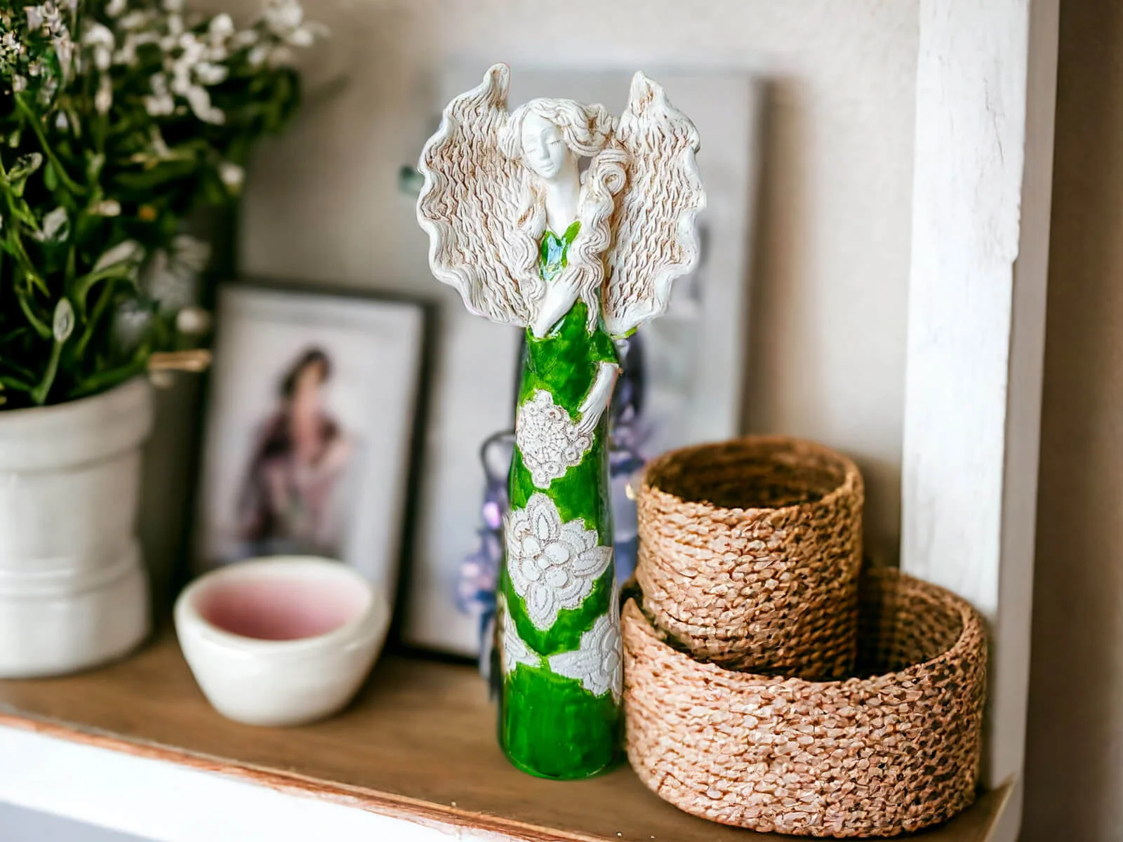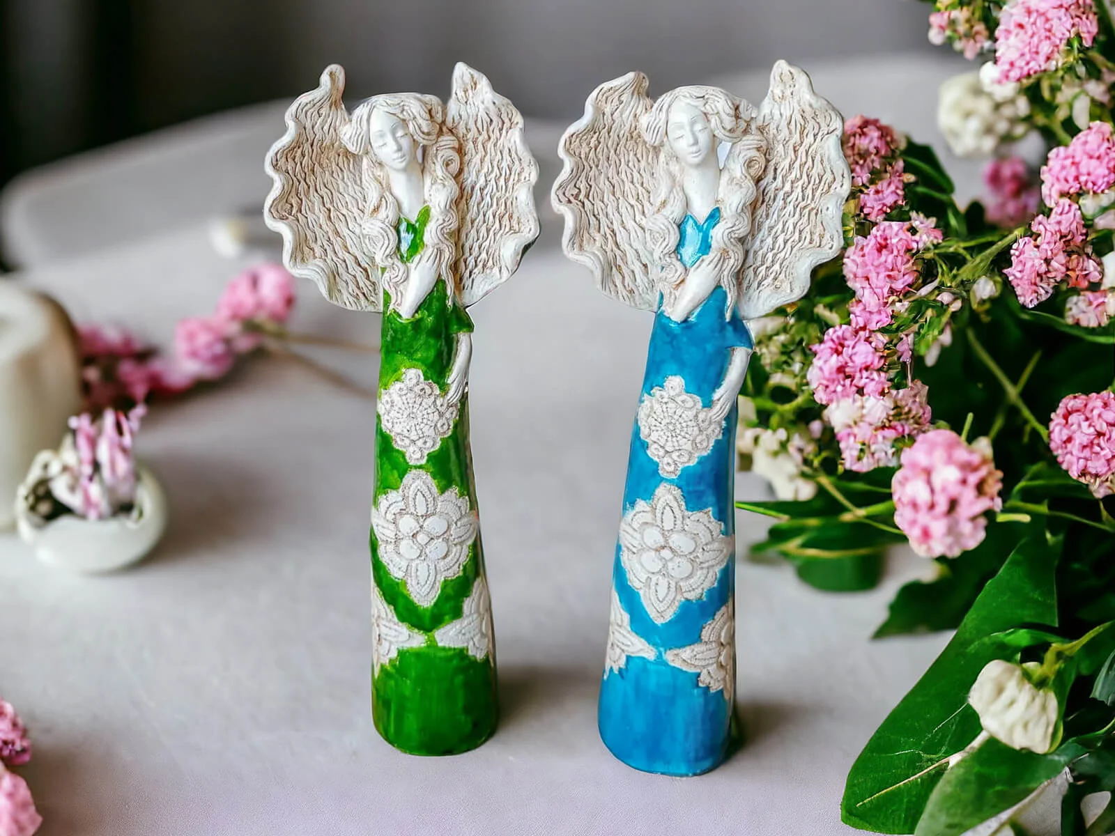 Anioł Madelyn przedstawia kobietę z długimi kręconymi włosami w zielonej wiosennej sukni. Ma duże skrzydła skierowane ku górze oraz prawą dłoń na piersi. Jest figurką stojącą, wykonaną ręcznie z gipsu. Nadaje się na ozdobę do salonu ale też doskonale będzie czuć się w sypialni. Może służyć jako prezent na Dzień Kobiet, Walentynki, a także na Dzień Mamy i Dzień Babci.