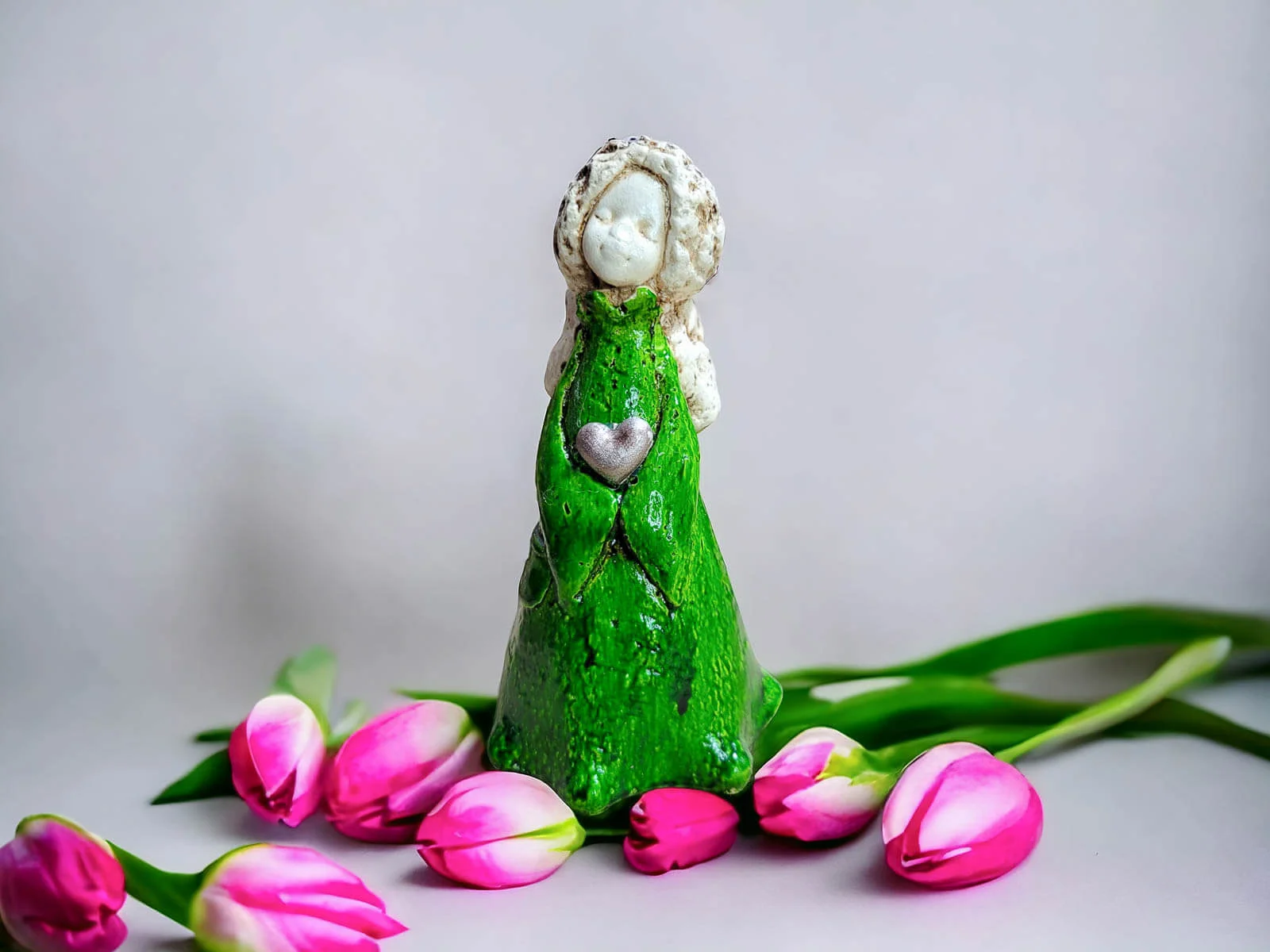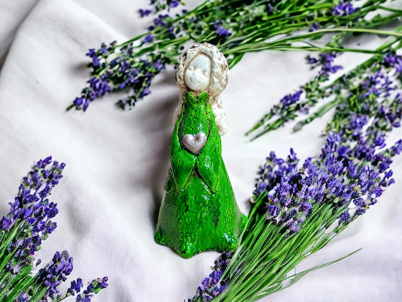 Słodka figurka aniołka Maryann w kolorze zielonym z sercem. Aniołek idealny na prezent.